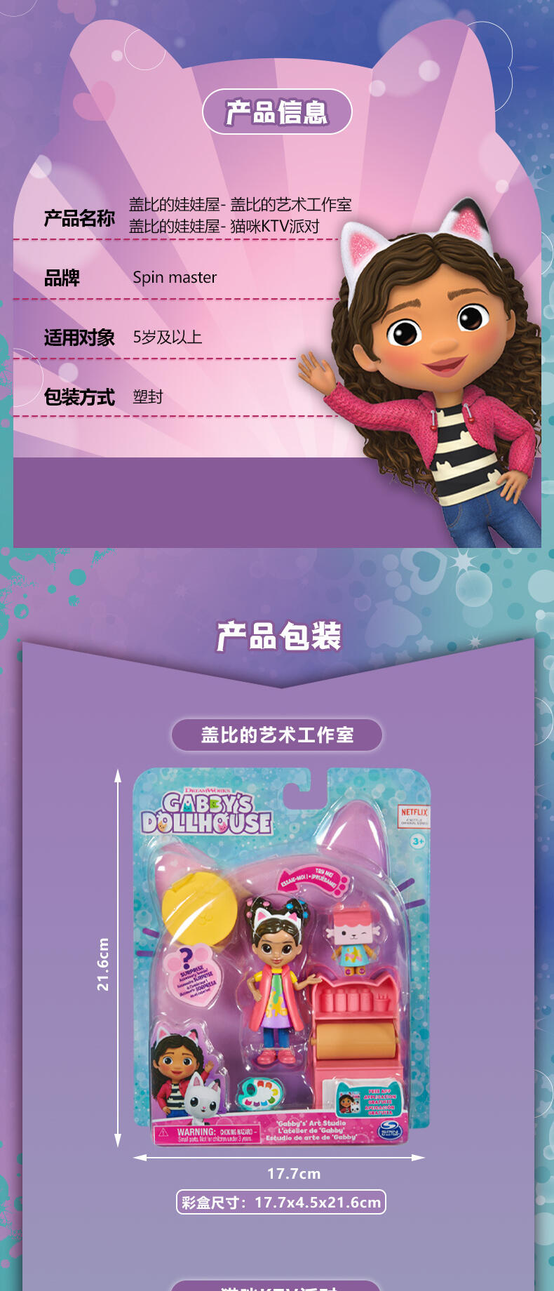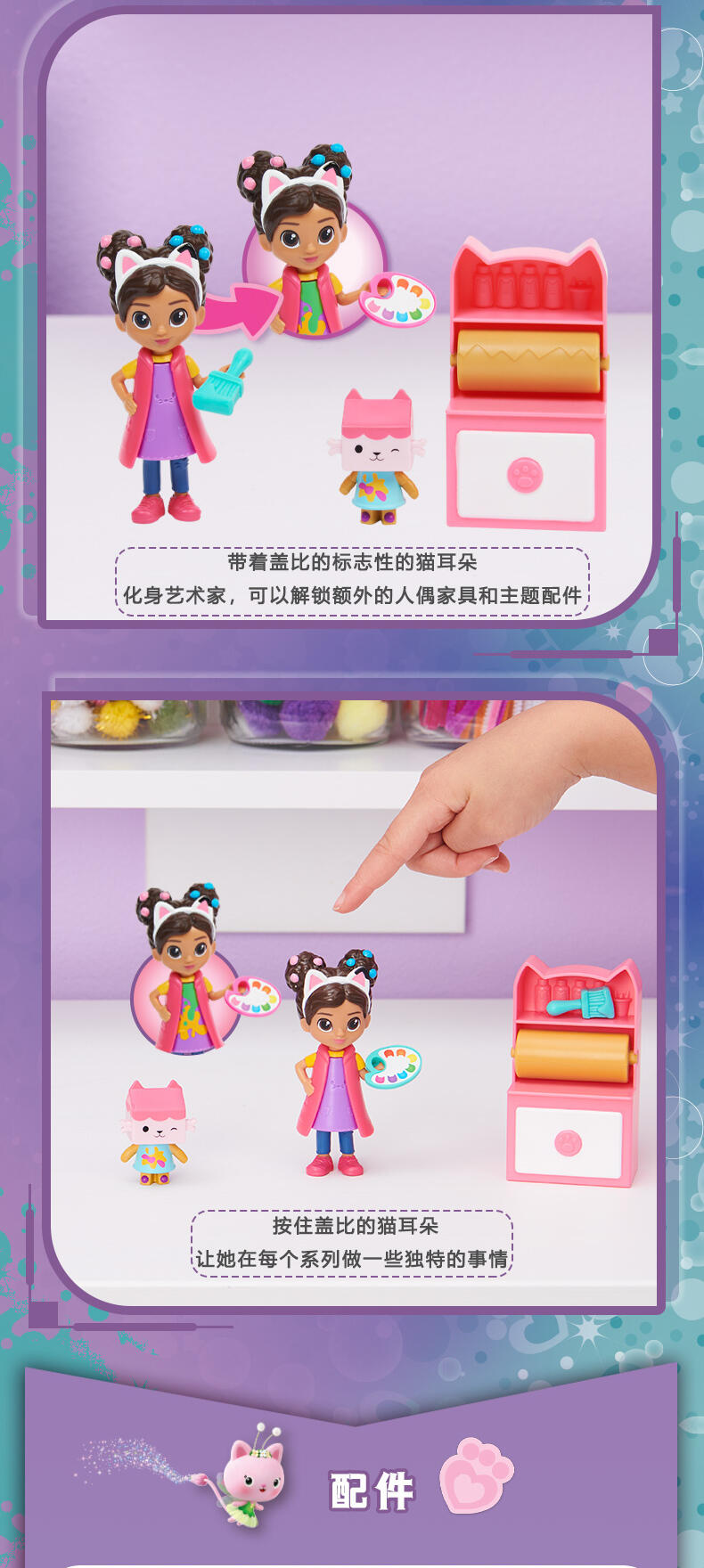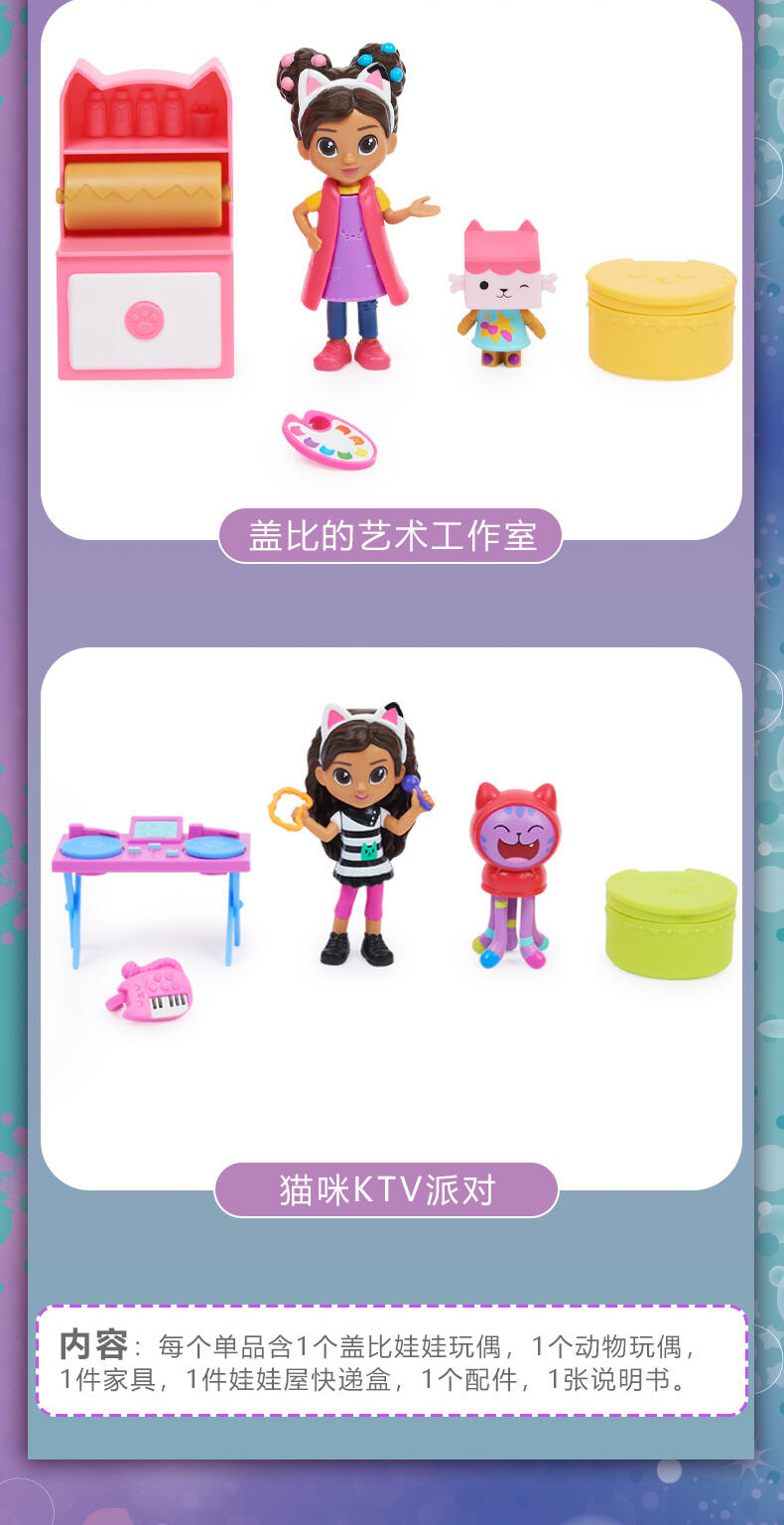 这些有趣的玩具套装包括一个3.8英寸的Gabby Girl收藏人偶、一个额外的动物人偶、家具和一个主题配件,以及一个里面有惊喜配件的玩偶屋快递盒!