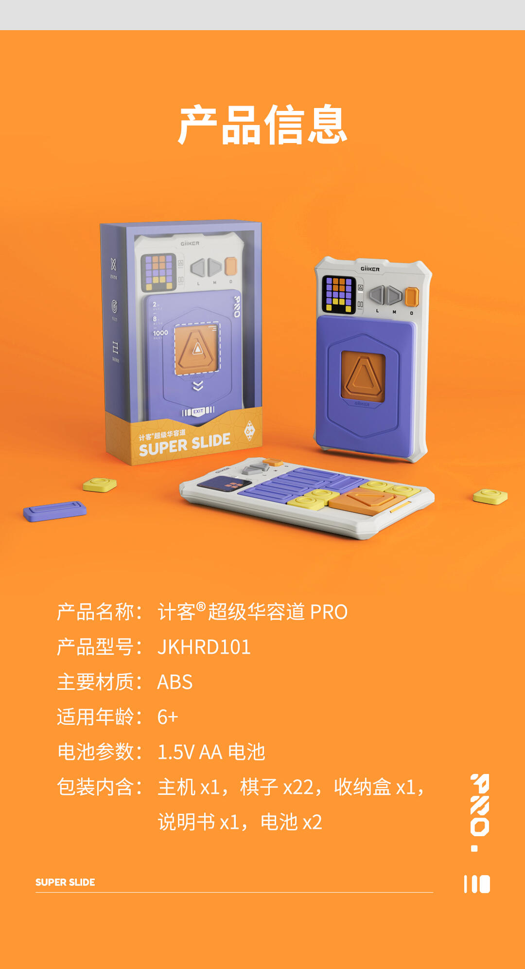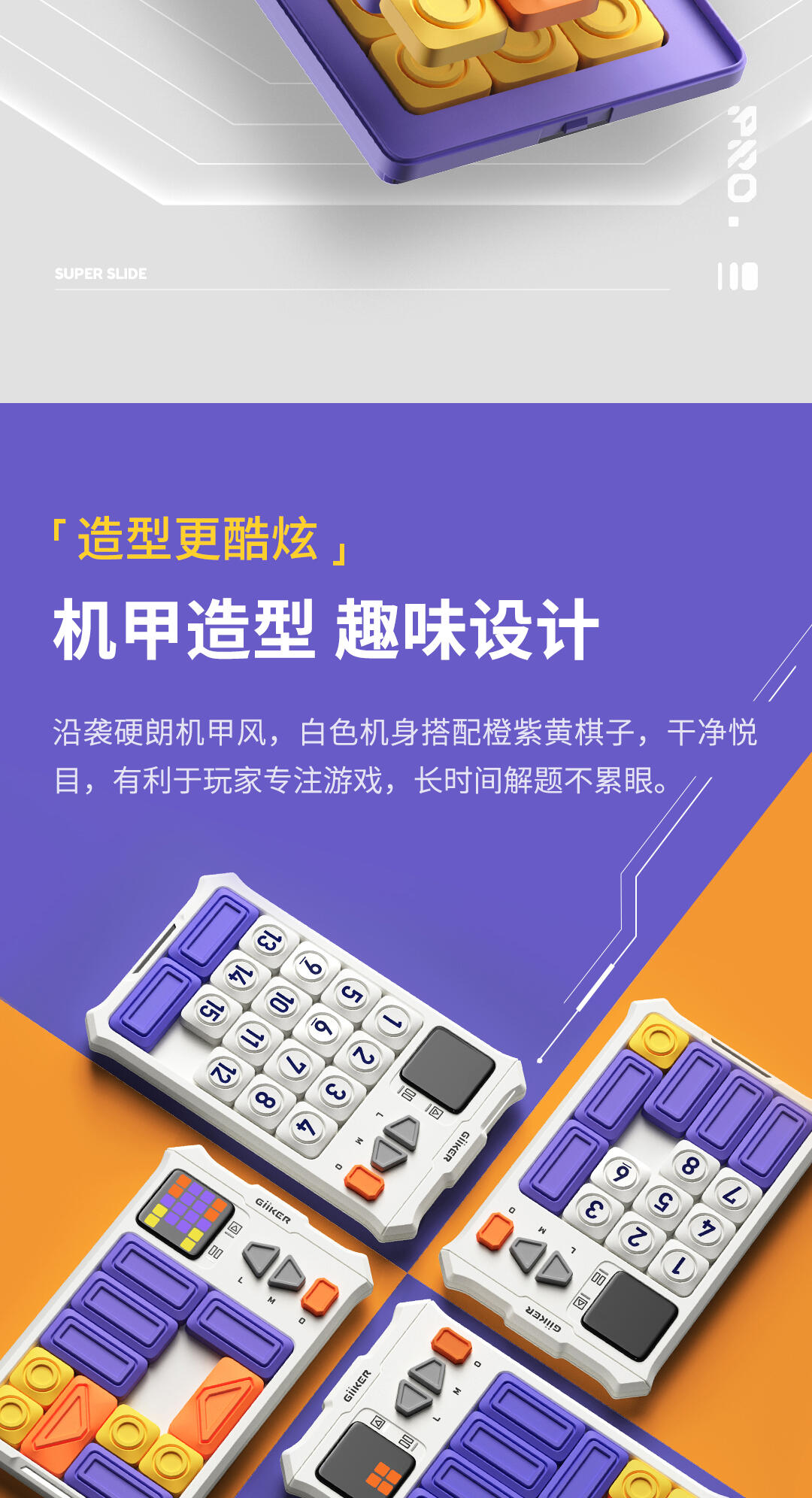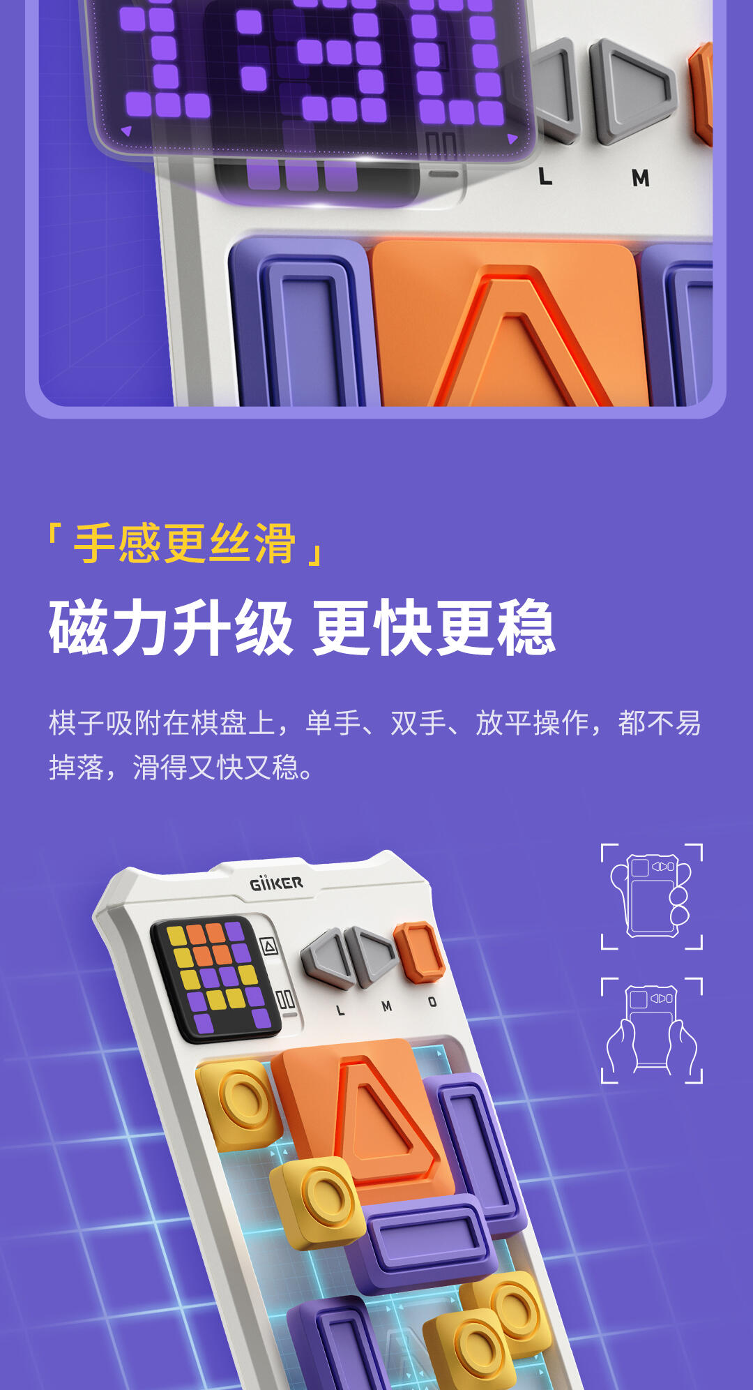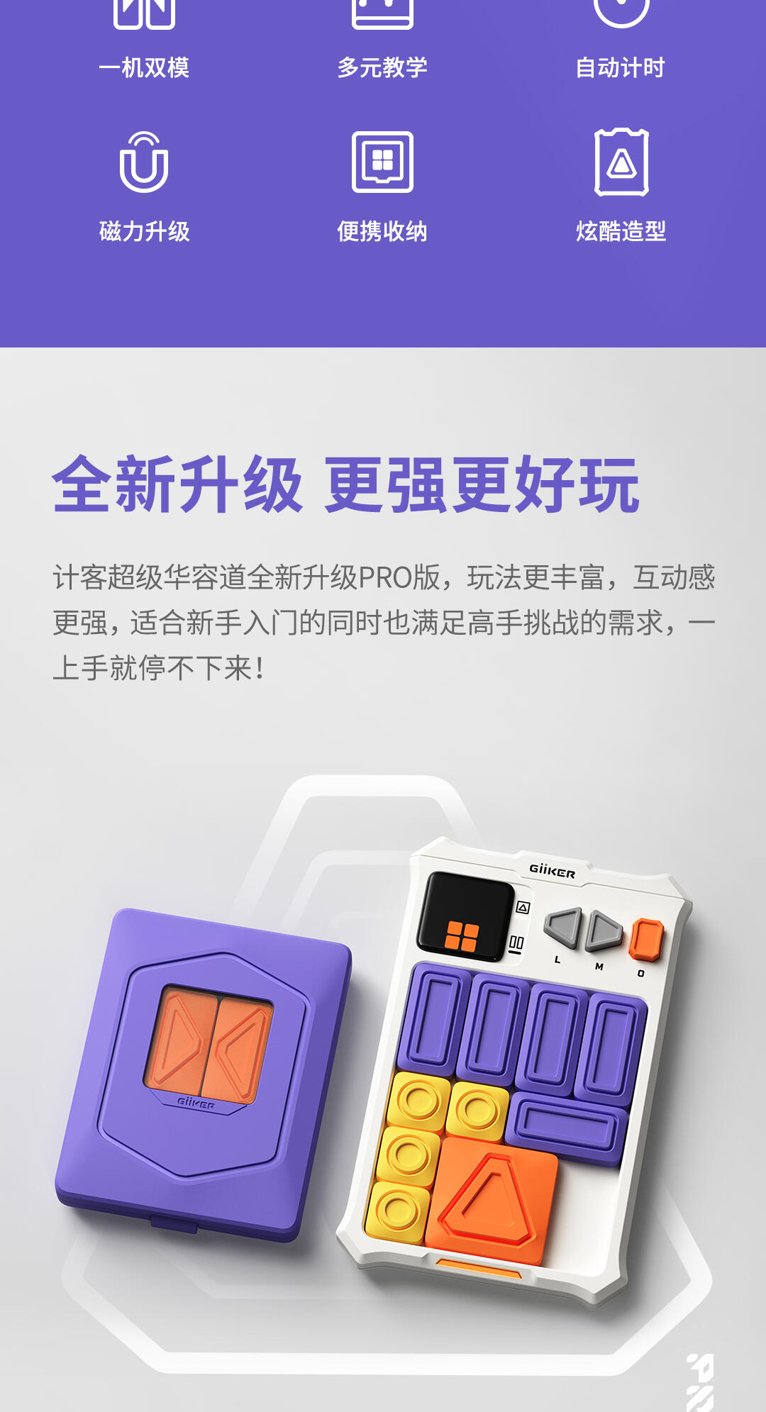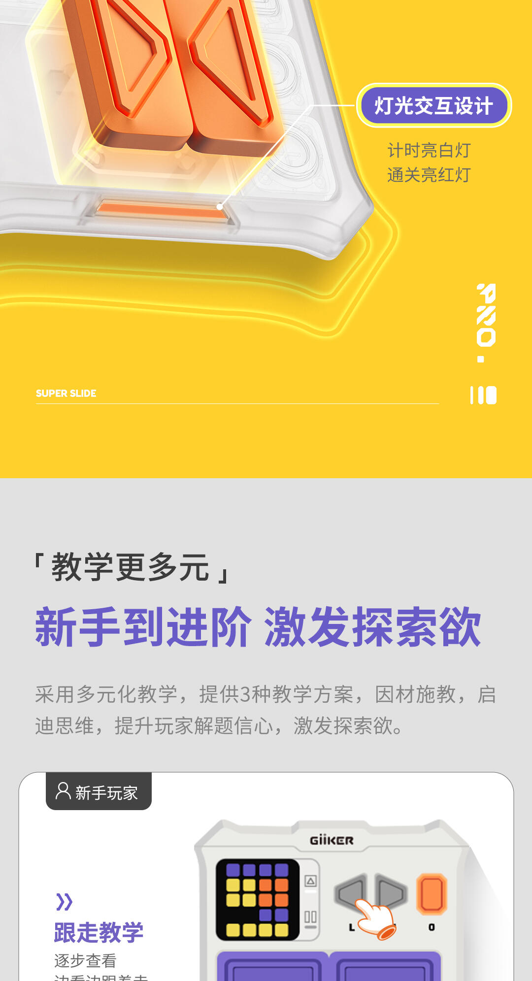 计客超级华容道全新升级 PRO 版,玩法更丰富,互动感更强!内置2大游戏模式,8 个难度等级,1000 种不同开局,通过小屏幕自动出题,智能感应通关并提示时间,提供3种教学思路,满足不同阶段玩家学习需求。即时灯光交互,操作简单直观,提升目标感和成就感,配套专属收纳盒,轻巧便携,让你随时随地,畅快开「滑」。