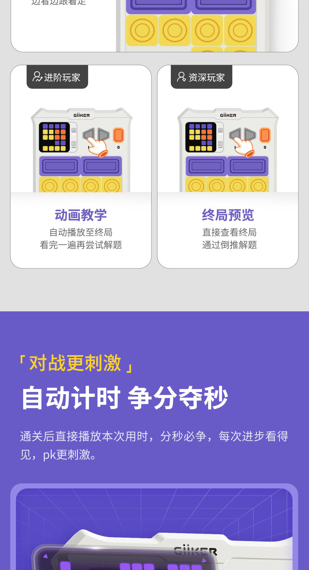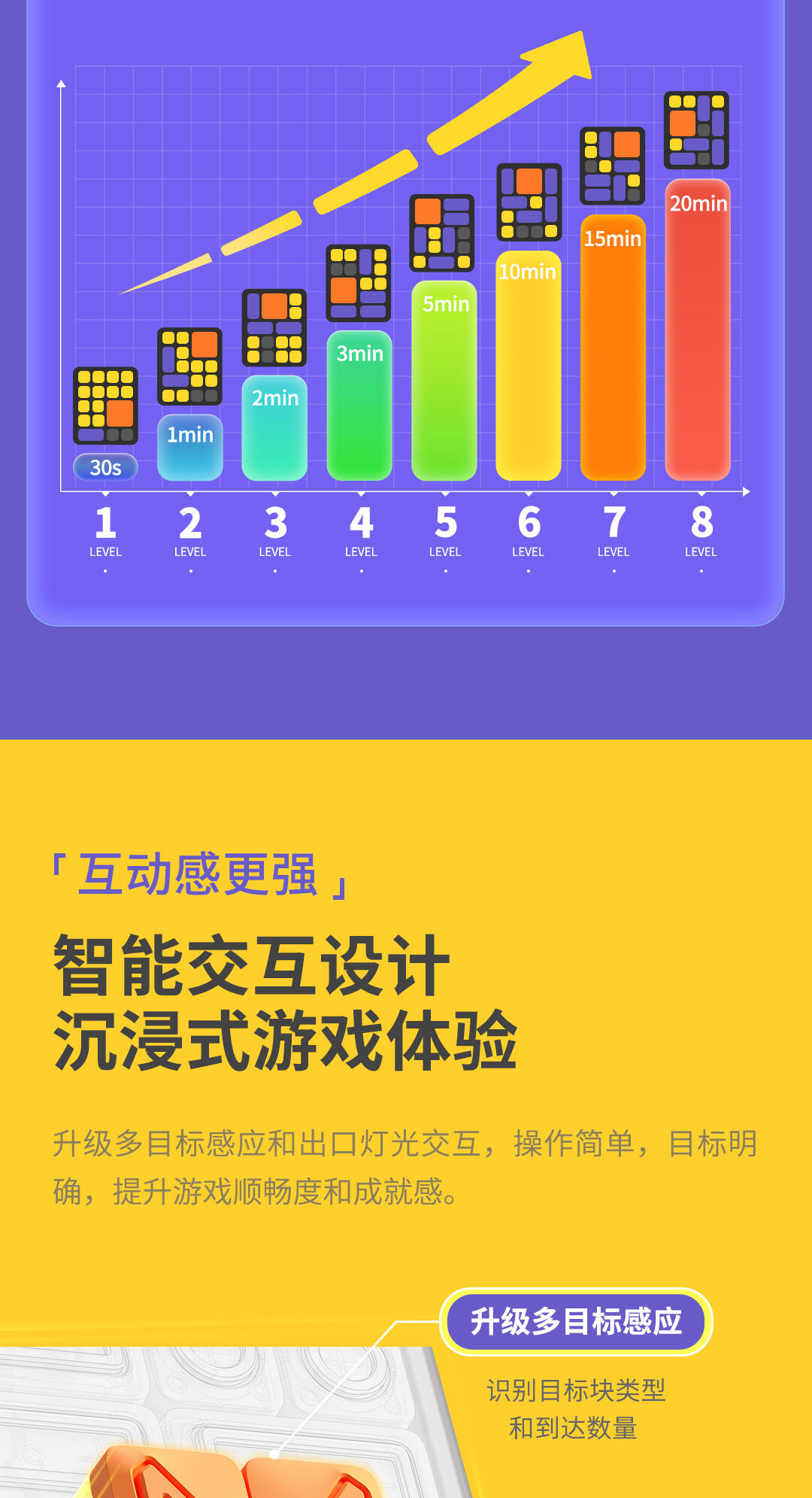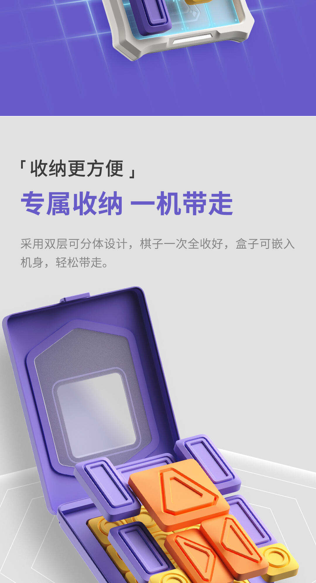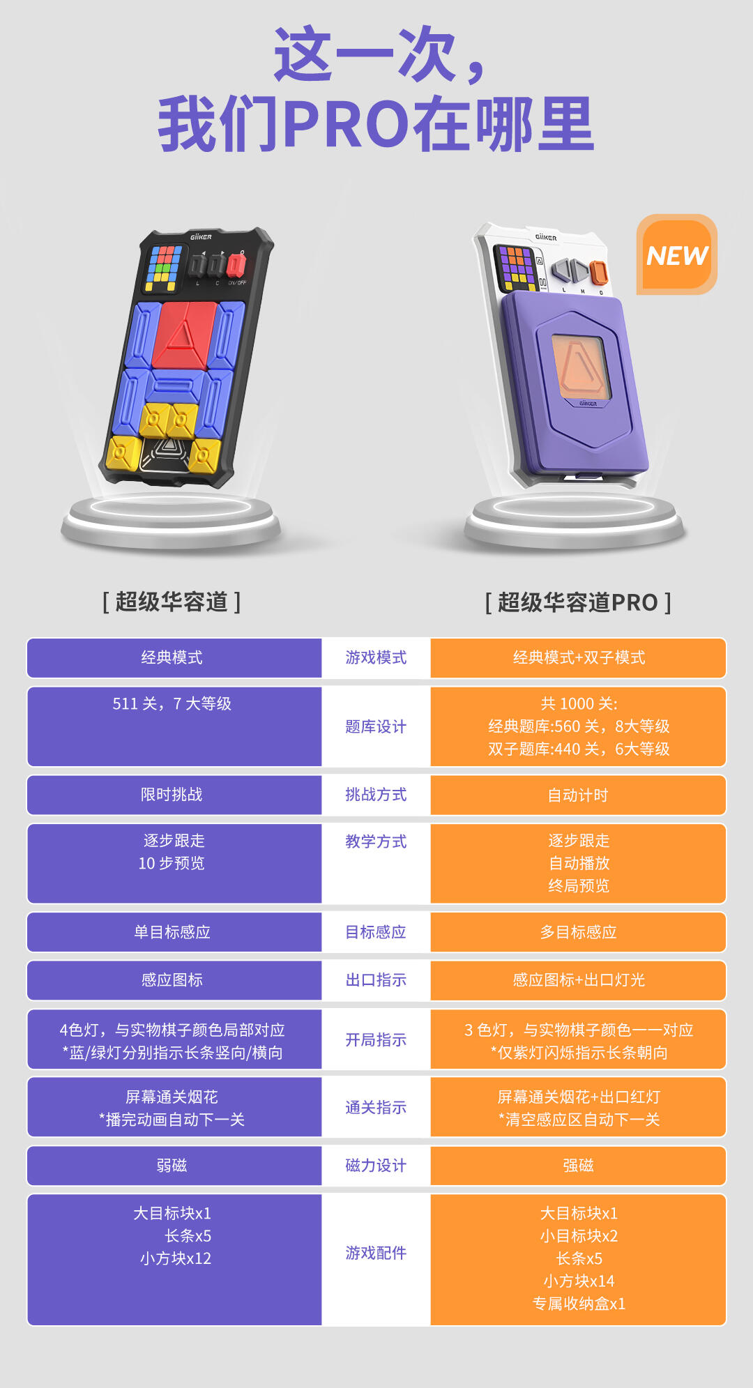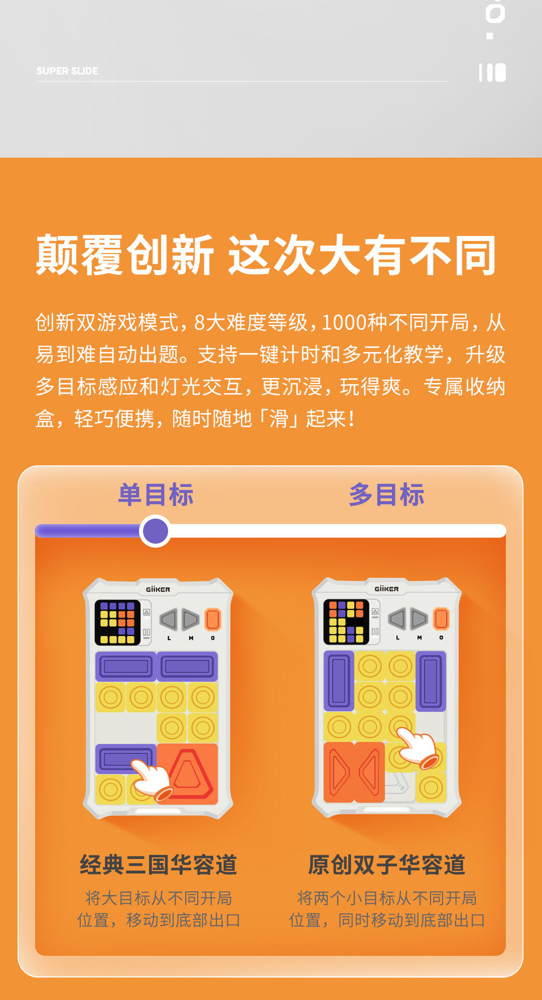 计客超级华容道全新升级 PRO 版,玩法更丰富,互动感更强!内置2大游戏模式,8 个难度等级,1000 种不同开局,通过小屏幕自动出题,智能感应通关并提示时间,提供3种教学思路,满足不同阶段玩家学习需求。即时灯光交互,操作简单直观,提升目标感和成就感,配套专属收纳盒,轻巧便携,让你随时随地,畅快开「滑」。