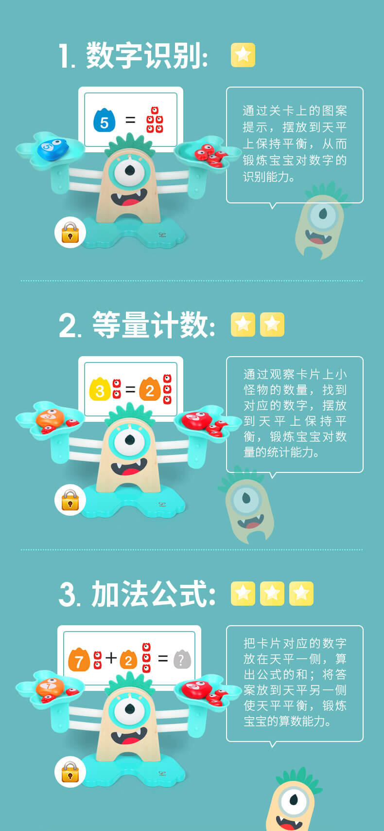 将怪物宝宝们放到怪物妈妈的“手心”,让他们一家团聚吧。通过加减码直至天平平衡,学习基础的数学运算,了解“重量”的概念。