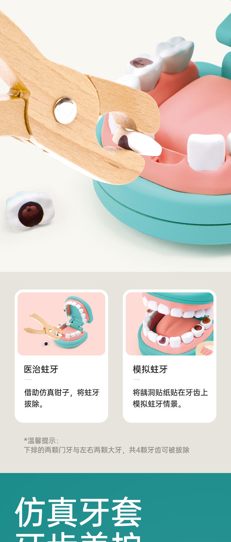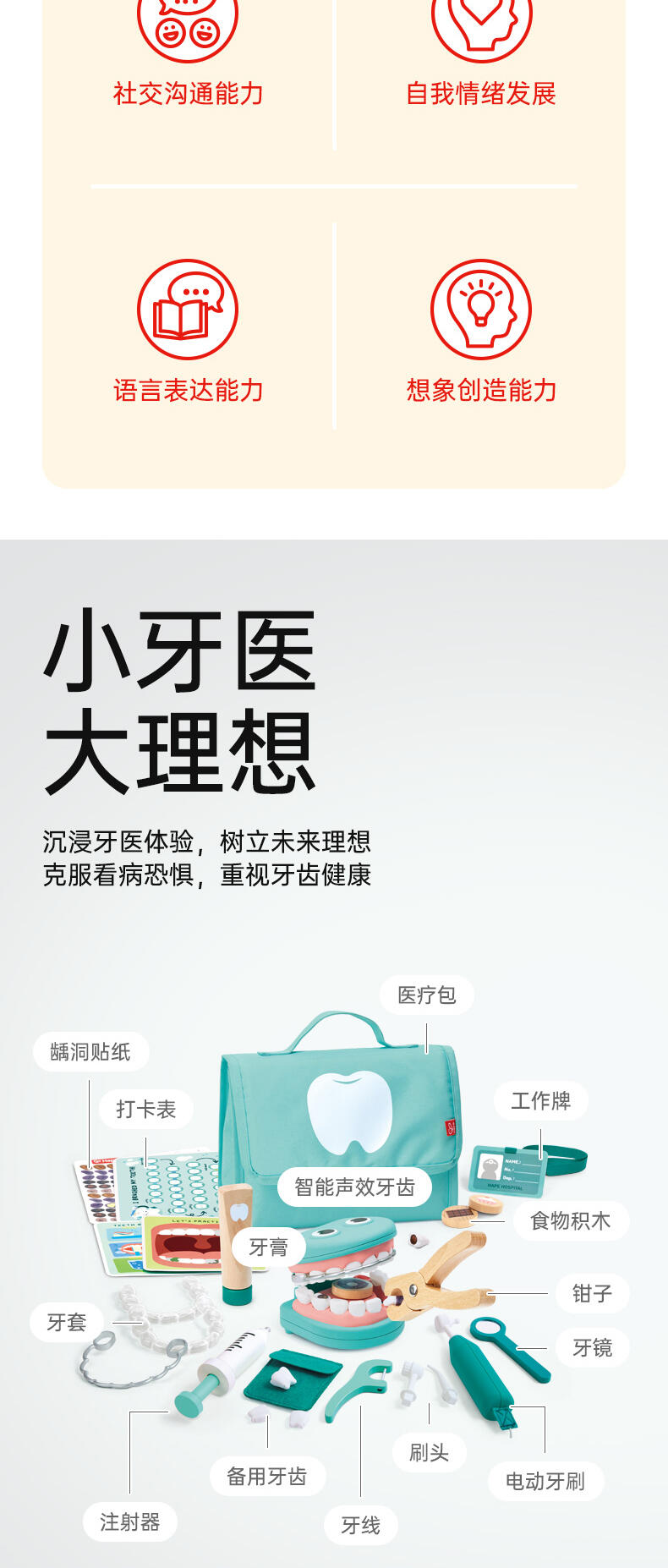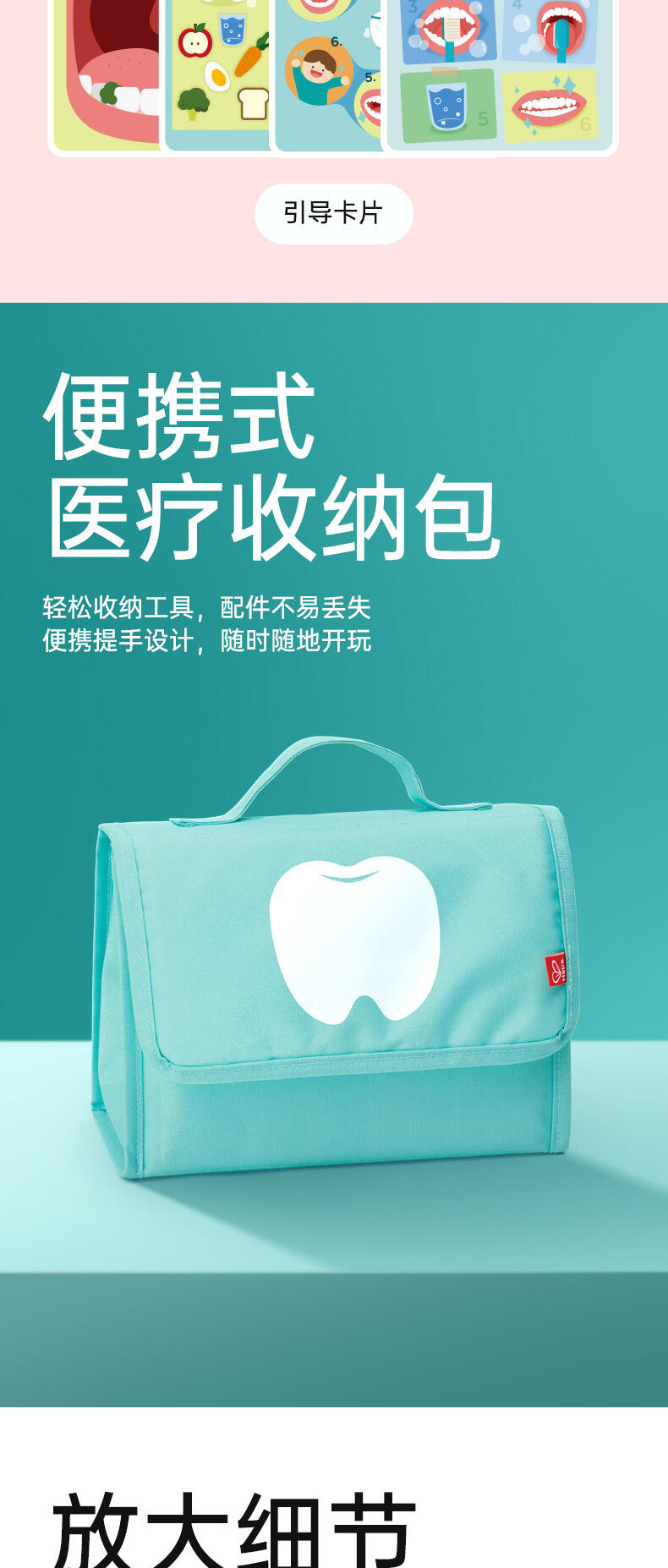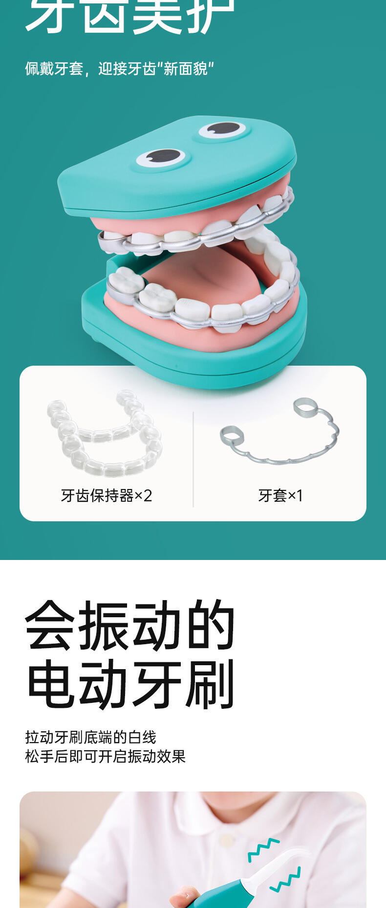 这套微笑牙医诊所套,拥有超还原的仿真工具,同时配备一个便携式诊疗包, 能够让宝贝沉浸式体验牙医治疗蛀牙的全过程,在过家家游戏中提升认知,消除恐惧。