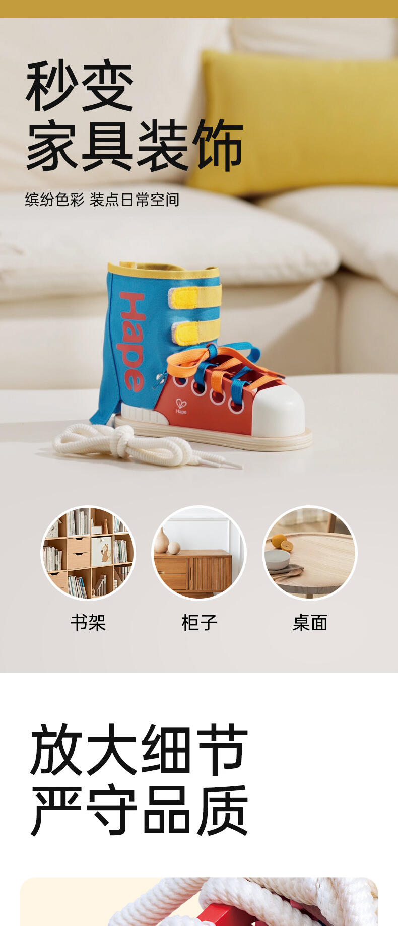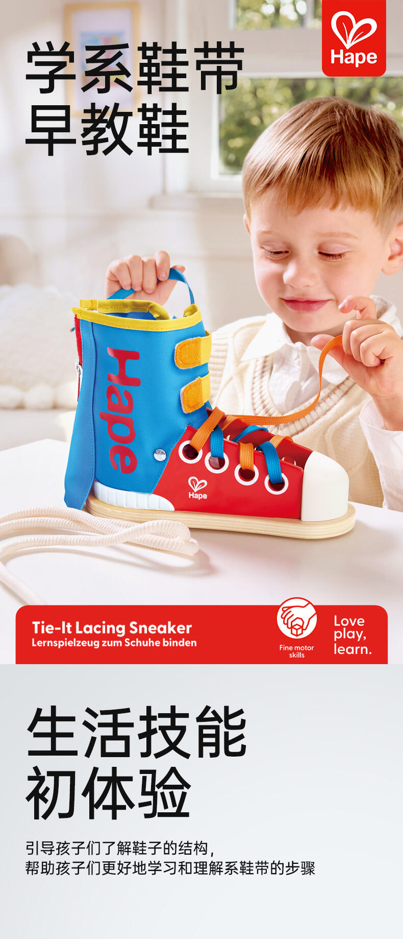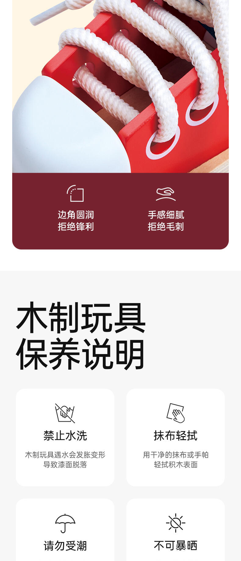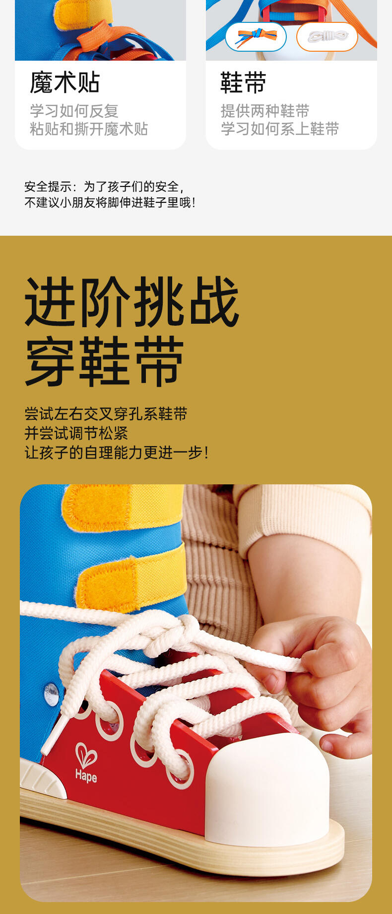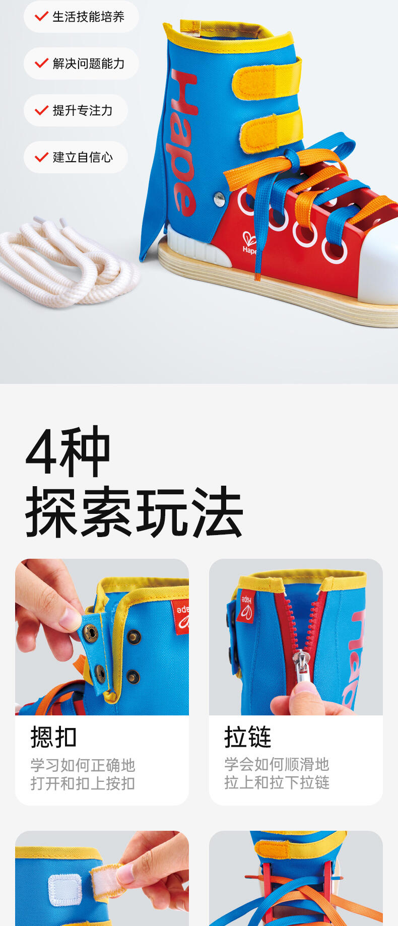 引导孩子们了解鞋子的结构帮助孩子们更好地学习和理解系鞋带的步骤. 按扣、拉链、魔术贴、两款鞋带四种探索玩法培养专注力,树立自信心