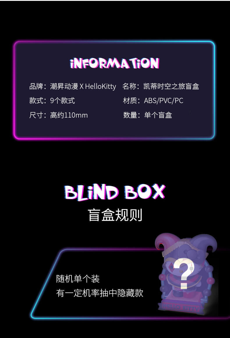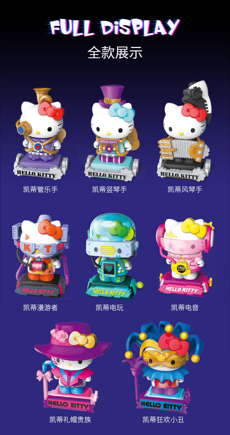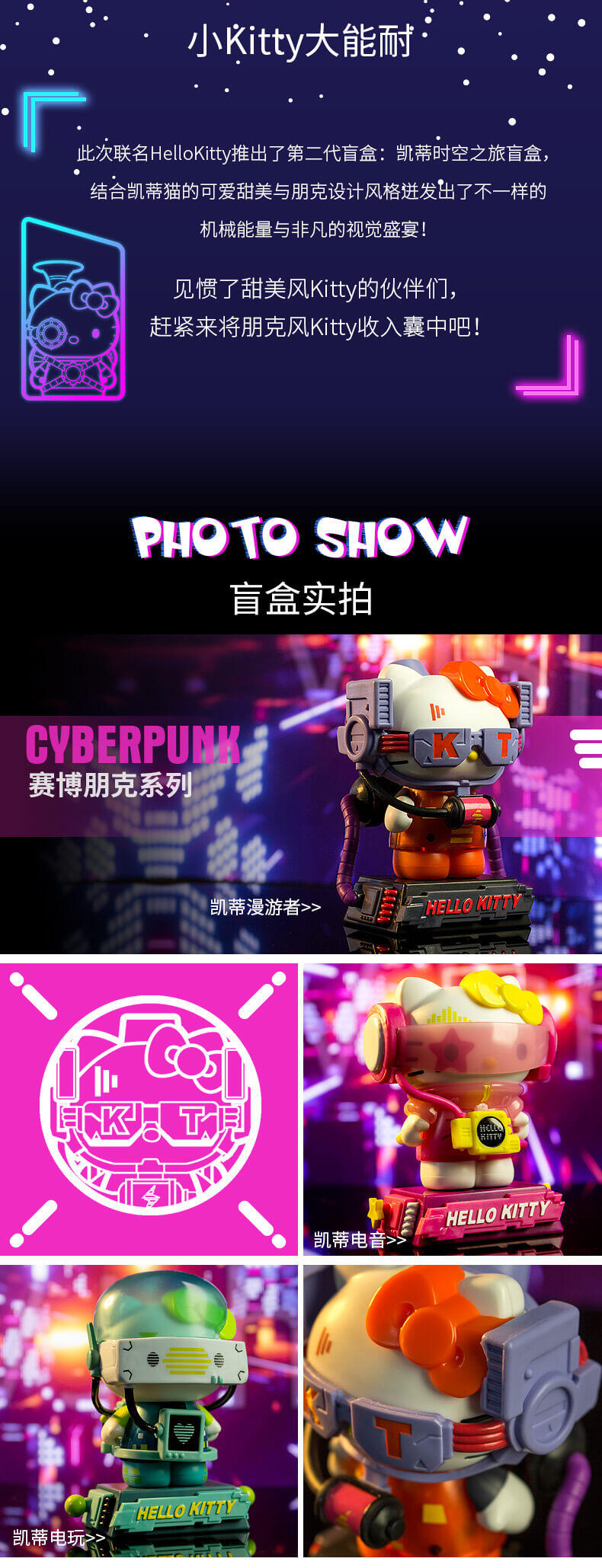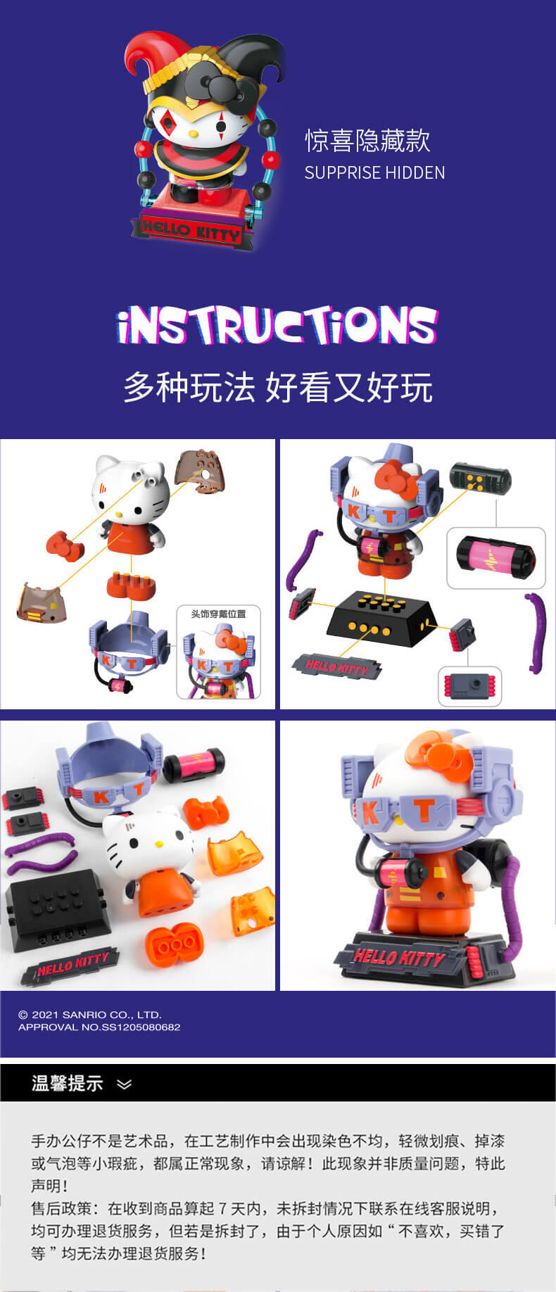 结合凯蒂猫的可爱甜美与朋克设计风格迸发出了不一样的机械能量与非凡的视觉盛宴!多种玩法,好玩又好看,随机单个装,整盒共9款不重复,有一定机率抽中隐藏款。材质:PVC/PC/ABS