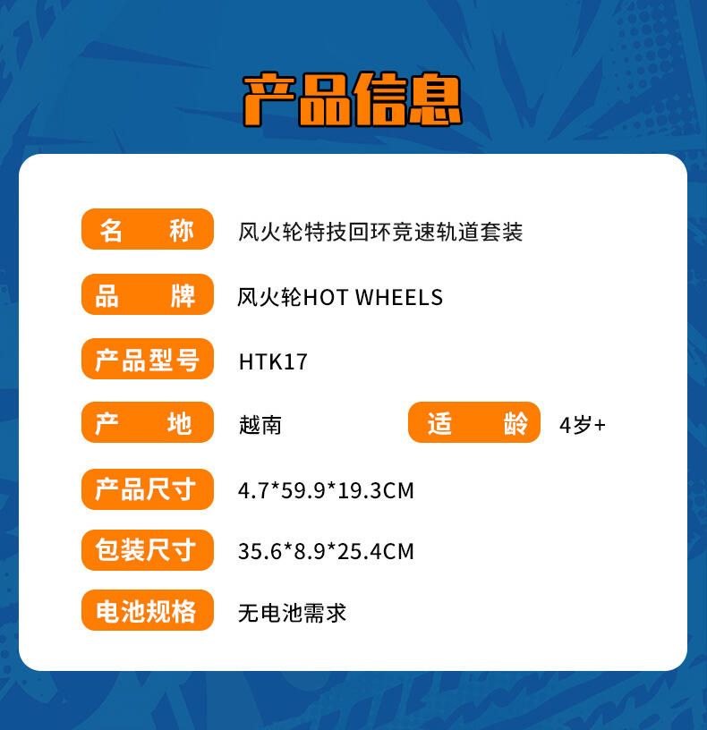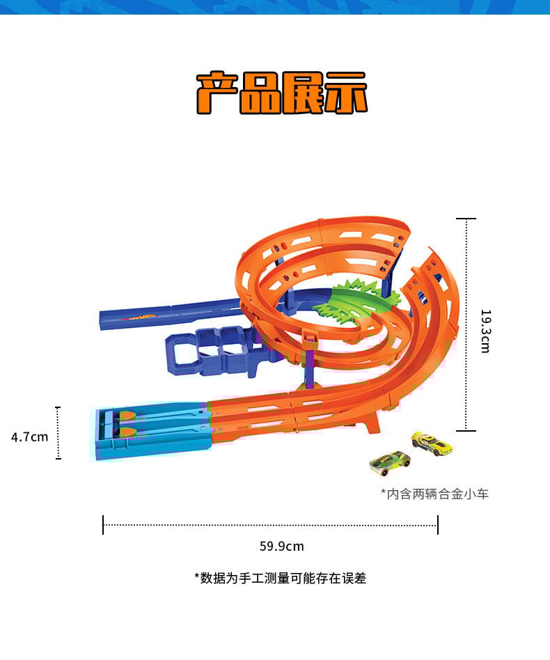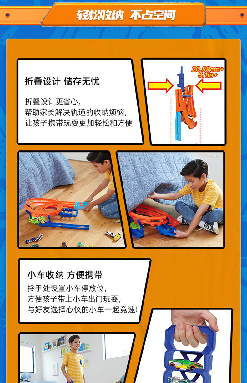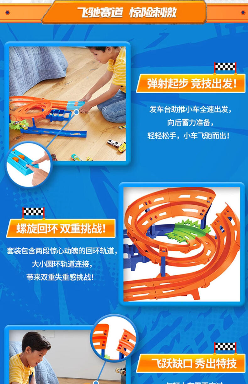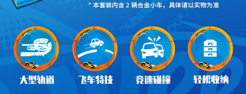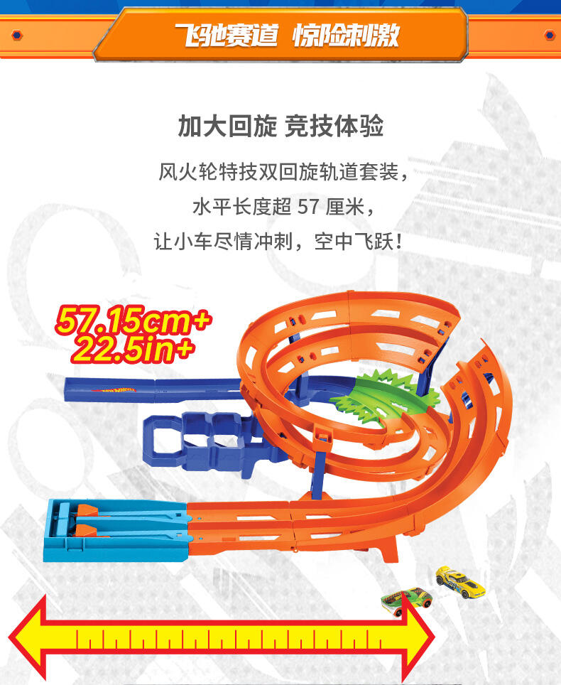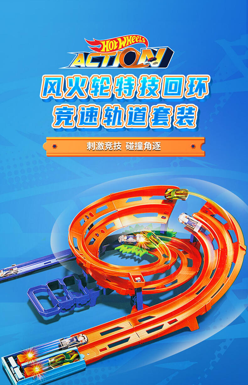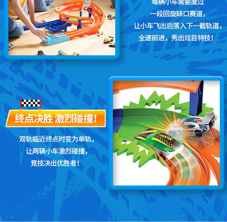 充满竞速、碰撞与飞车特技,提供给孩子们精彩刺激的风火轮轨道竞技体验! 双轨并排启动,临近终点时变为单轨,让两辆小车激烈碰撞,竞技决出优胜者! 飞跃缺口,上演精彩飞车特技 可折叠设计,易于收纳整理,不占家庭空间 内含1辆合金小车