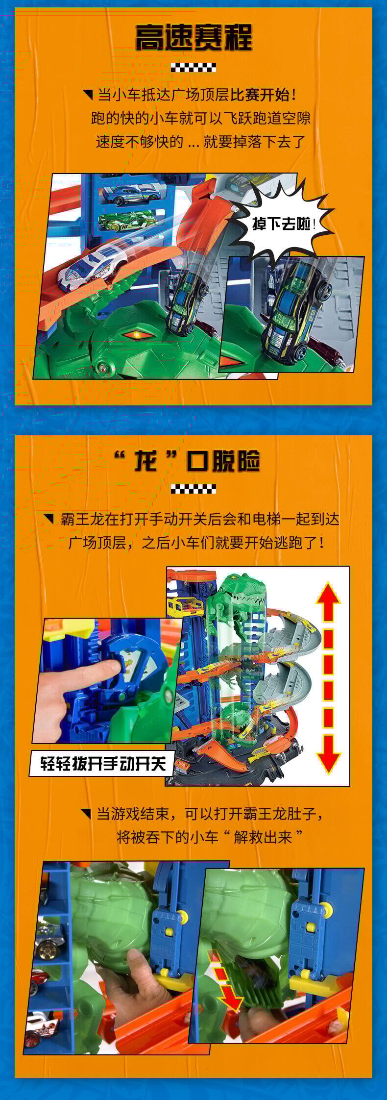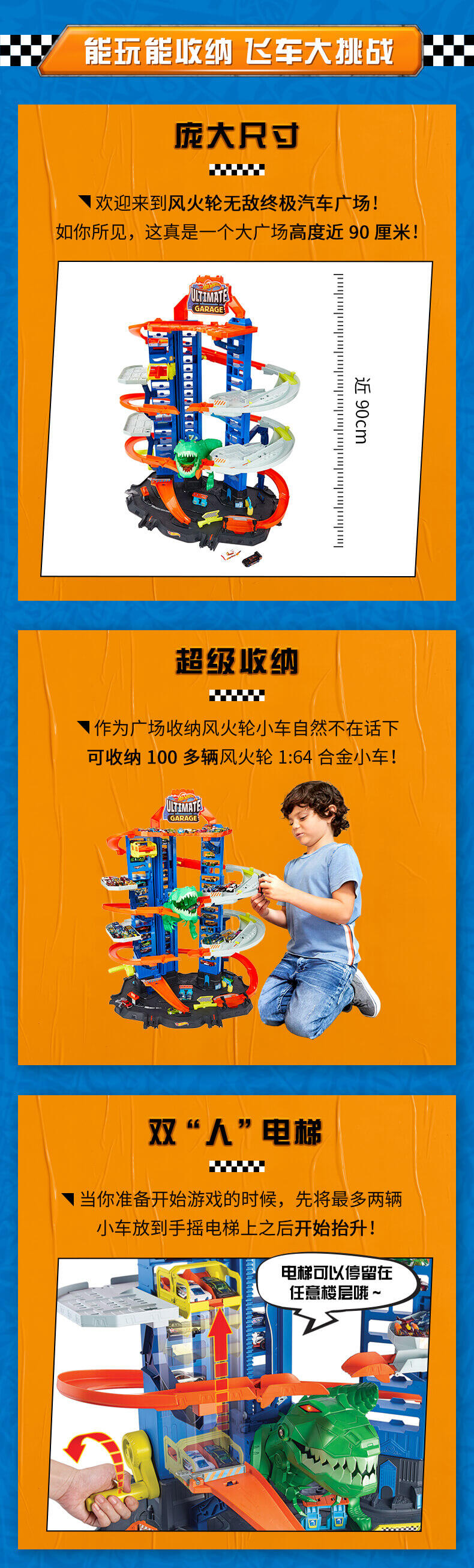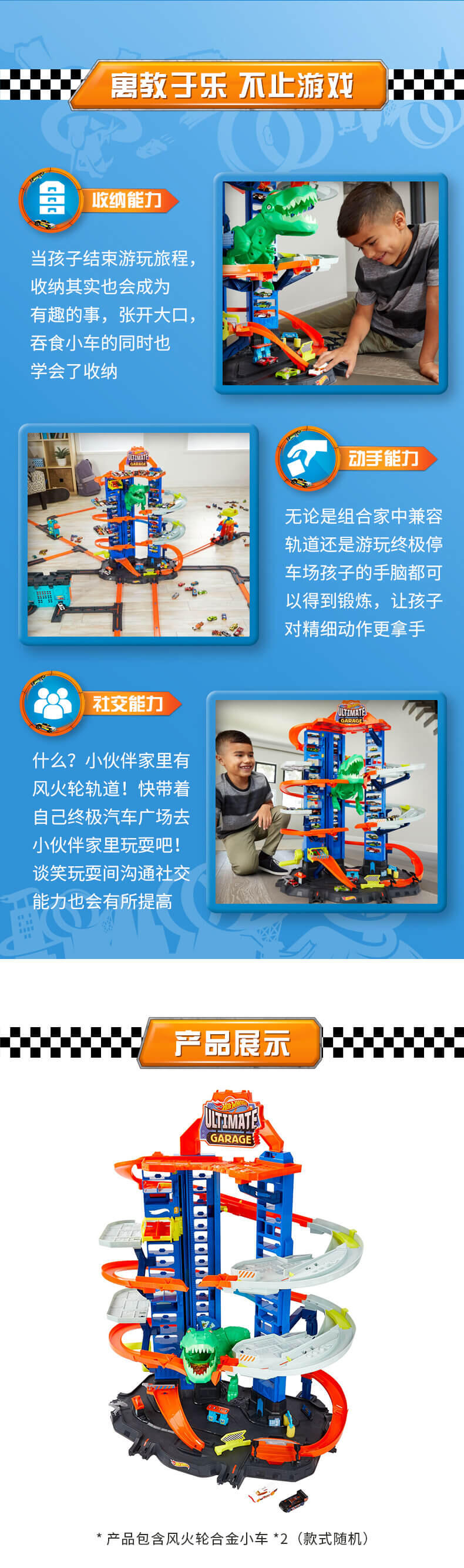 這是迄今為止最高的終極車庫中的終極挑戰,提供無盡的故事講述和車輛動作遊戲!這款巨大的玩具套裝可停放多達 100 多輛車,還有一個令人驚訝的 Robo T-Rex 剋星,激發孩子們的想像力!孩子們乘坐兒童驅動的兩節車廂電梯一路向上。他們可以在多層車庫中疾馳而下,並嘗試多人遊戲模式以獲得持續的刺激!連接到其他 Hot Wheels 套裝(單獨出售),包括 2 輛 Hot Wheels 1:64 比例車輛和 Hot Wheels id 動作功能!插入 Hot Wheels id Portal(單獨出售)以解鎖額外的遊戲體驗:掃描汽車、與對手比賽、逃離 Robo T-Rex 並獲勝!
