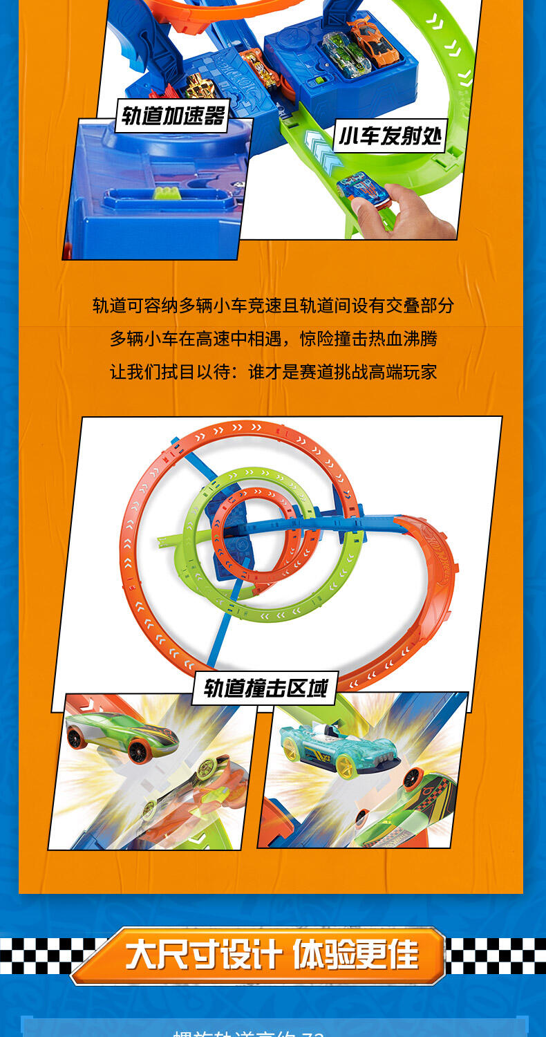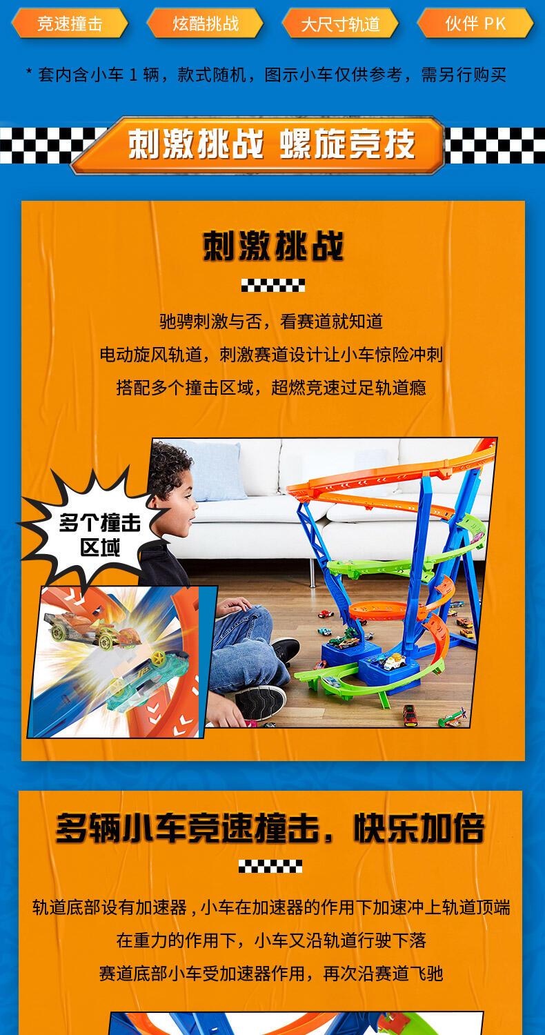 螺旋轨道设计,并有多个撞击区域,挑战极限,感受竞速追击的惊险和刺激小车通过底部加速器加速后冲上顶端,下落进入旋风螺旋赛道,到达底部会再次通过加速器,继续疾驰!