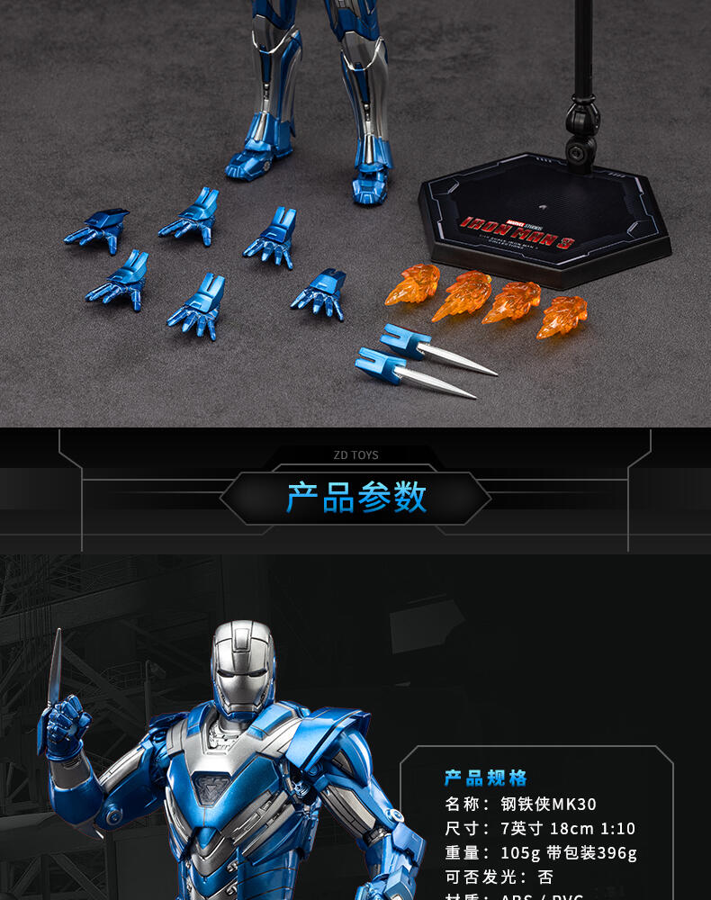 漫威十周年系列钢铁侠 MK30。多手型可替换。多关节可动。