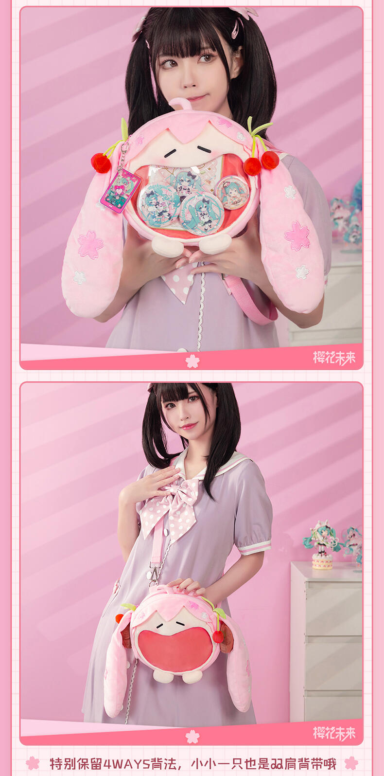 变小变粉变可爱!樱花未来也化身痛包啦~软乎乎,粉粉嫩嫩装点着樱花与樱桃,是春天的烂漫颜色。精致刺绣,还原丰富细节。毛绒手感柔软舒适。