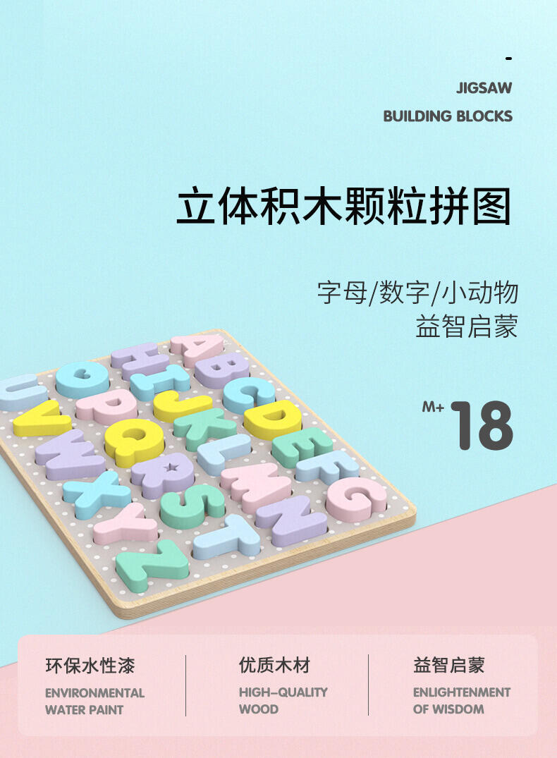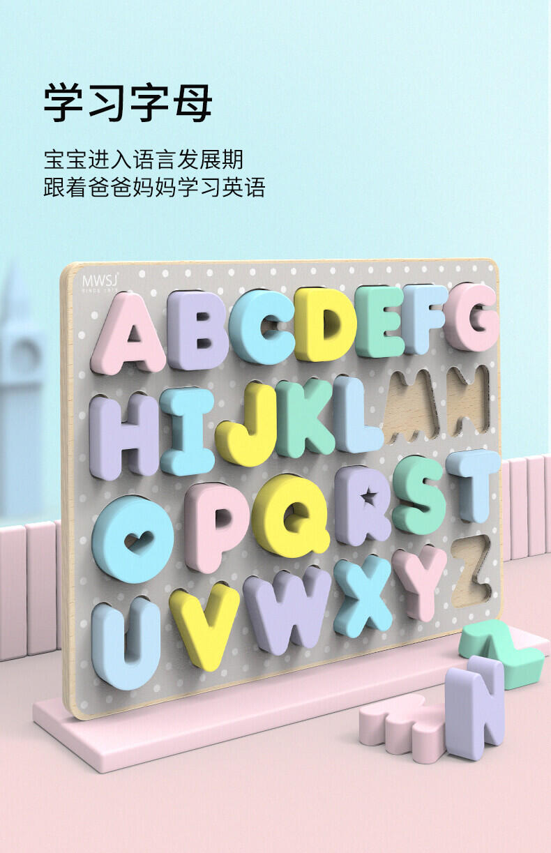 宝宝进入语言学习期,跟着爸爸妈妈学英语,美学配色保护宝宝 眼睛,360°全方位倒角,精细抛光打磨处理圆润光滑吴毛刺,保护宝宝双手,大颗粒防止宝宝吞咽,0甲醛,环保水性漆。