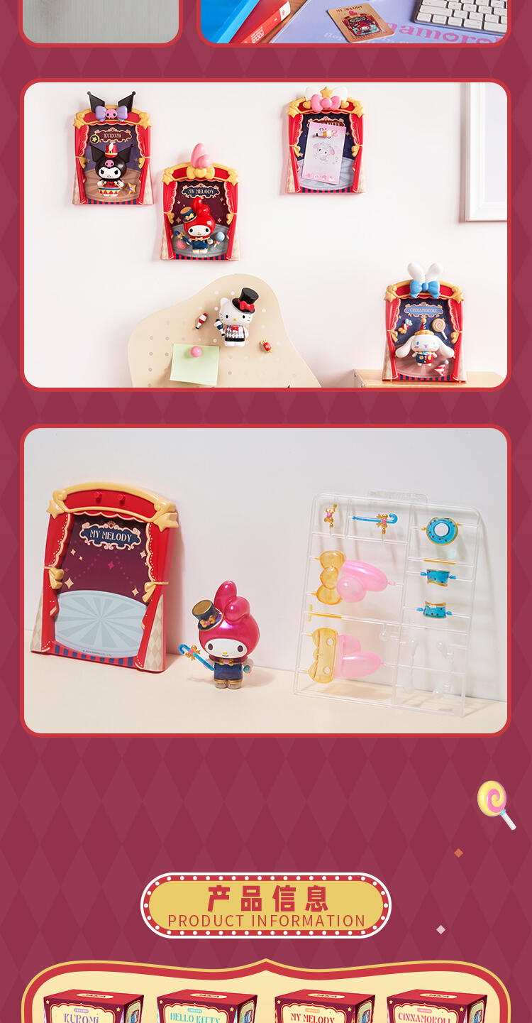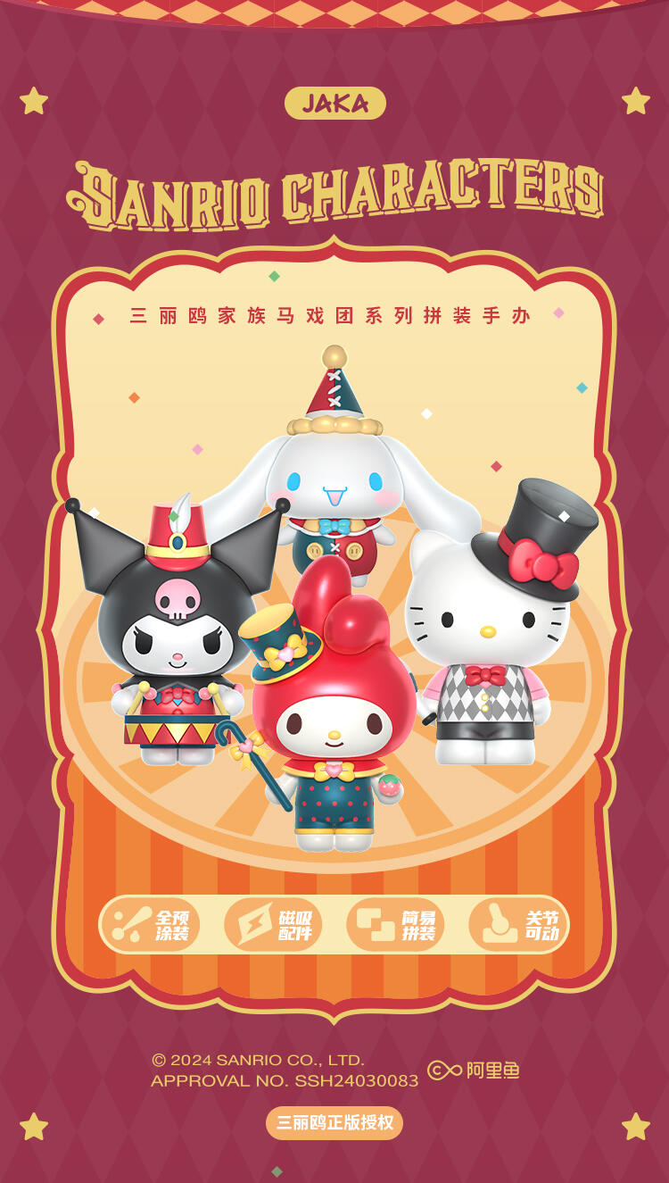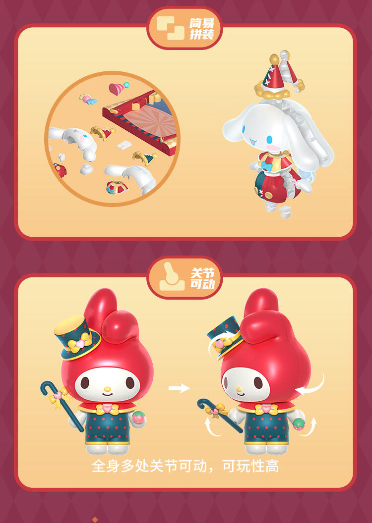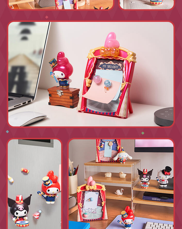 正版授权三丽鸥家族马戏团系列拼装手办,根据IP不同角色的特点,创意摆件,以其可爱的形象和神秘的马戏团主题,通过为不同角色添加不同小配件,从配色、头饰、衣服、表情,动作等通过二创创新的方式,为大家展现迷人有趣的马戏团世界,让人仿佛置身于精彩的表演现场。为您的生活空间增添一抹梦幻的色彩。 手办随附精美相框,可摆放在桌面或柜台上,成为您家居装饰的亮点。② 同时配有挂钩设计,可轻松壁挂,为您的空间增添一抹独特的艺术气息。③通过增加磁性材料,可磁吸互动,可吸附在冰箱等任何铁板上,轻松实现与周围环境的互动,为您的生活带来更多乐趣。④轻松拆件、简易拼装,设计为可拼装的方式,增加了产品的可玩性。⑤ 手办关节可动,您可以根据喜好调整姿态。