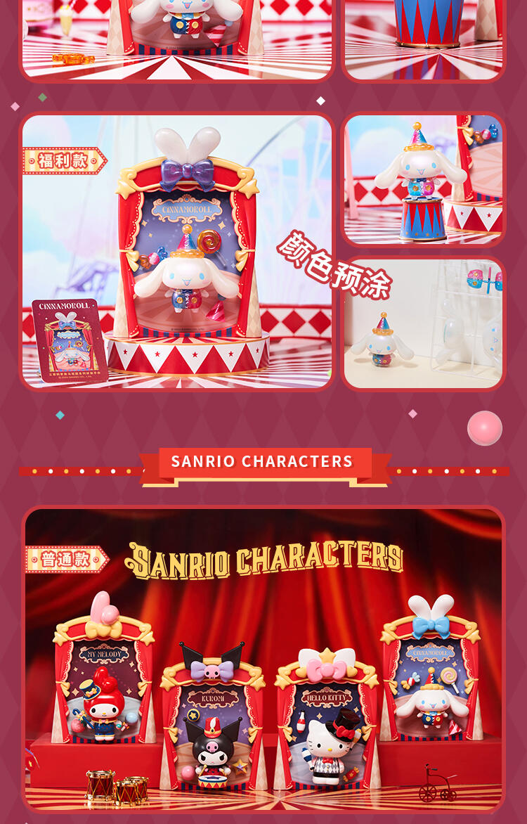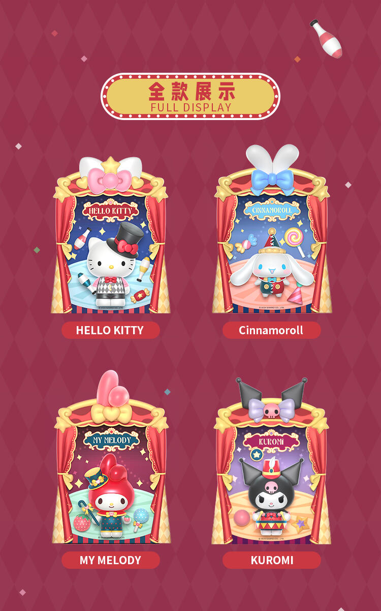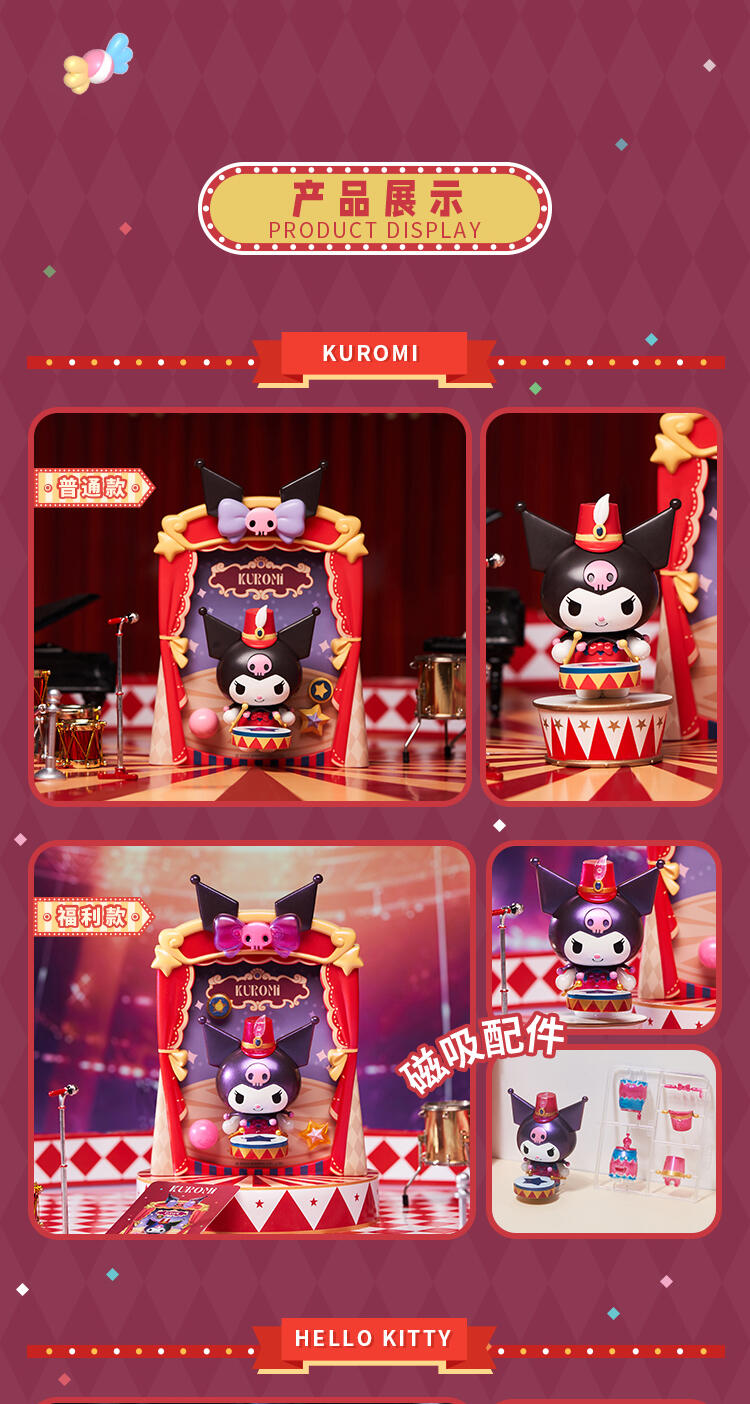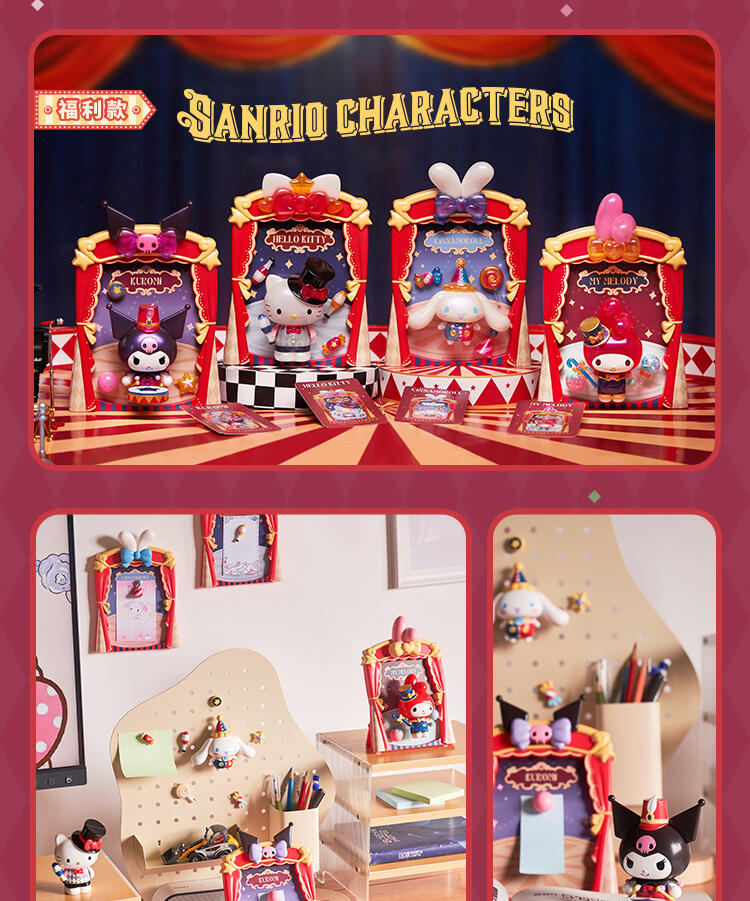 正版授权三丽鸥家族马戏团系列拼装手办,根据IP不同角色的特点,创意摆件,以其可爱的形象和神秘的马戏团主题,通过为不同角色添加不同小配件,从配色、头饰、衣服、表情,动作等通过二创创新的方式,为大家展现迷人有趣的马戏团世界,让人仿佛置身于精彩的表演现场。为您的生活空间增添一抹梦幻的色彩。 手办随附精美相框,可摆放在桌面或柜台上,成为您家居装饰的亮点。② 同时配有挂钩设计,可轻松壁挂,为您的空间增添一抹独特的艺术气息。③通过增加磁性材料,可磁吸互动,可吸附在冰箱等任何铁板上,轻松实现与周围环境的互动,为您的生活带来更多乐趣。④轻松拆件、简易拼装,设计为可拼装的方式,增加了产品的可玩性。⑤ 手办关节可动,您可以根据喜好调整姿态。