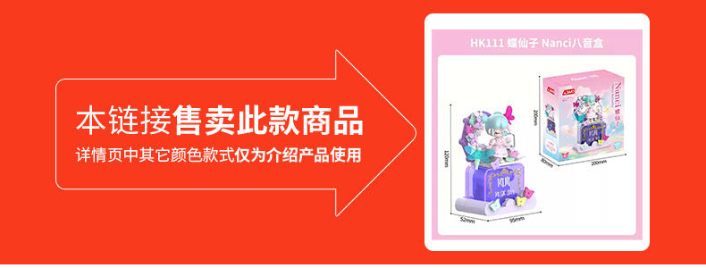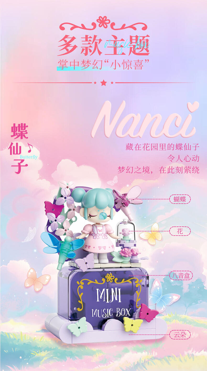 Nanci跨界积木盲盒,搭配唯美场景;转动背后发条,可发出律动音乐。