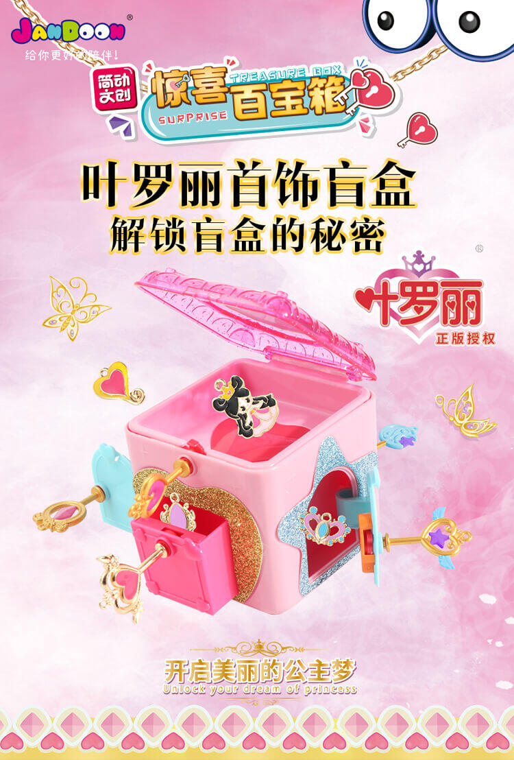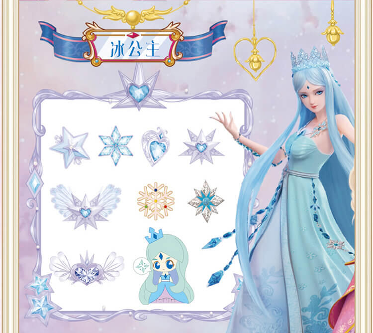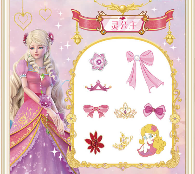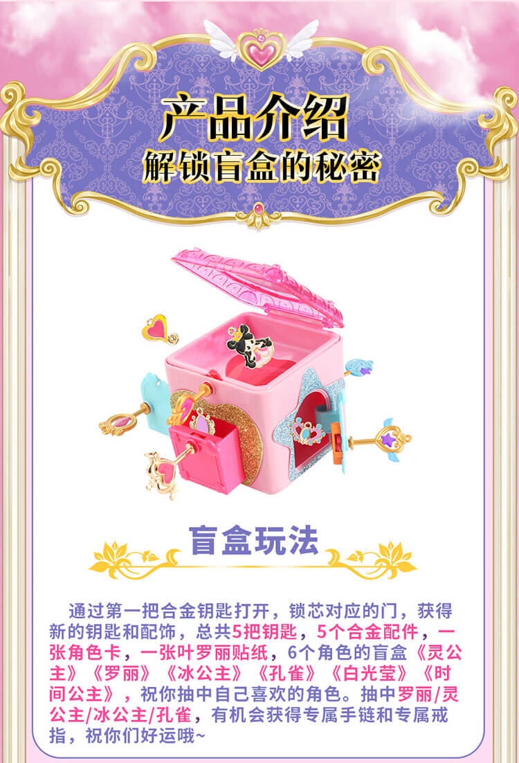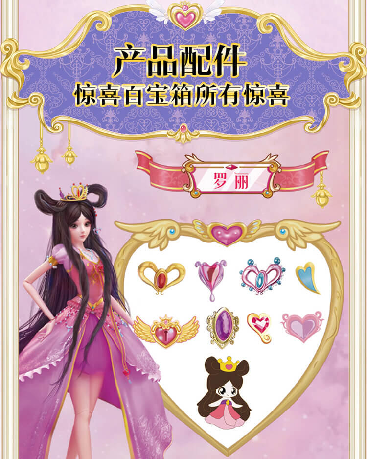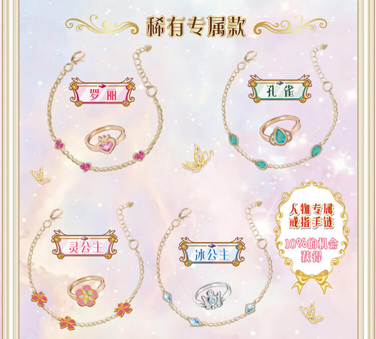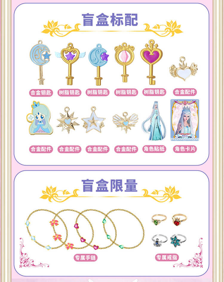 6个人物,每个人物专属精致合金钥匙,专属的精美人物卡片和贴纸,4款(罗丽 冰公主 灵公主 孔雀)定制的限量戒指和手链,多达50+以上的精美合金配件;叶罗丽款每6盒中必中奖1盒,限量戒指和限量手链随机。。