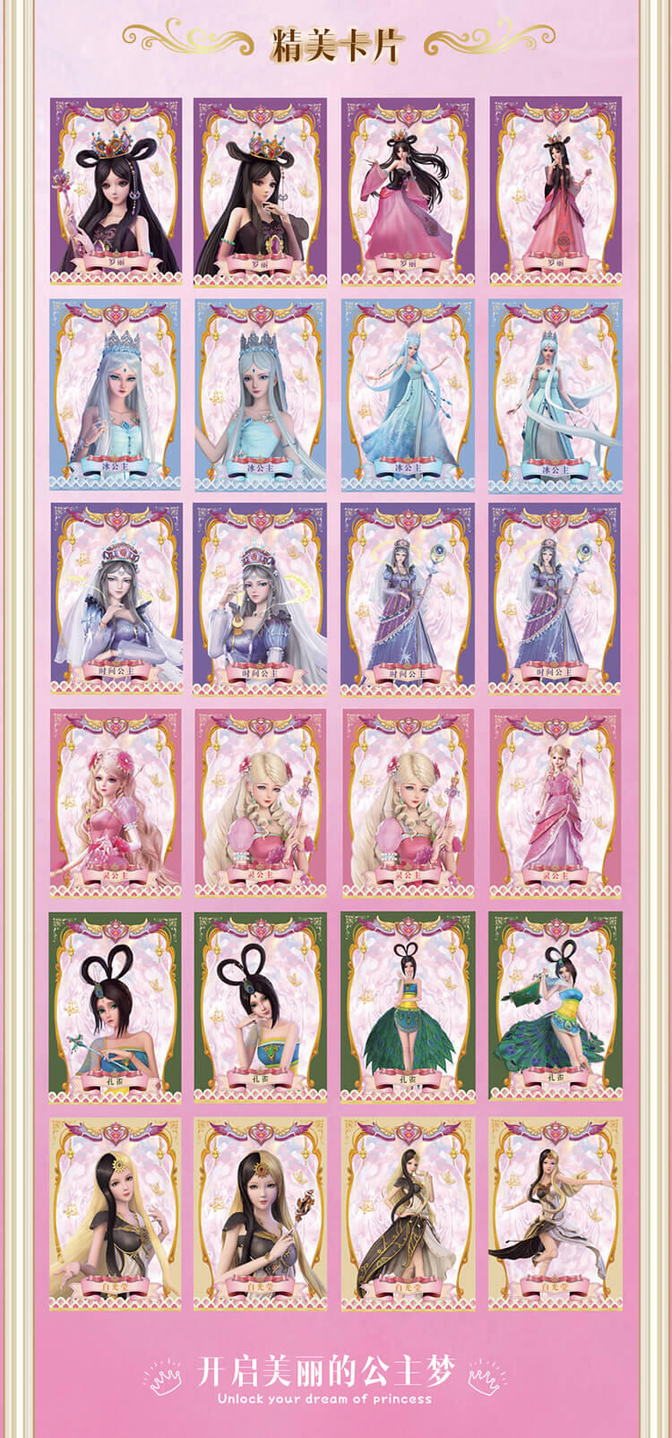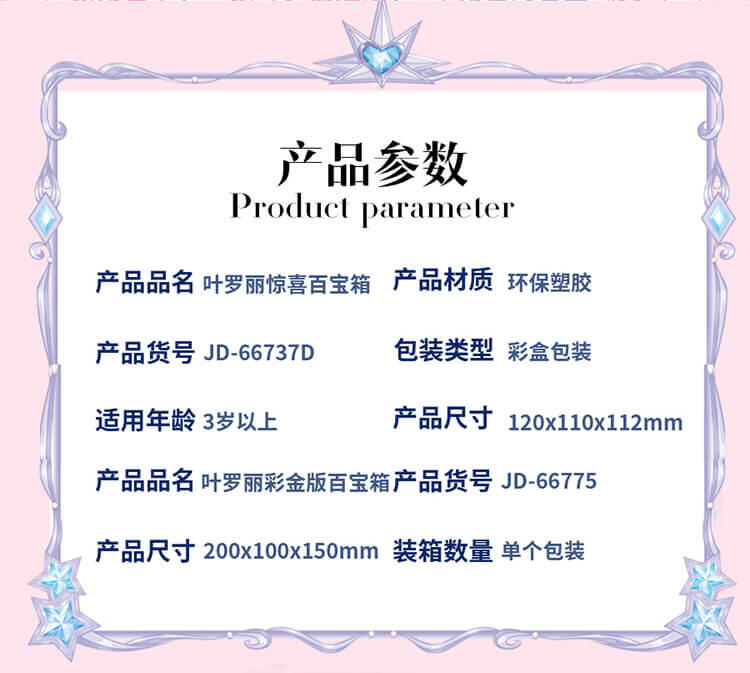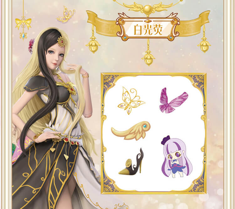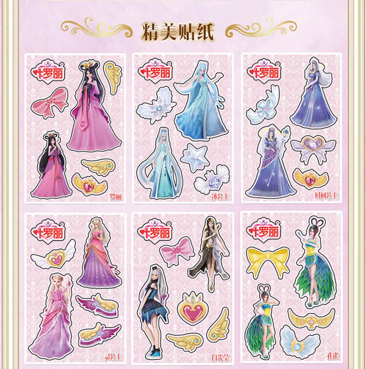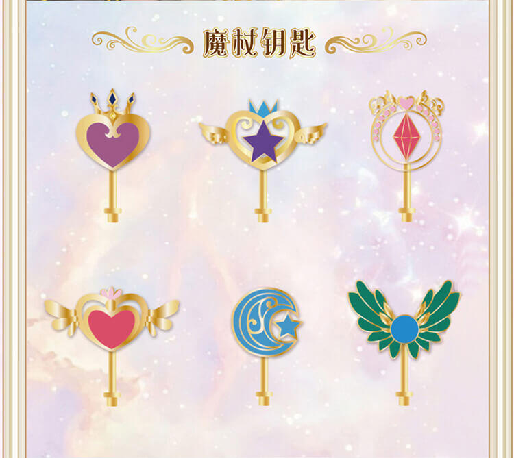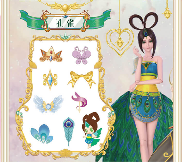 6个人物,每个人物专属精致合金钥匙,专属的精美人物卡片和贴纸,4款(罗丽 冰公主 灵公主 孔雀)定制的限量戒指和手链,多达50+以上的精美合金配件;叶罗丽款每6盒中必中奖1盒,限量戒指和限量手链随机。。