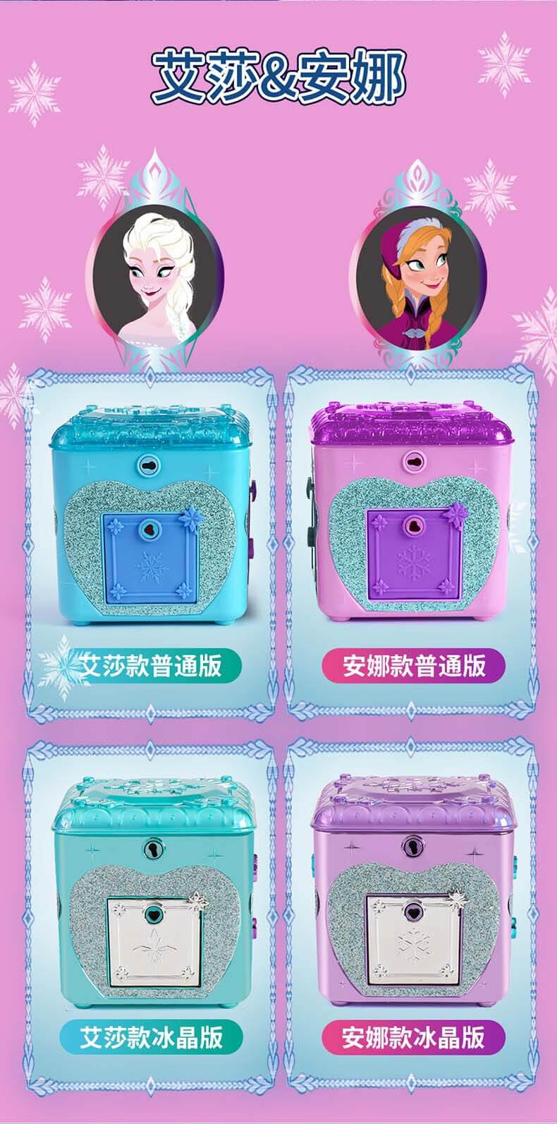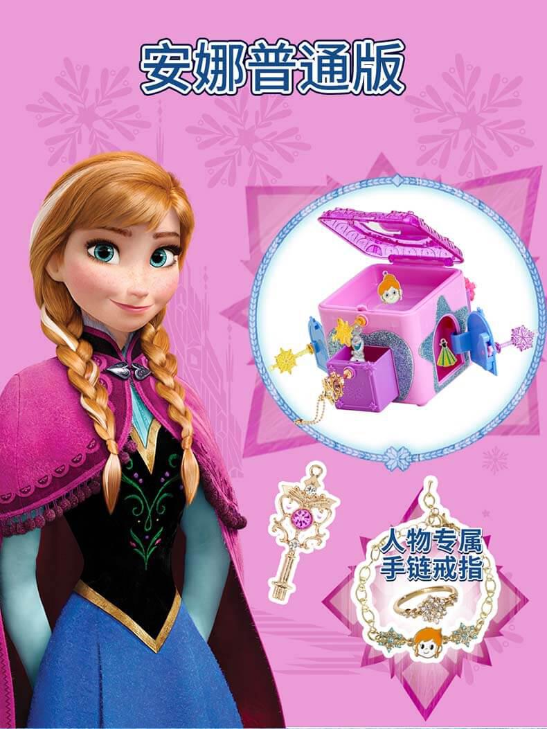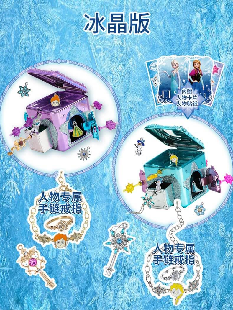 冰雪款每6盒中必中奖1盒,艾莎和安娜的限量戒指和限量手链随机;冰雪奇缘元素打造的钥匙,艾莎安娜2款专属精致合金钥匙,2套不同元素风格的合件配件(艾莎安娜),2款角色专属的精美人物卡片和贴纸,精心定制的角色专属限量戒指和手链;多达50+以上的精美合金配件。