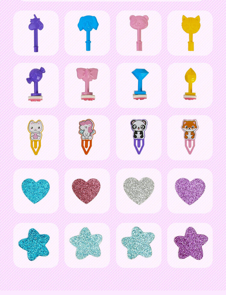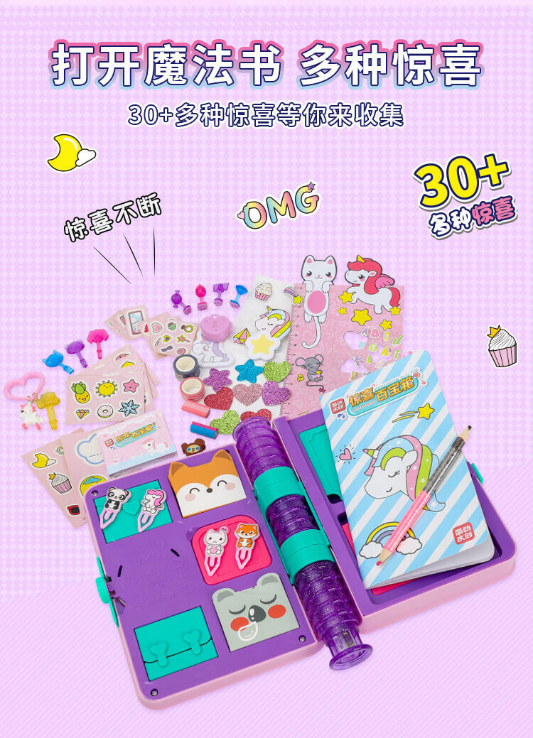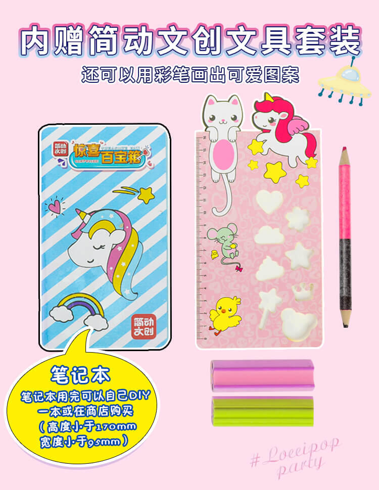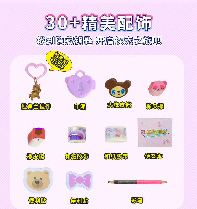 女孩款设计,谜题一样的开锁过程,需要动动你的小智慧才能找到钥匙,打开魔法,惊喜多多,文具套装盲盒,配件精致丰富;实用的学习小助手笔记本和铅笔刨,好玩有趣的印章和精美贴纸;还有精准的小量尺,随时帮你解决学习上的难题;,可重复使用的文具类盲盒,谜题版开锁过程打造专属你的文具空间,笔记本、铅笔刨,还有印章、贴纸、小量尺,配件实用且丰富,可玩可用。材质:塑胶