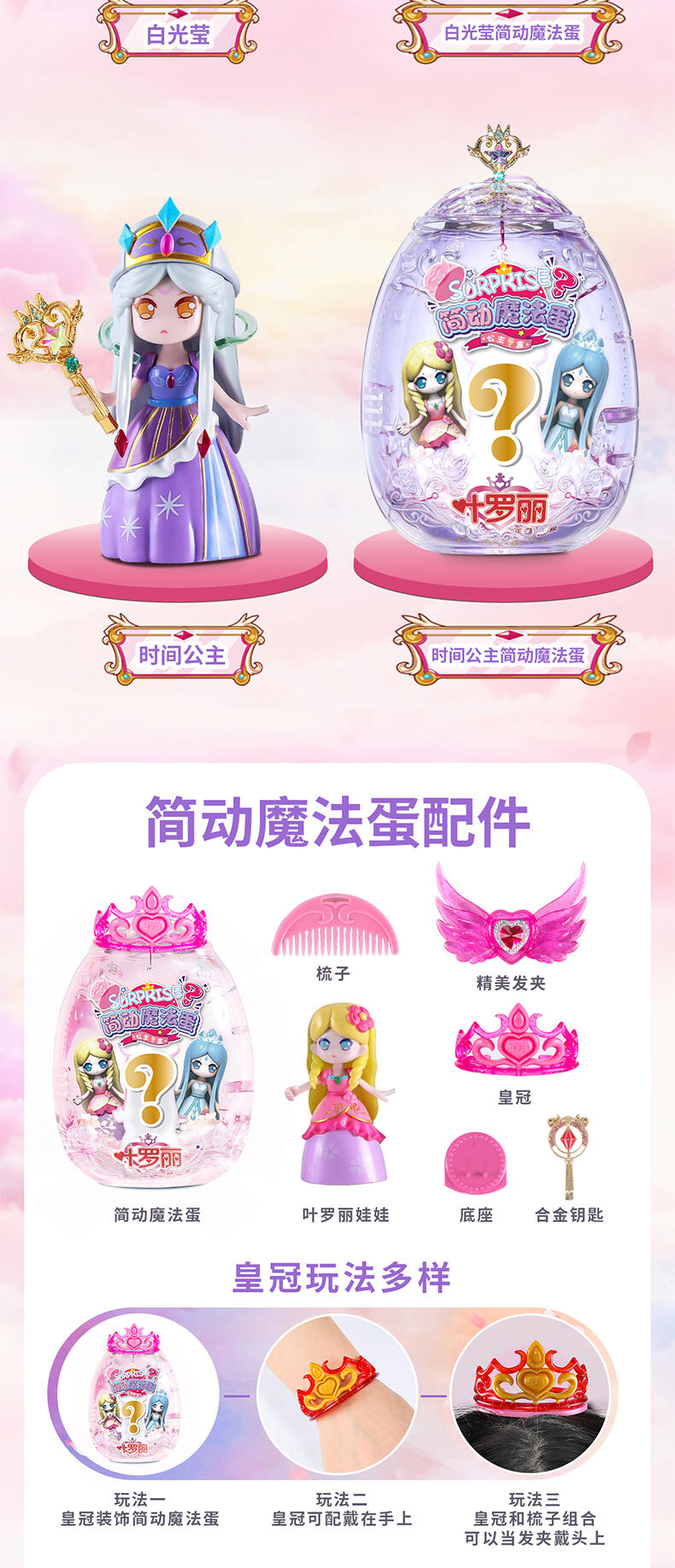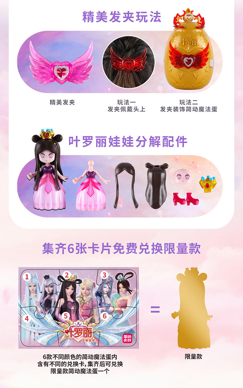 叶罗丽魔法蛋卖点:简动文创电视广告同款。国产3D动漫叶罗丽IP加持,6个IP专属人物公仔玩法丰富多样。另有精美梳子、发夹、皇冠和IP人物专属合金钥匙。集齐6张卡片还可免费兑换限量款魔法蛋一个。