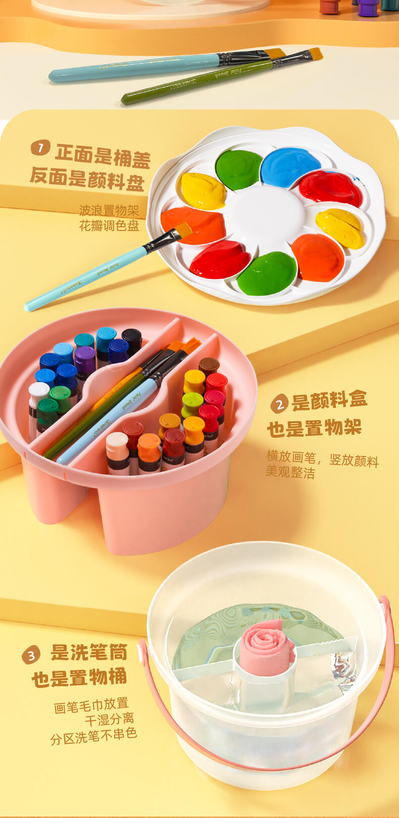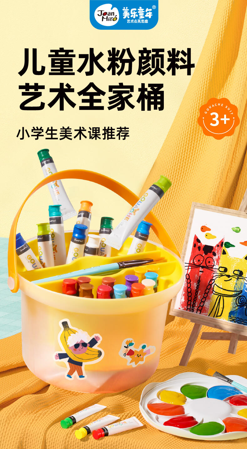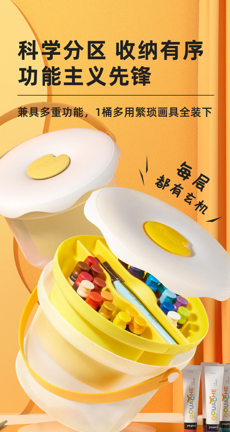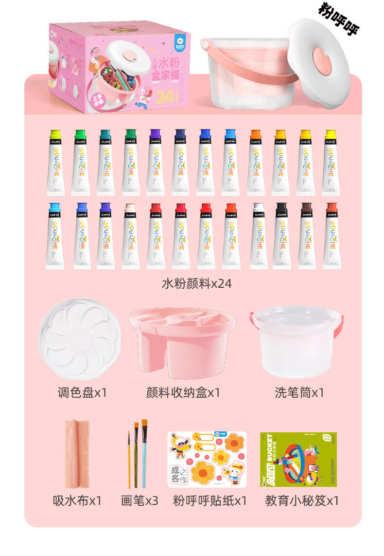 便利水粉颜料套装 1.造型圆润童趣可爱;2.功能分区,干湿分离;3.配套工具丰富;4.专属课程;5.各种专业洗笔功能设计;6.装饰贴纸;7.优质材料
