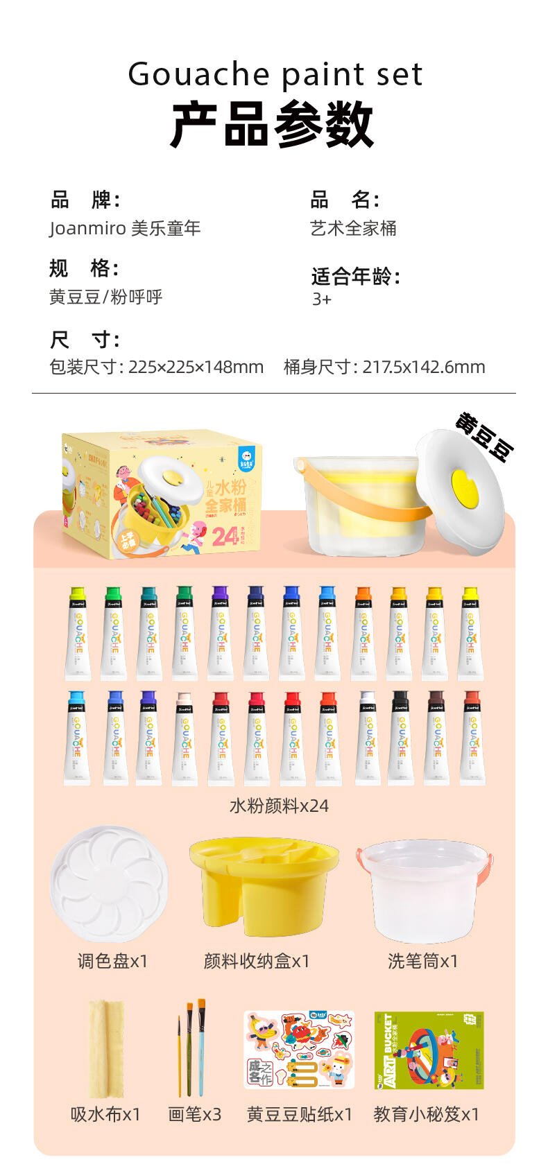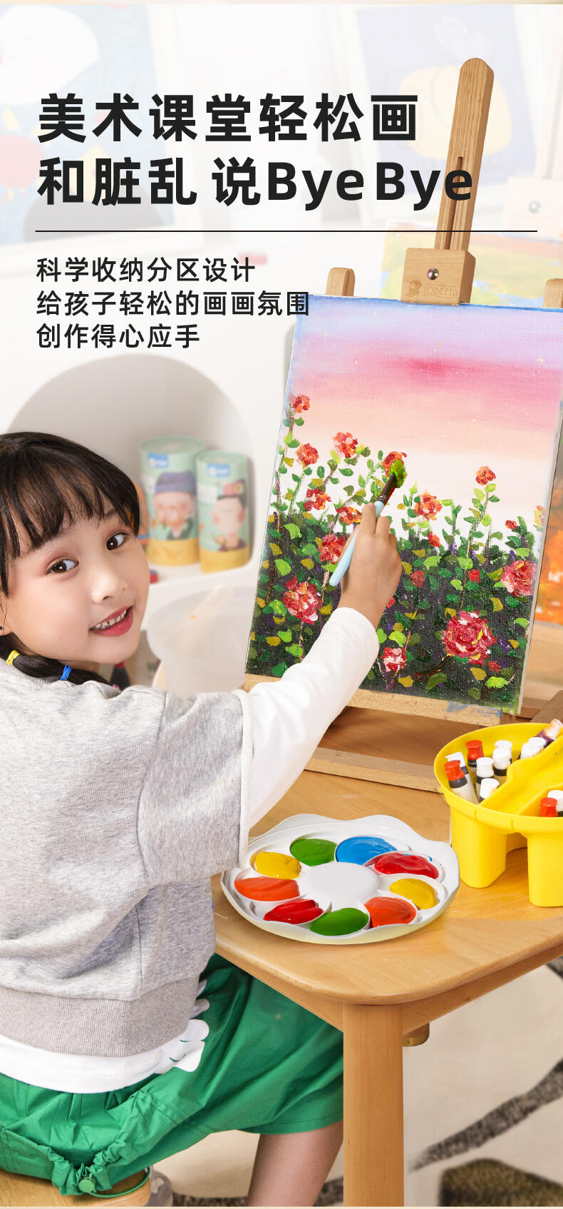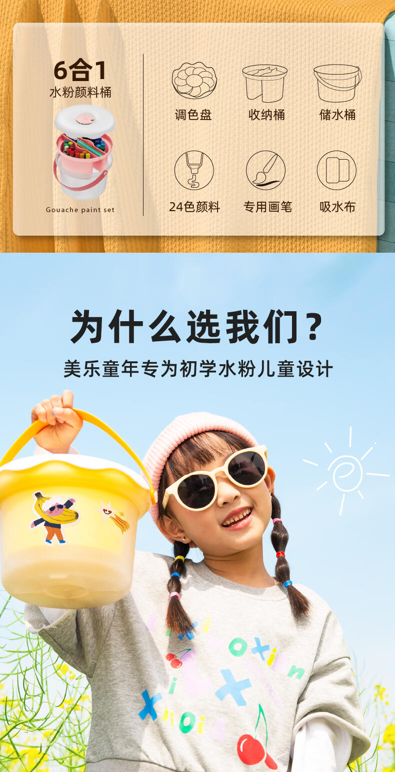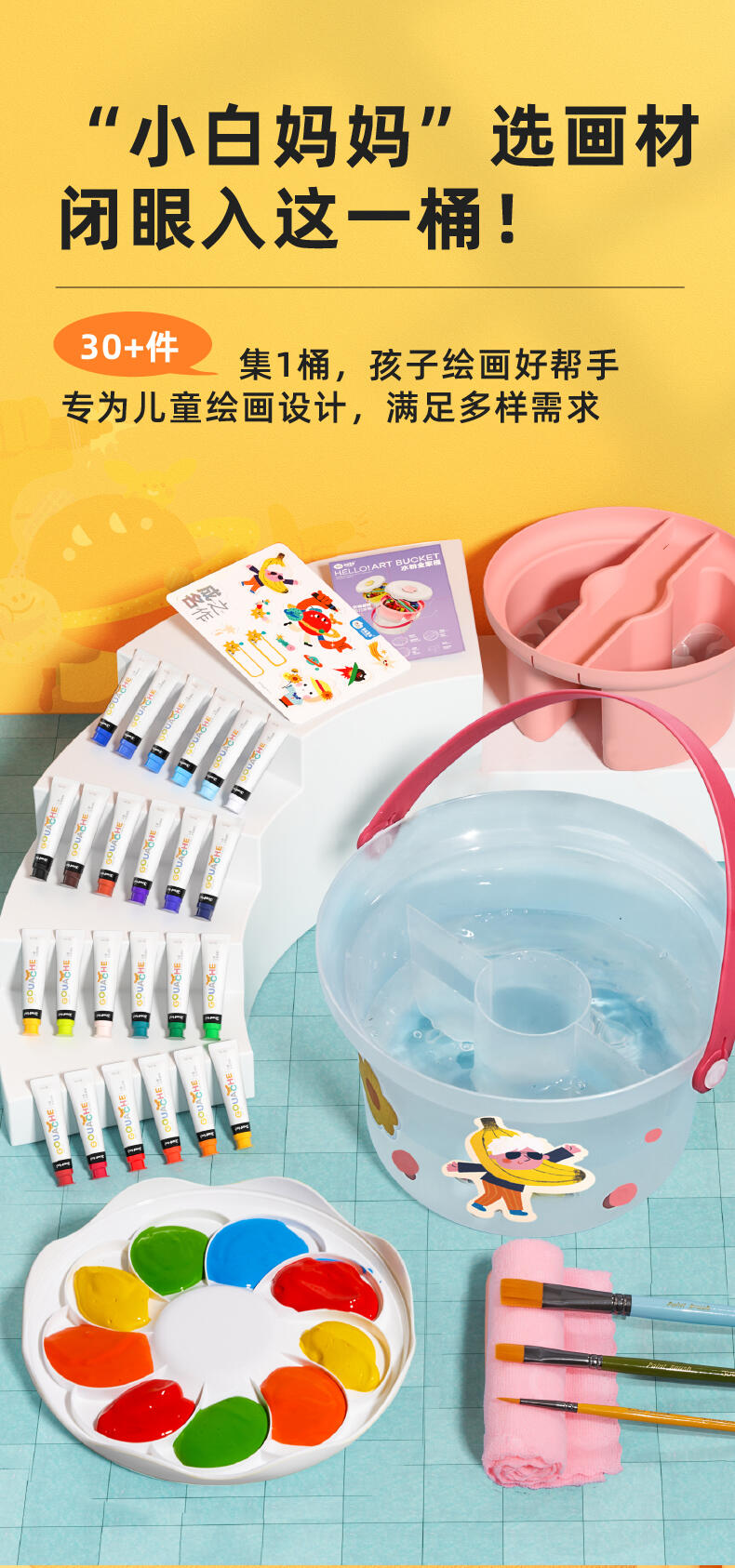 便利水粉颜料套装 1.造型圆润童趣可爱;2.功能分区,干湿分离;3.配套工具丰富;4.专属课程;5.各种专业洗笔功能设计;6.装饰贴纸;7.优质材料
