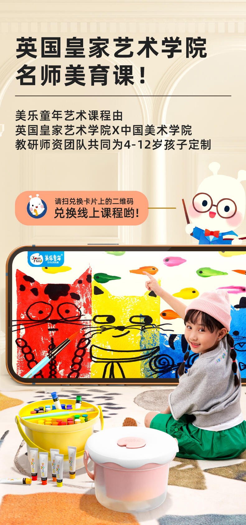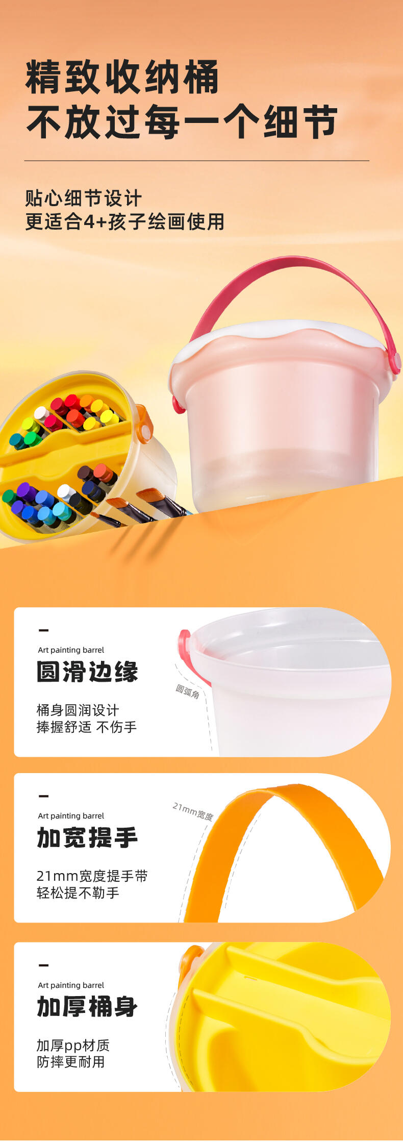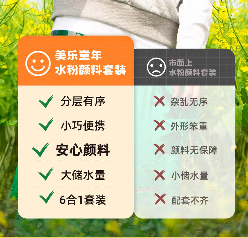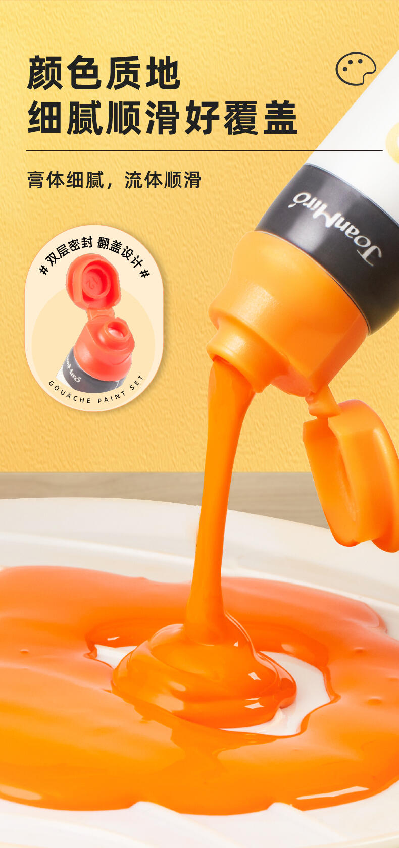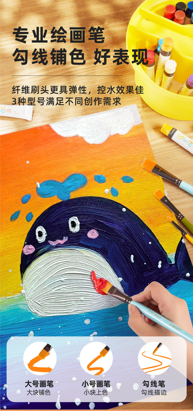 便利水粉颜料套装 1.造型圆润童趣可爱;2.功能分区,干湿分离;3.配套工具丰富;4.专属课程;5.各种专业洗笔功能设计;6.装饰贴纸;7.优质材料