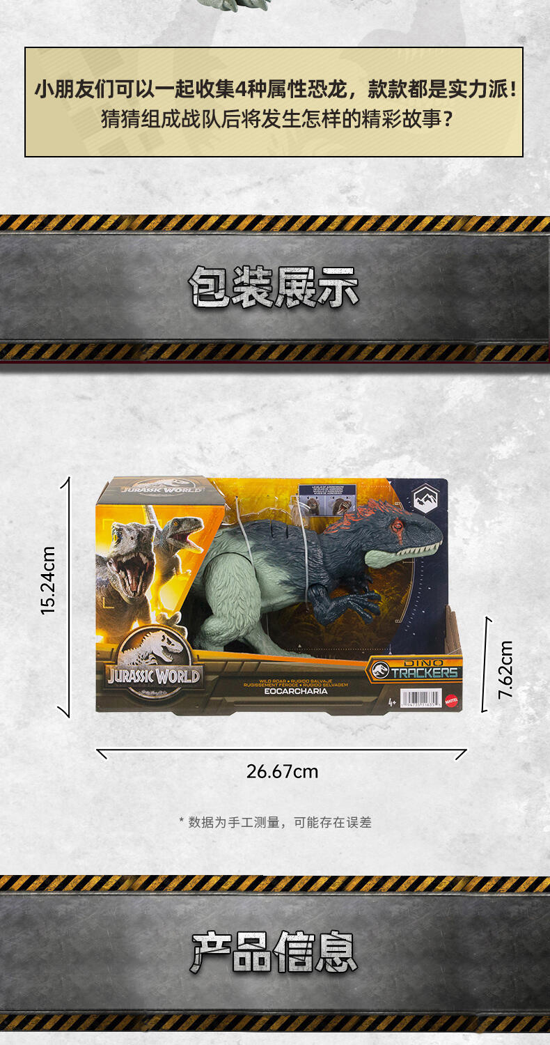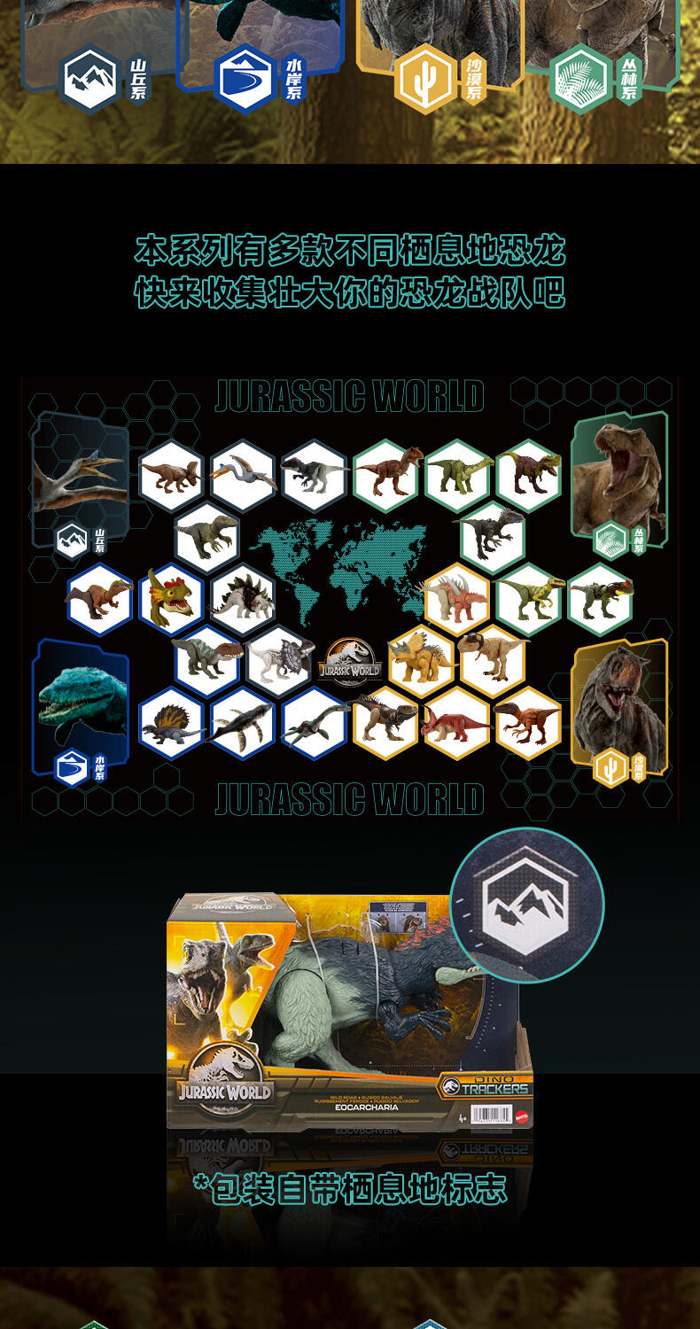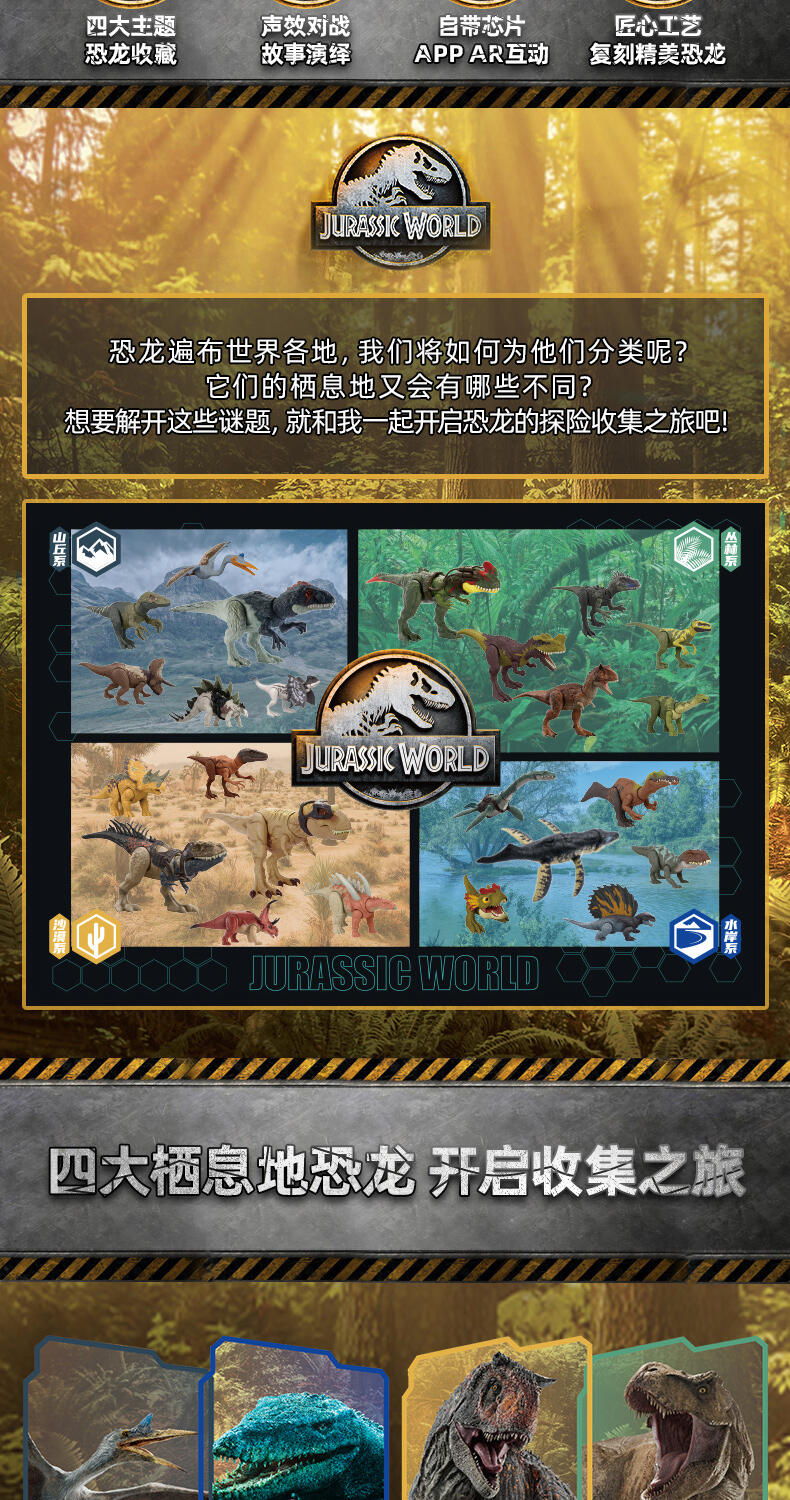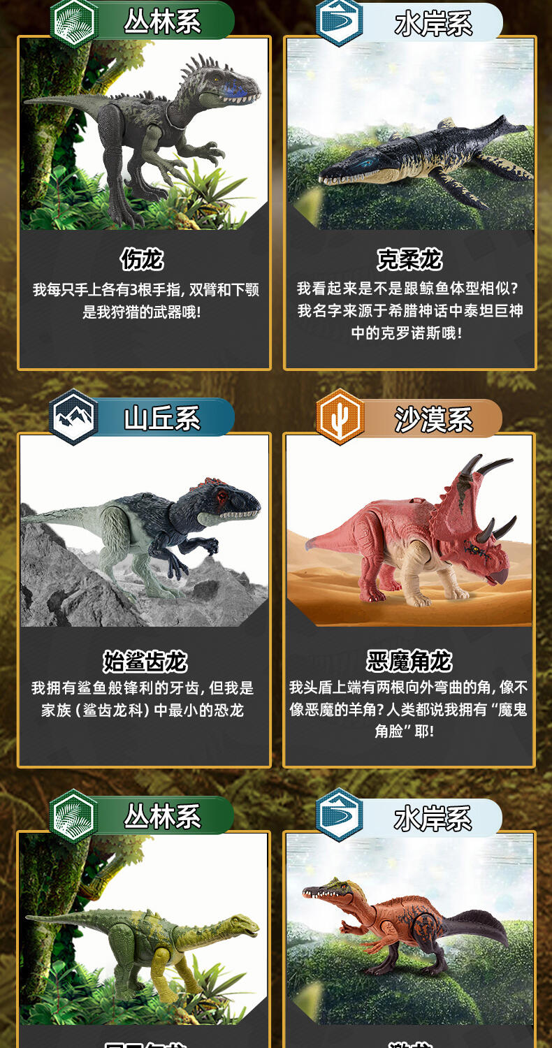 1. 产品自带为4种属性:沙漠系/丛林系/山丘系/水岸系恐龙,更好的学习恐龙知识和习性,丰富孩子的知识库!
