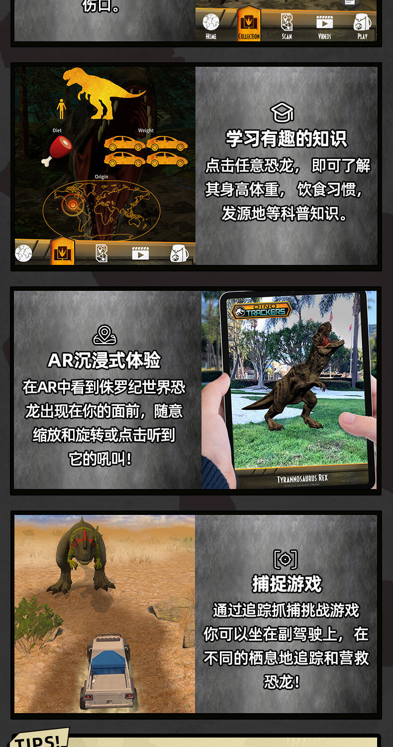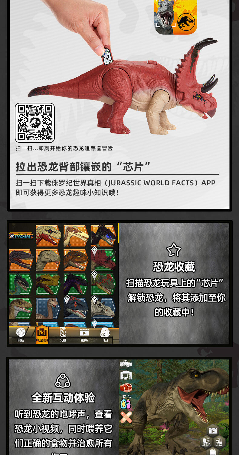 2. DNA芯片:拉出恐龙背部芯片, 使用Jurassic World侏罗纪世界真相app扫描二维码,即可了解恐龙相关知识,大玩AR游戏!