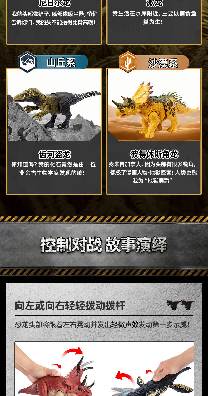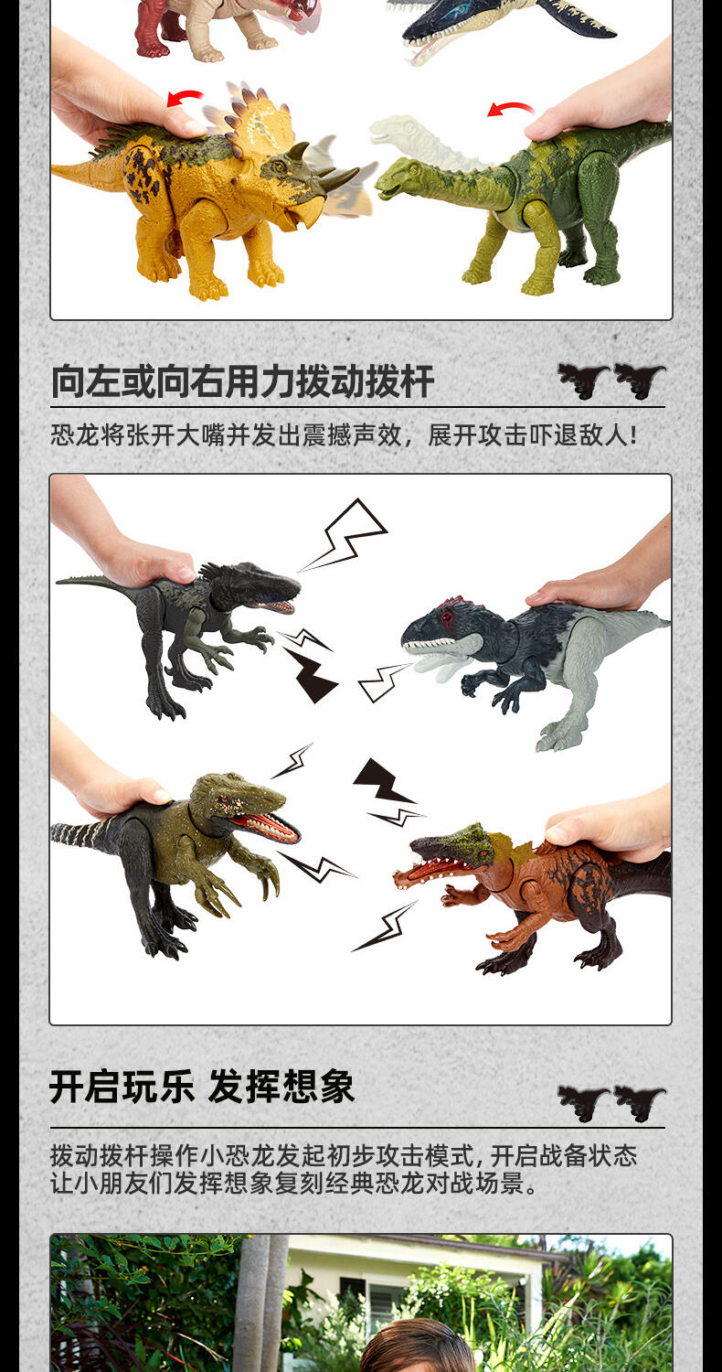 可通过身上拨杆控制恐龙发出声效攻击!向左或向右轻轻拨动拨杆,恐龙头部将跟着左右晃动并发出轻微声效发动第一步示威!向右用力拨动拨杆,恐龙将张开大嘴并发出震撼声效,展开攻击吓退敌人!