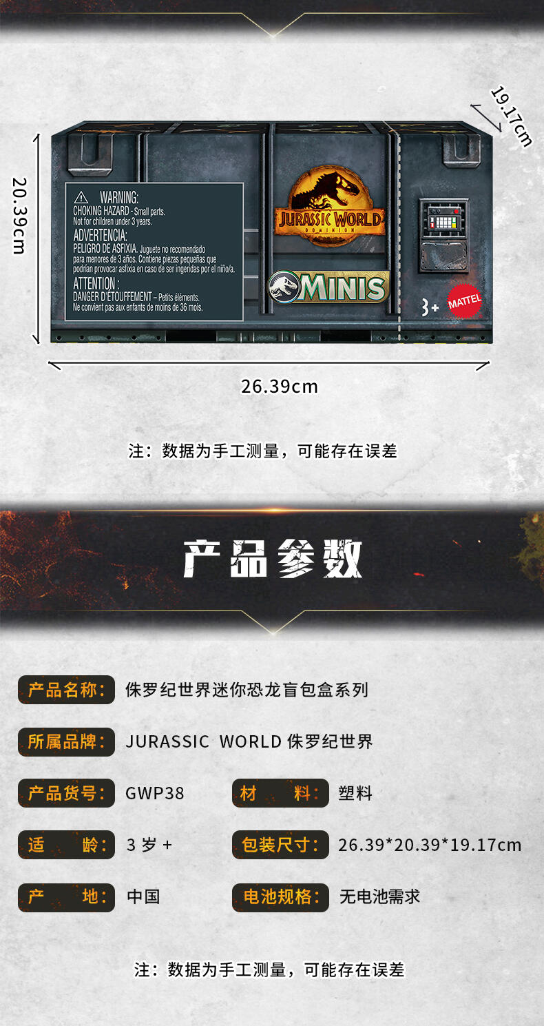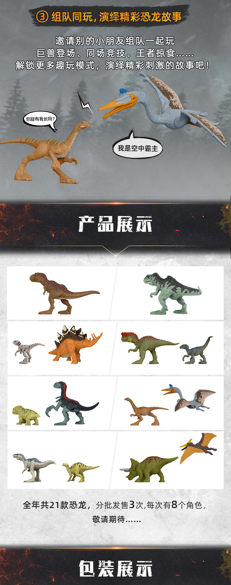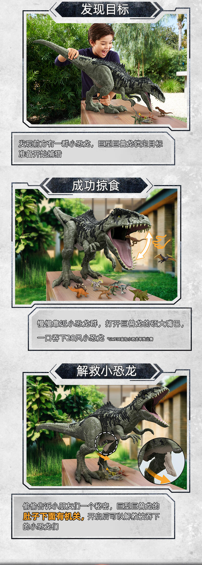 《侏罗纪世界3》 电影中新恐龙形象,与霸王龙有激烈对战场景! • 小心!这只巨型龙大约有1米左右长,具有逼真的细节和装饰,可以吞食20只基础款竞技恐龙(单独 出售)! • 手部脚部关节可动! • 下巴可以张开和闭上,并展开攻击!