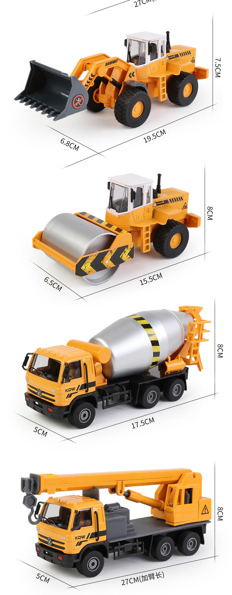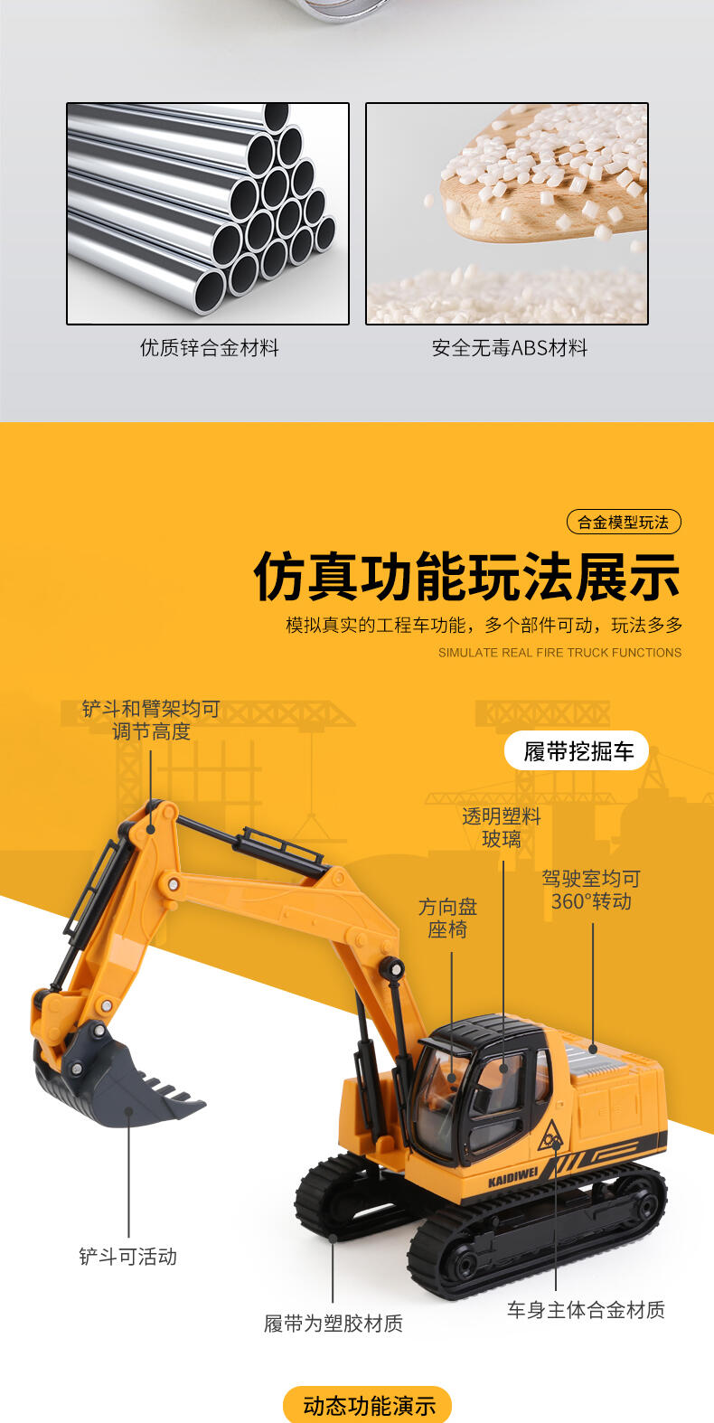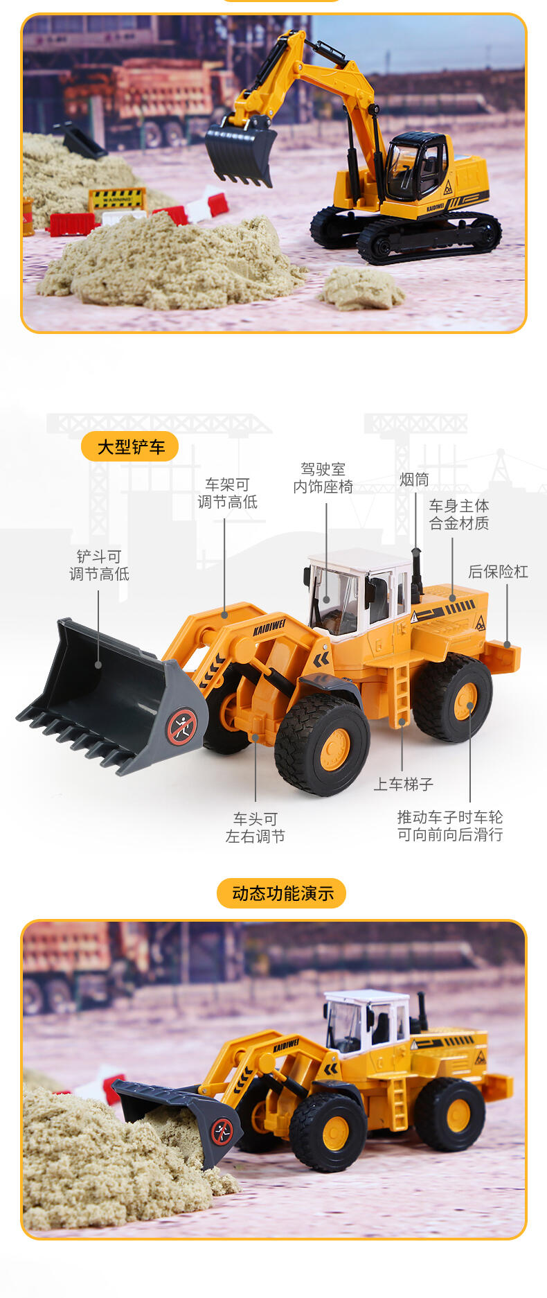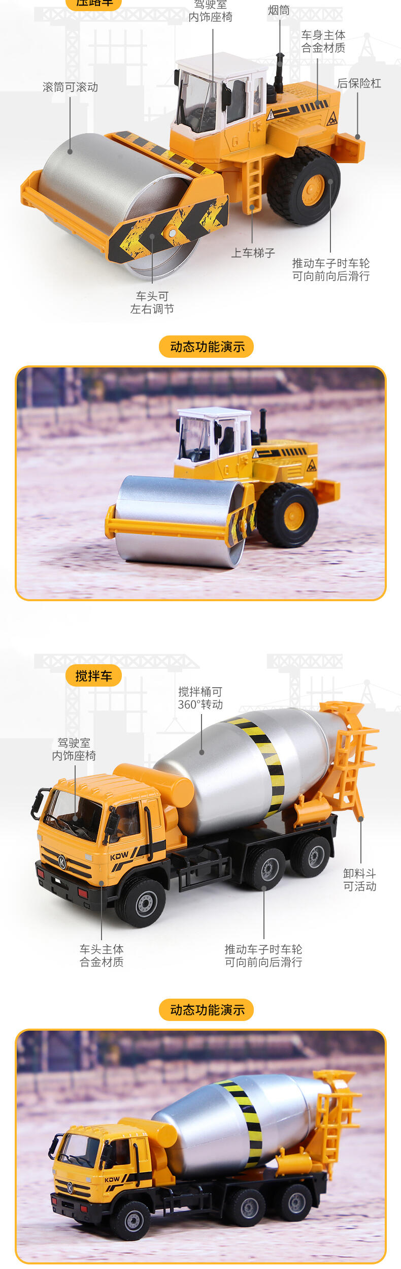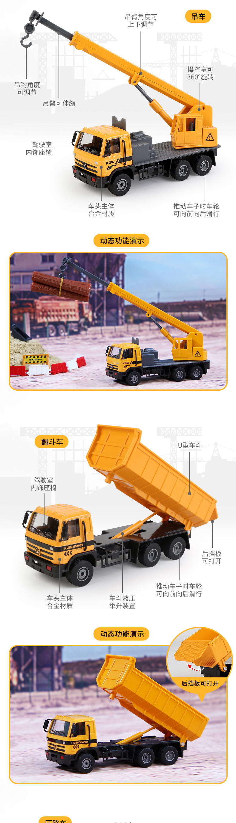 1.大型铲车:推动车子向前向后,轮子均有滑行功能.铲斗架均可调整高低定位功能铲斗向上向下收缩定位功能。车头均可左右转向定位功能。 2.翻斗车:推动车子向前向后,履带均有滑行功能.翻斗车斗均可上下活动定位功能。翻斗车斗盖均可打开活动定位功能。 3.履带挖掘车:推动车子向前向后,履带均有滑行功能.铲斗臂架均可调整高低定位功能.驾驶均可360度旋转定位功能。.车子铲斗均可折弯定位功能。 4.搅拌车:推动车子向前向后,轮子均有滑行功能.搅拌桶均360度旋转活动定位功能。卸料斗均可左右转动打开活动定位功能。 5.压路机:.推动车子向前向后,轮子均有滑行功能。.前压轮均可左右转动定位功能。.推动车子压轮均有旋转功能。