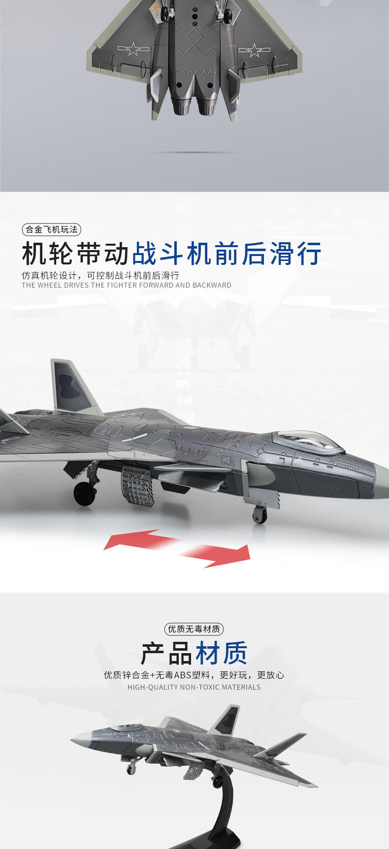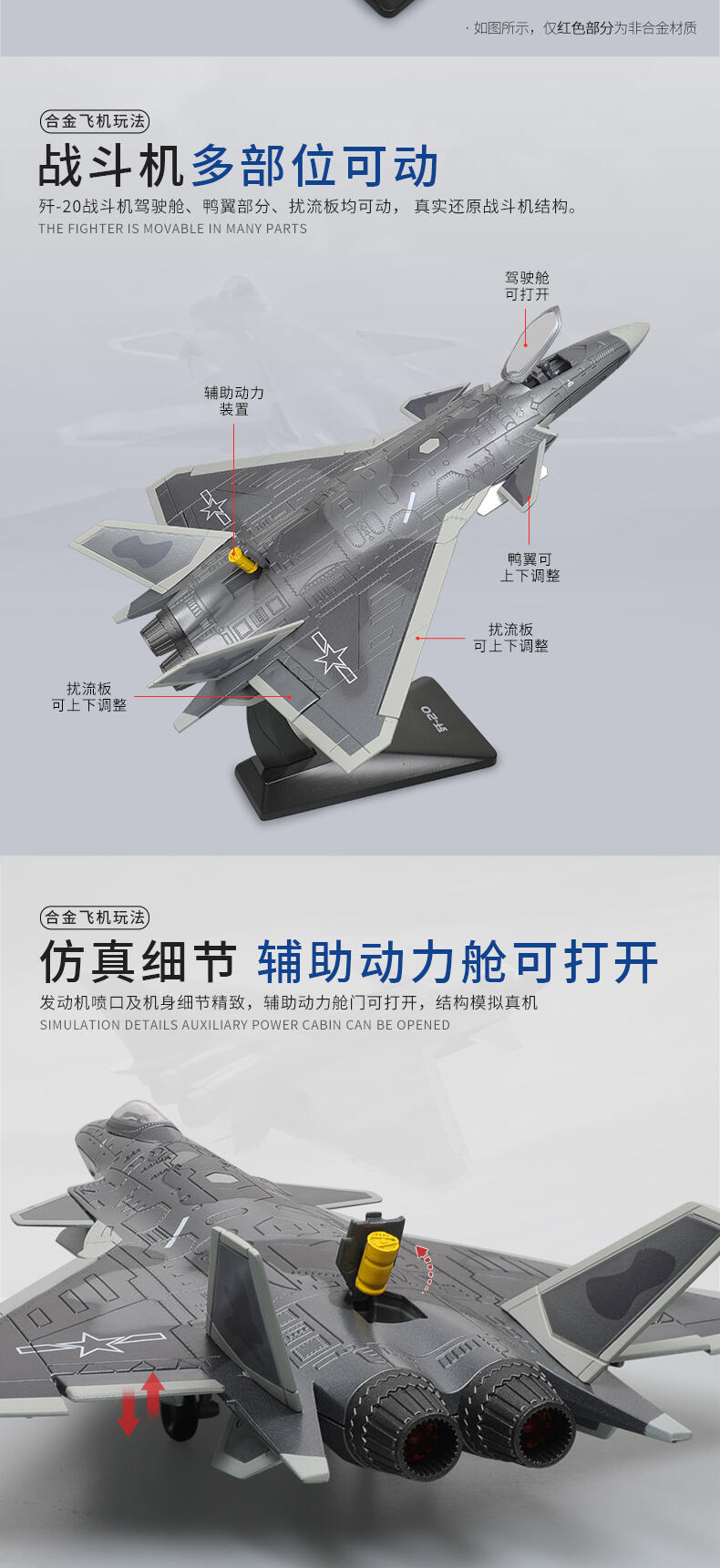 1.战机可前后滑行功能。2.机舱门可打开功能。3.鸭翼可上下调整活动功能。4.拢流板可左右调整活动功能。5.辅助动力装装置盖可打开功能。6.合金支架与飞机可拆装功能。