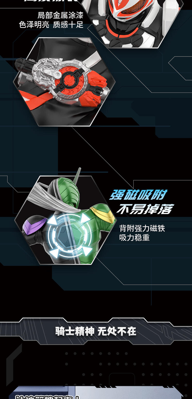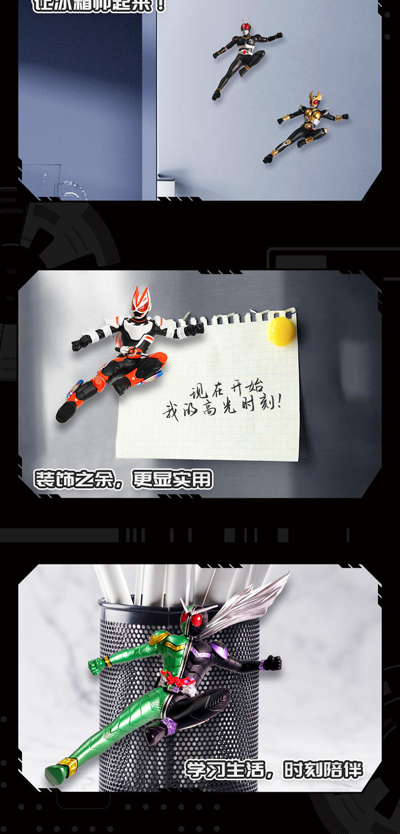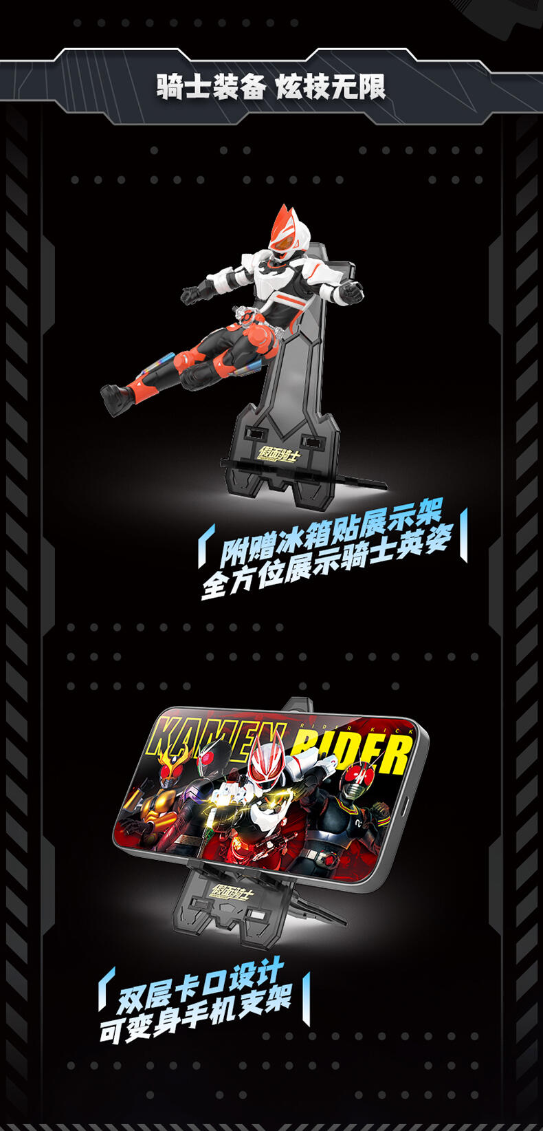 1、立体造型手办公仔,精细涂装,高还原经典骑士飞踢姿势 2、内含磁石,可做冰箱贴,兼具实用性 3、附赠手机支架,可用磁石吸附其上,炫酷外观更加分