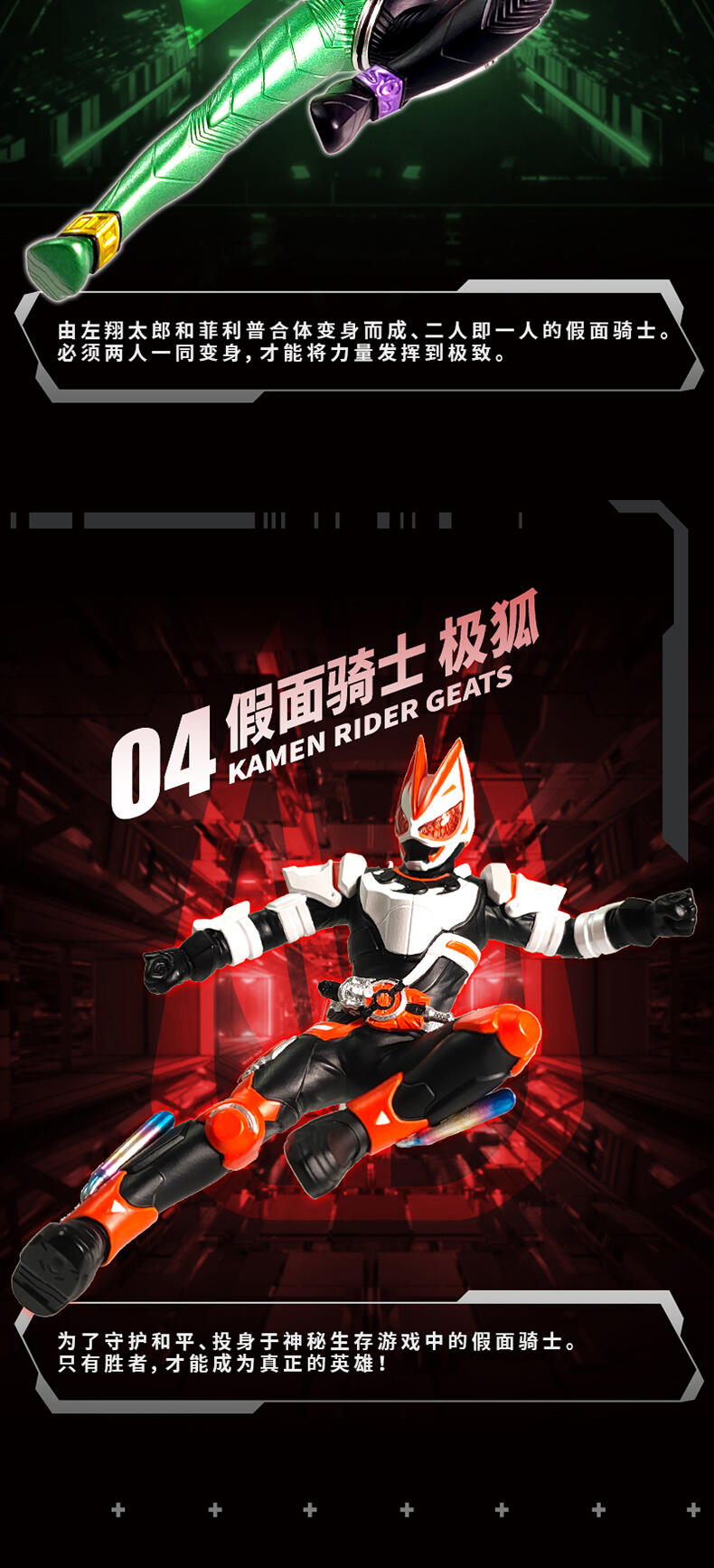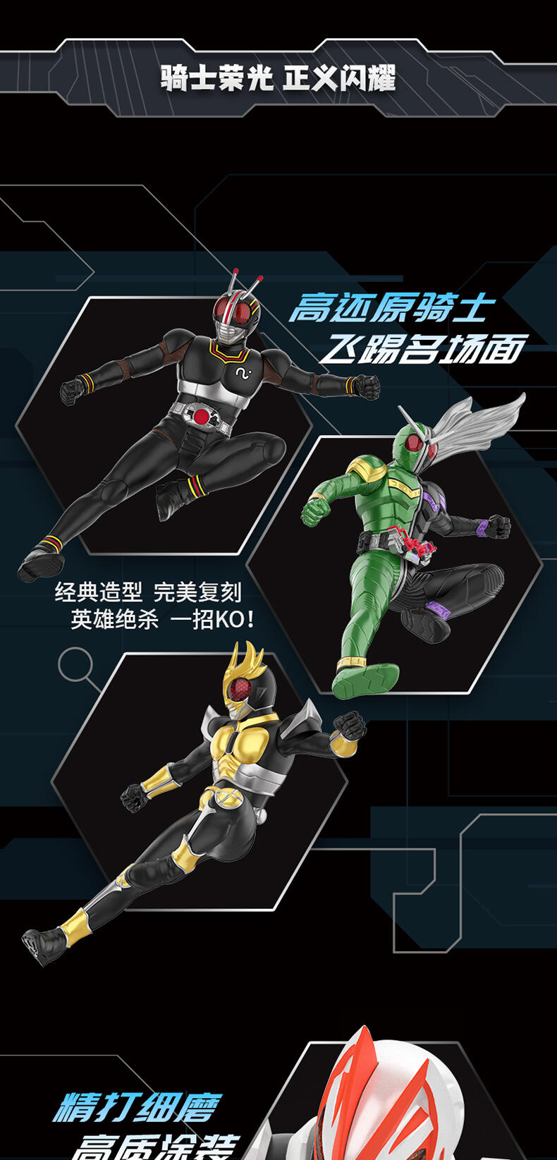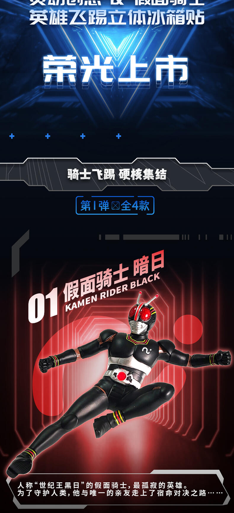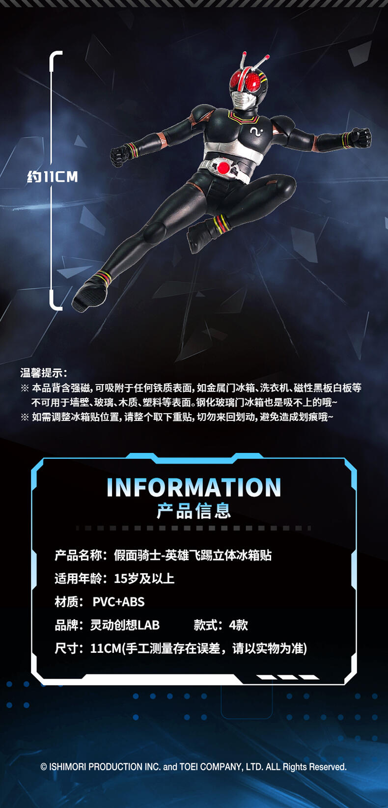1、立体造型手办公仔,精细涂装,高还原经典骑士飞踢姿势 2、内含磁石,可做冰箱贴,兼具实用性 3、附赠手机支架,可用磁石吸附其上,炫酷外观更加分