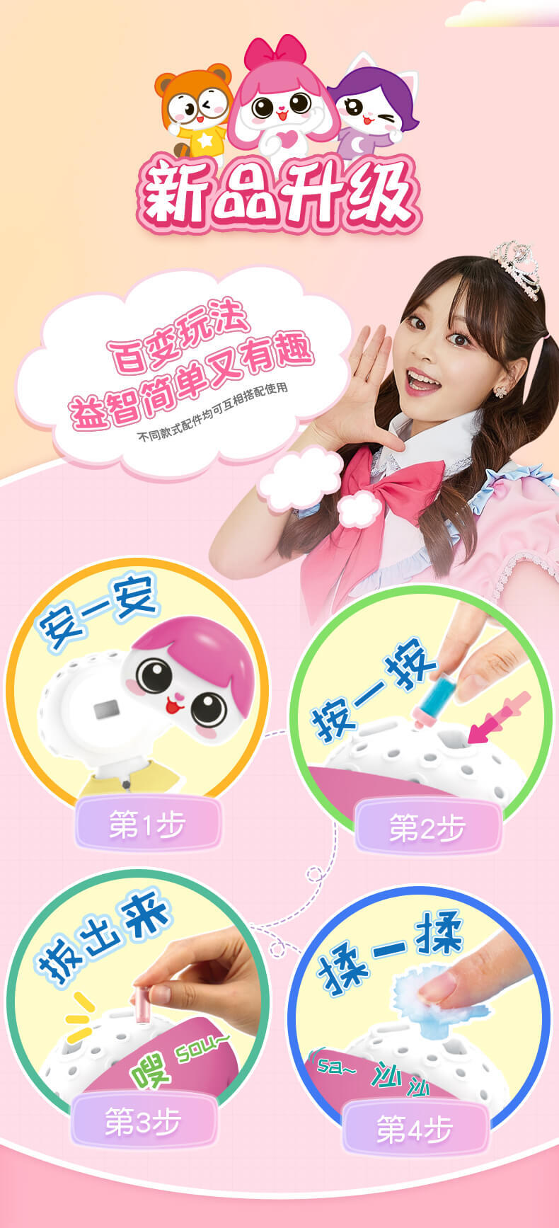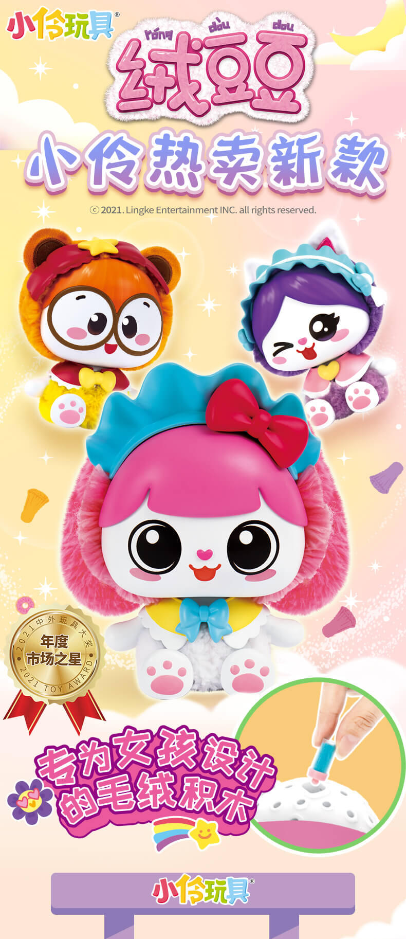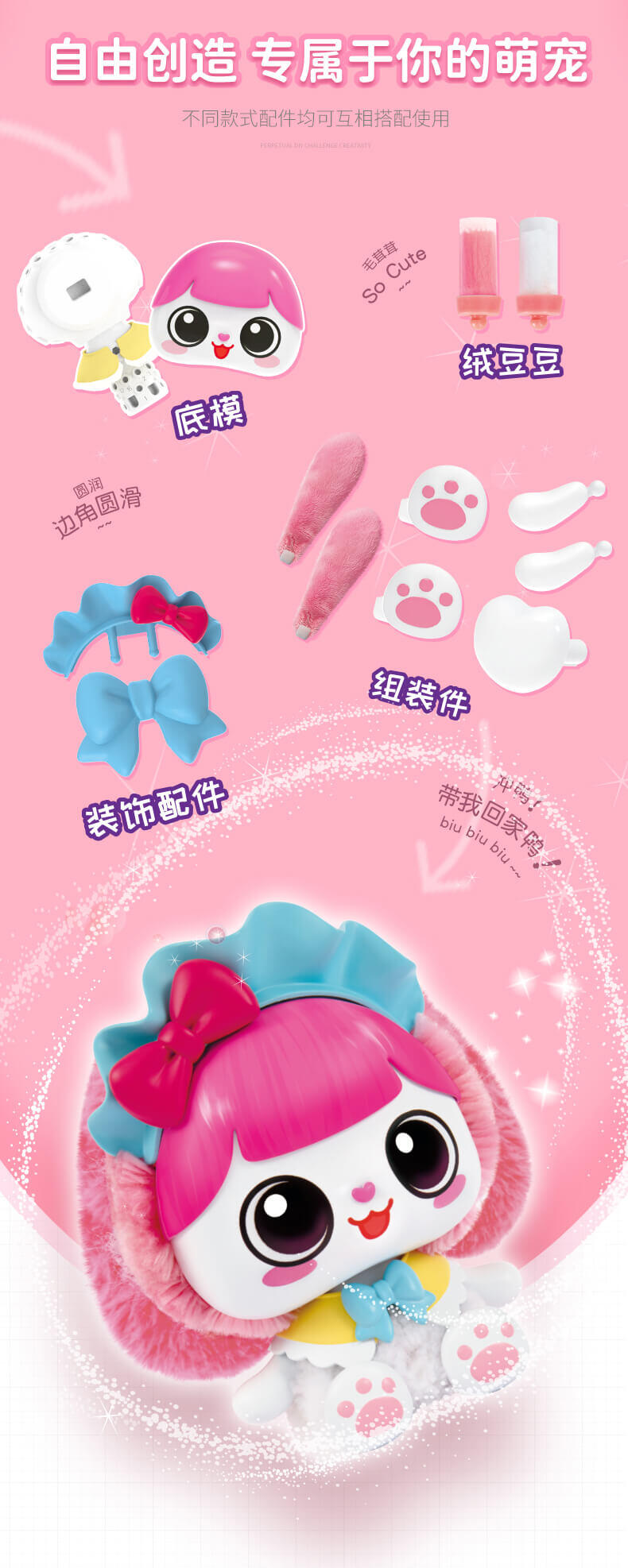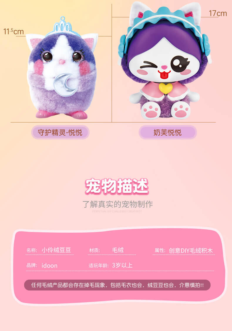 我是毛绒玩具,掉毛是正常现象哦,需要轻柔对待。可爱形象,趣味玩法。DIY属于自己的萌宠小天地,一起制作五彩缤纷的绒豆豆吧!