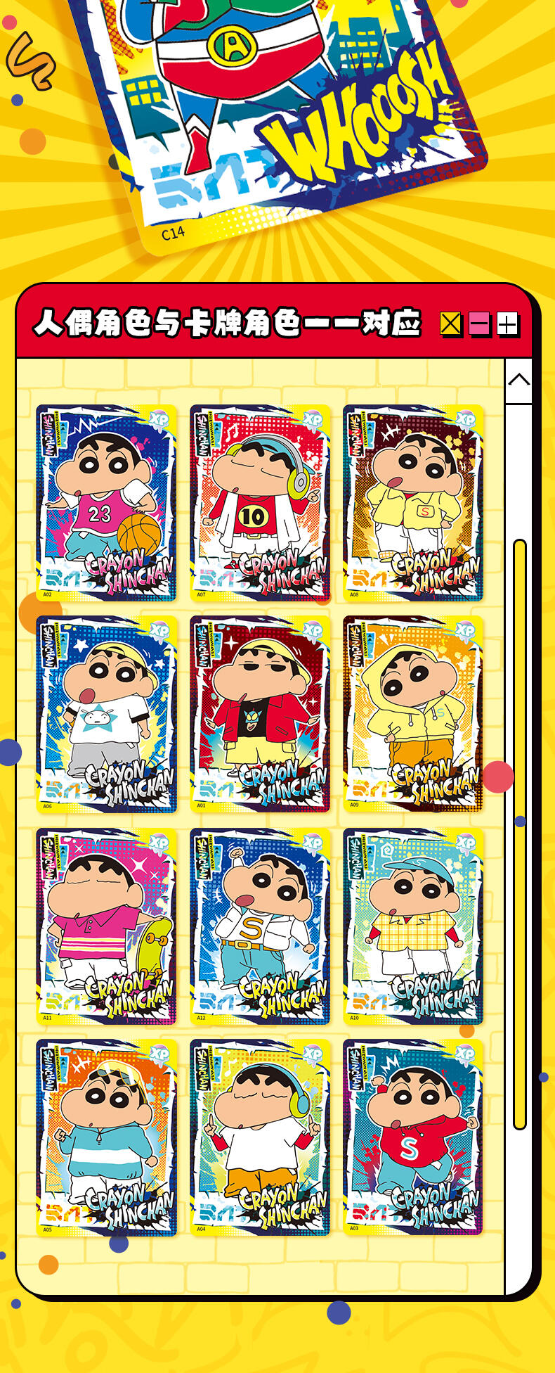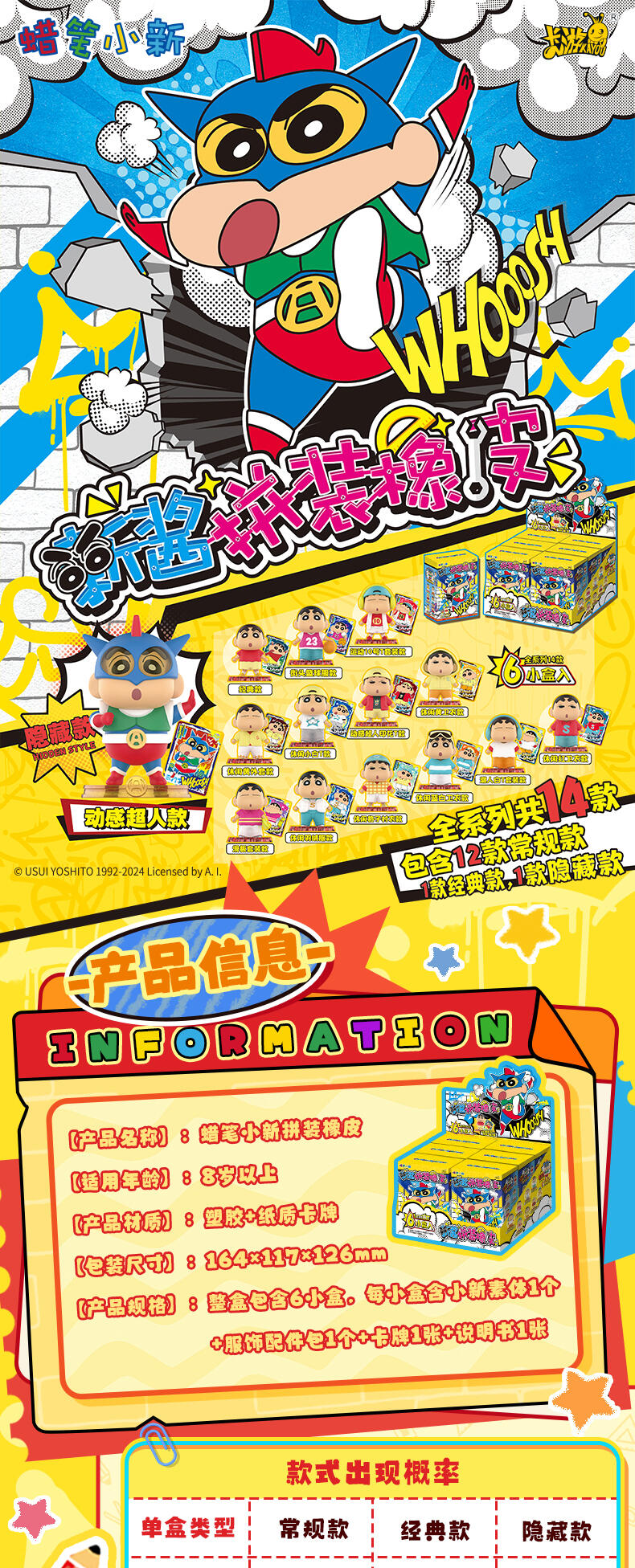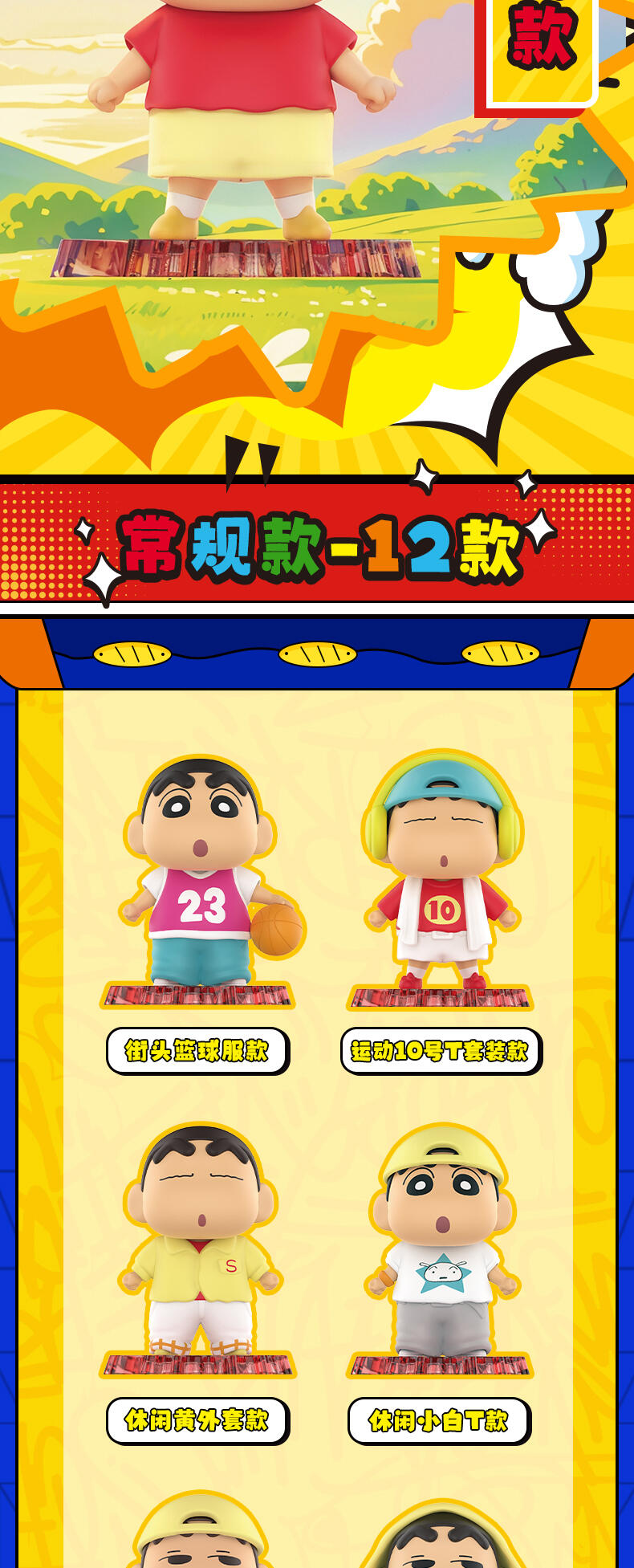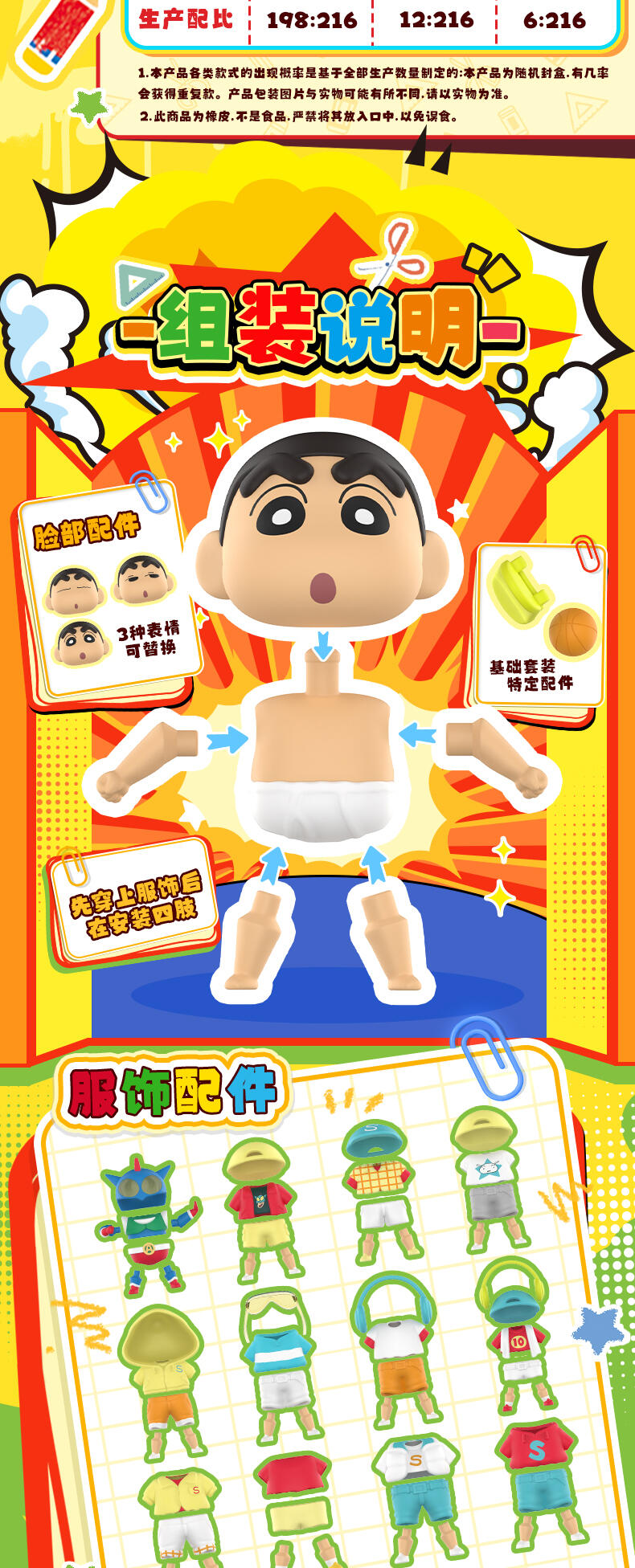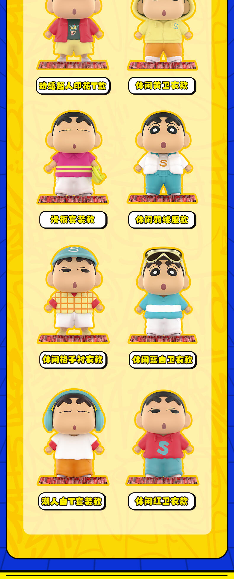 搞怪小新形象,趣味横生;多套衣服可拆卸替换,可玩性强;惊喜盲盒,各种款式打造专属的收藏