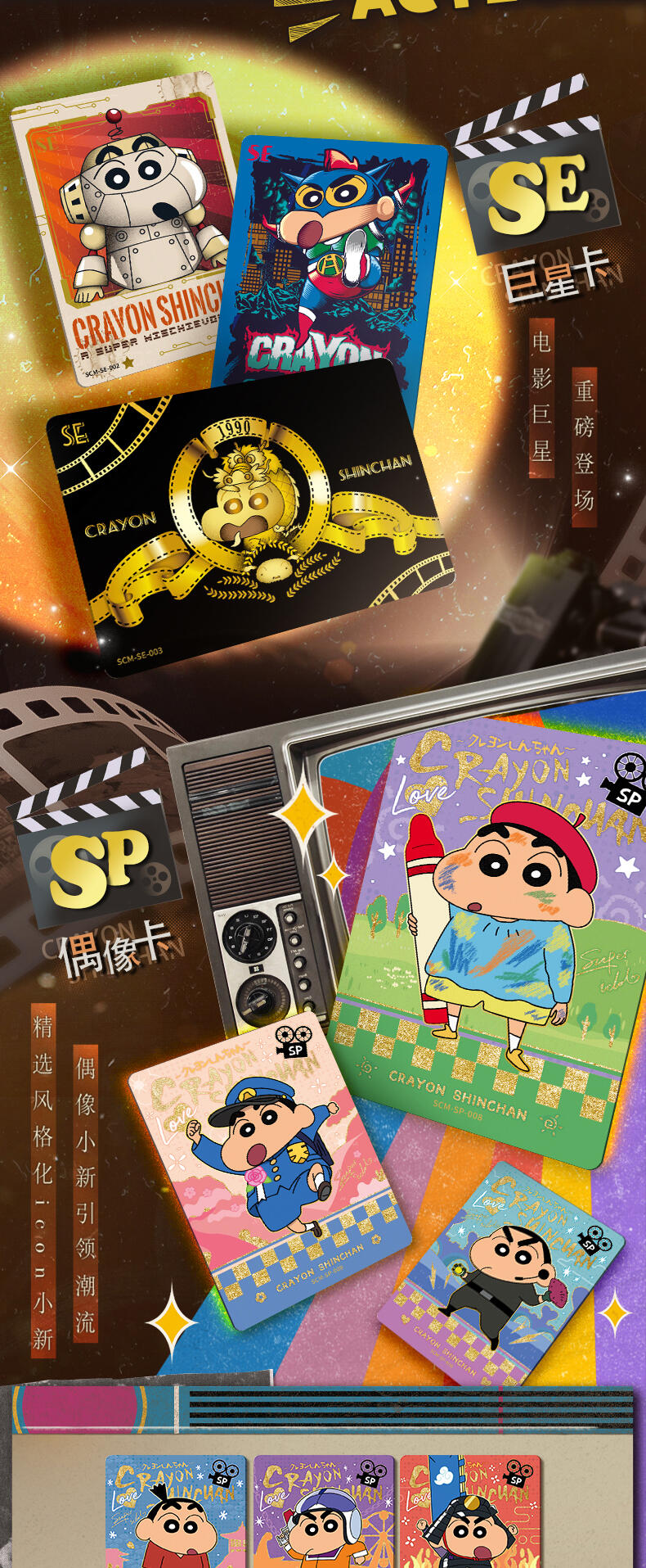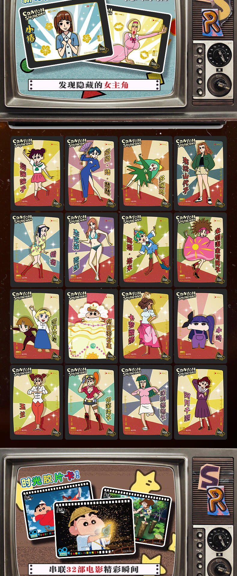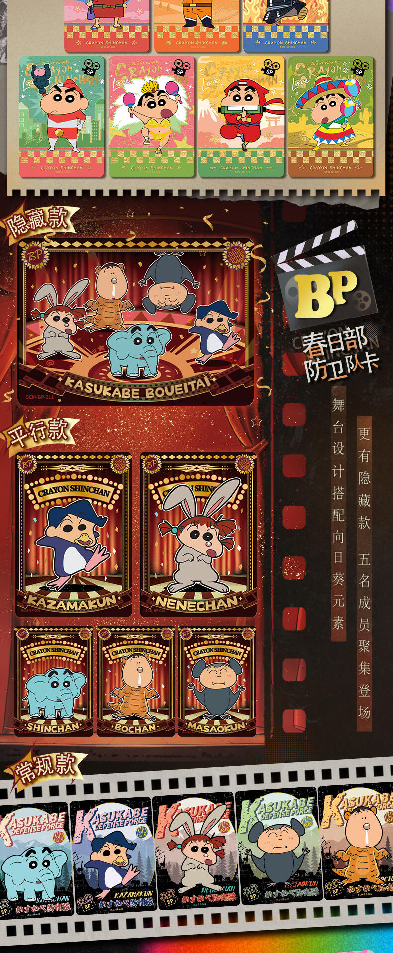 该产品收录了8张卡种,包含了巨星卡,偶像卡,春日部防卫队卡,正义使者卡,大魔王卡,新的女主角卡,时光胶片卡,选角卡