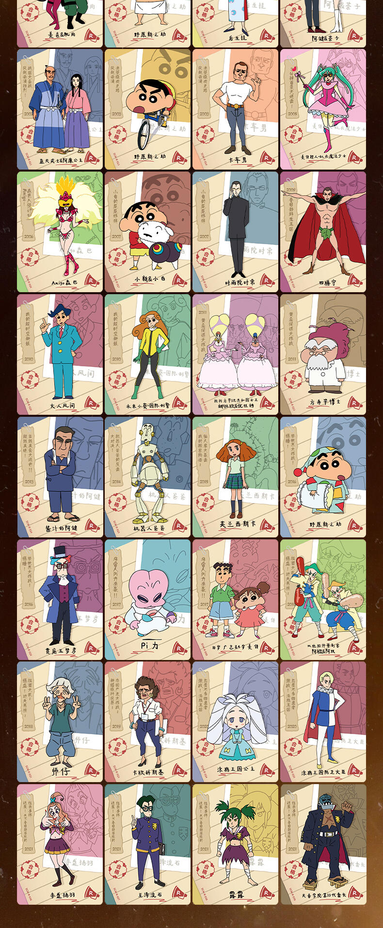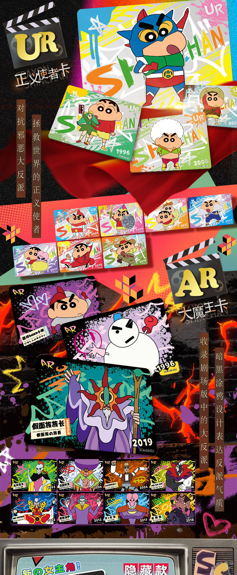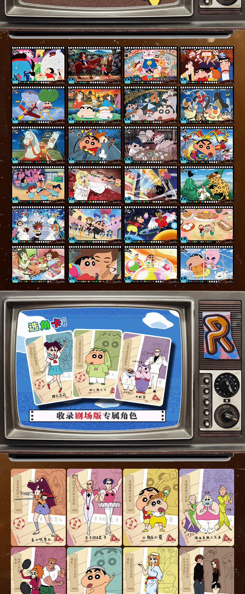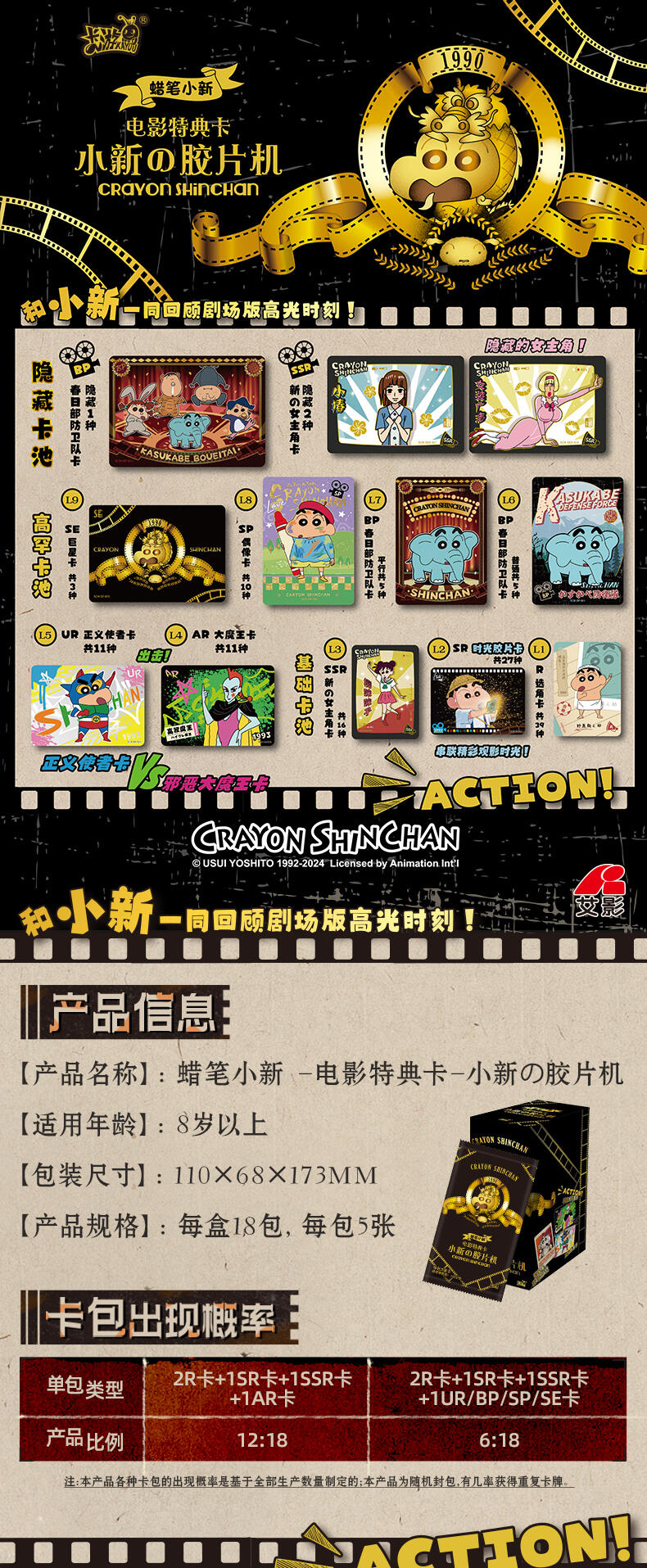 该产品收录了8张卡种,包含了巨星卡,偶像卡,春日部防卫队卡,正义使者卡,大魔王卡,新的女主角卡,时光胶片卡,选角卡