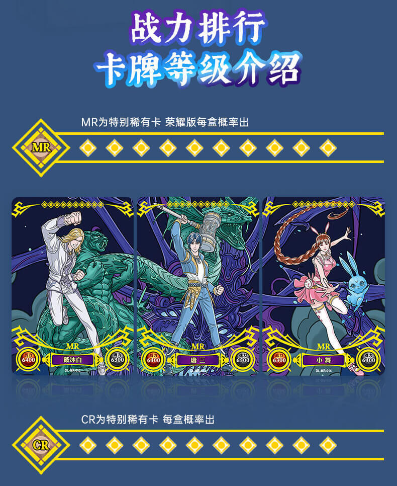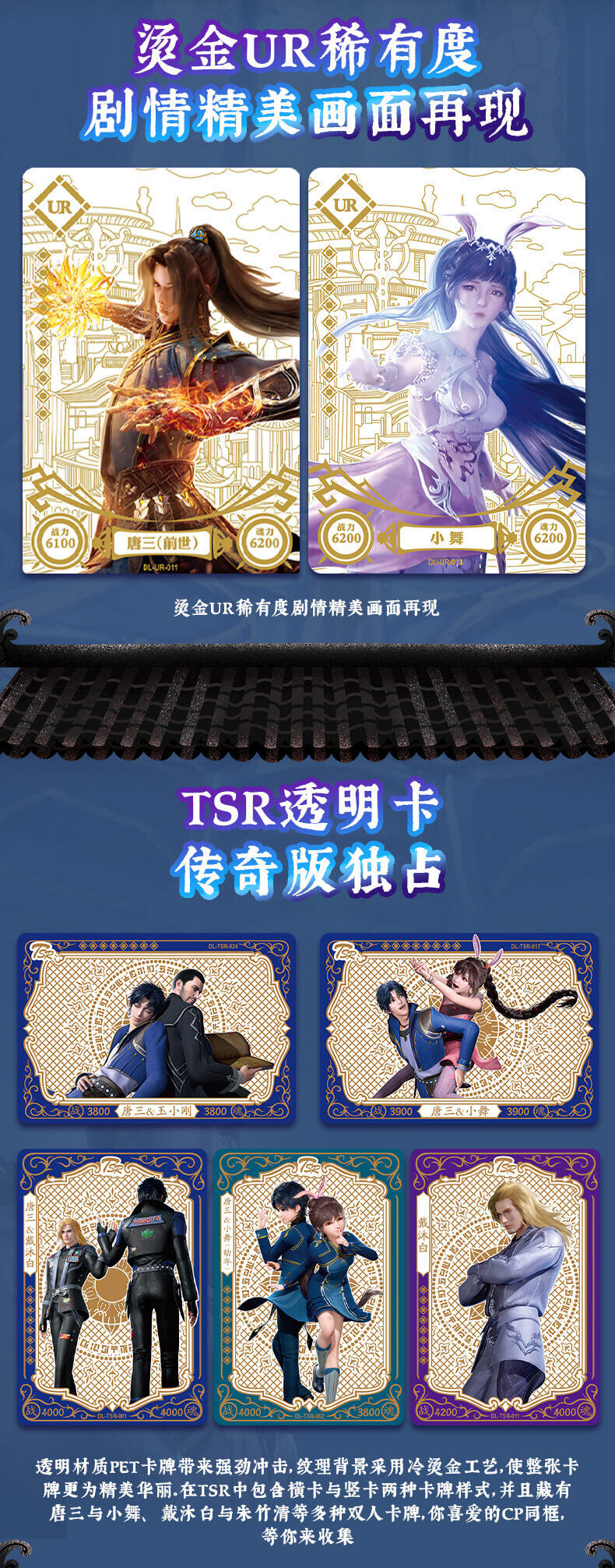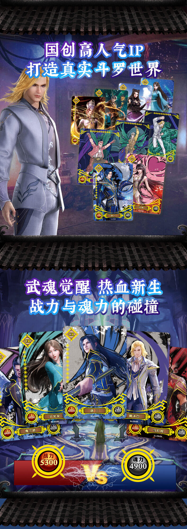 斗罗大陆动画武魂收藏令是播放量超过200亿的热门动画《斗罗大陆》的卡牌产品,在这款“武魂收藏令”中,除了以唐三、小舞、戴沐白为首的史莱克七怪之外,还加入了黄金铁三角、力之一族、武魂殿、各大学院、魂兽等各势力的众多角色,搭配卡面的精细工艺,再现斗罗大陆武魂觉醒的精彩。