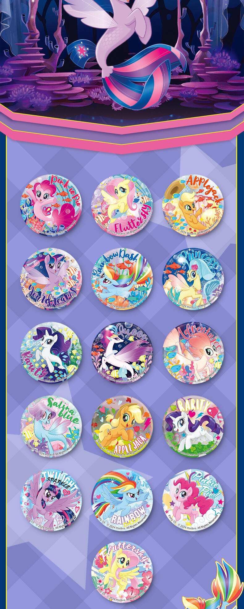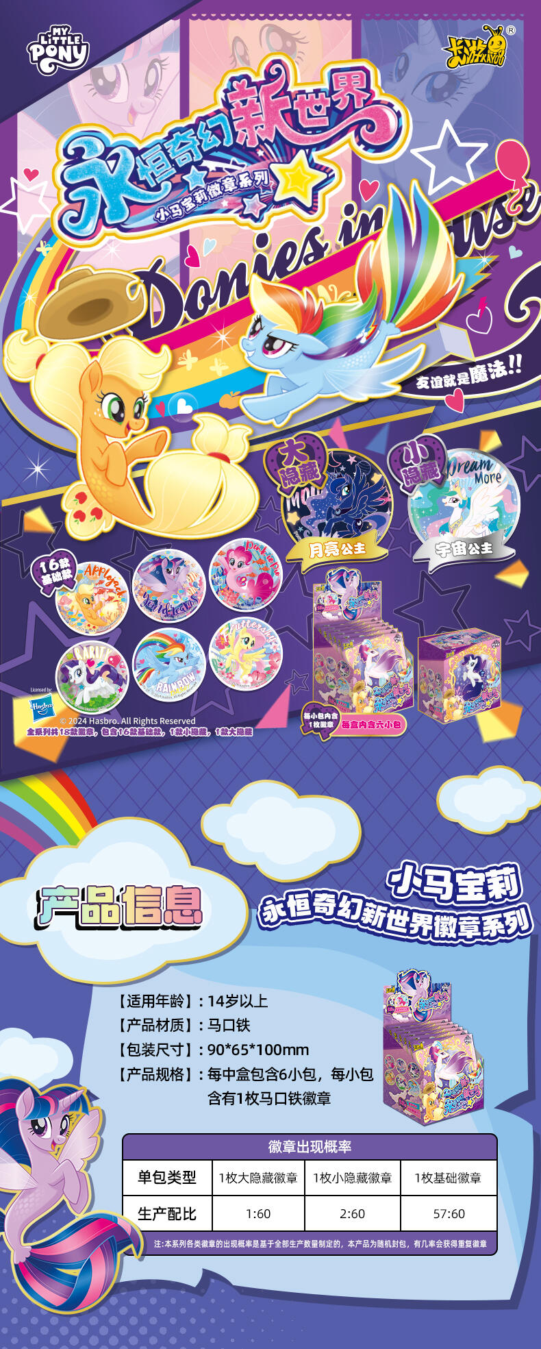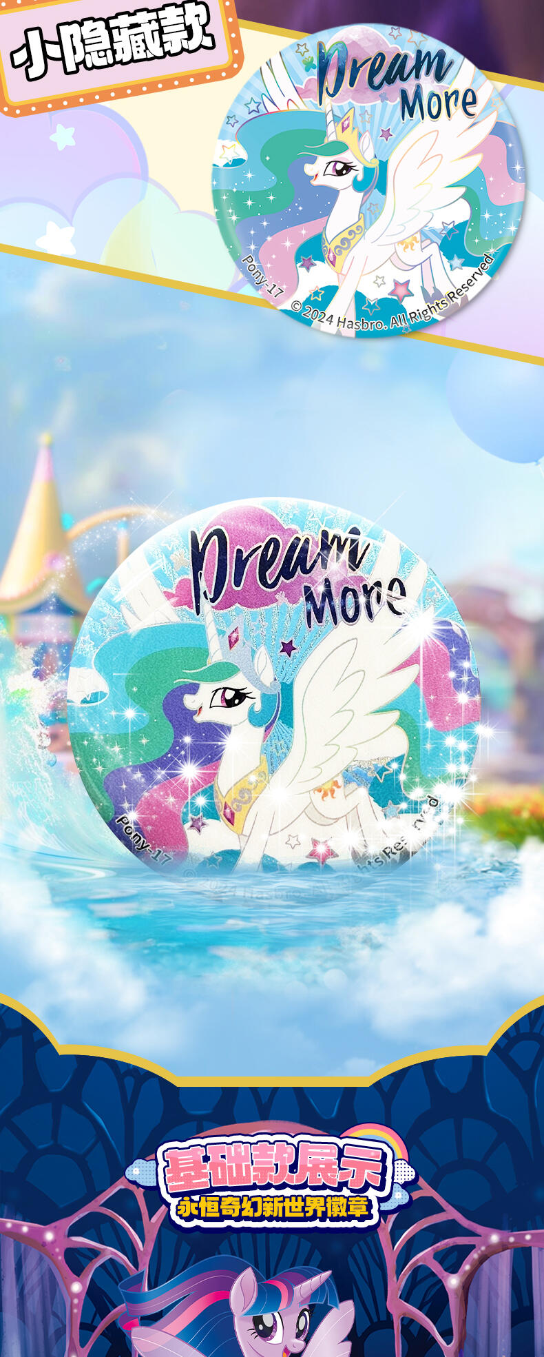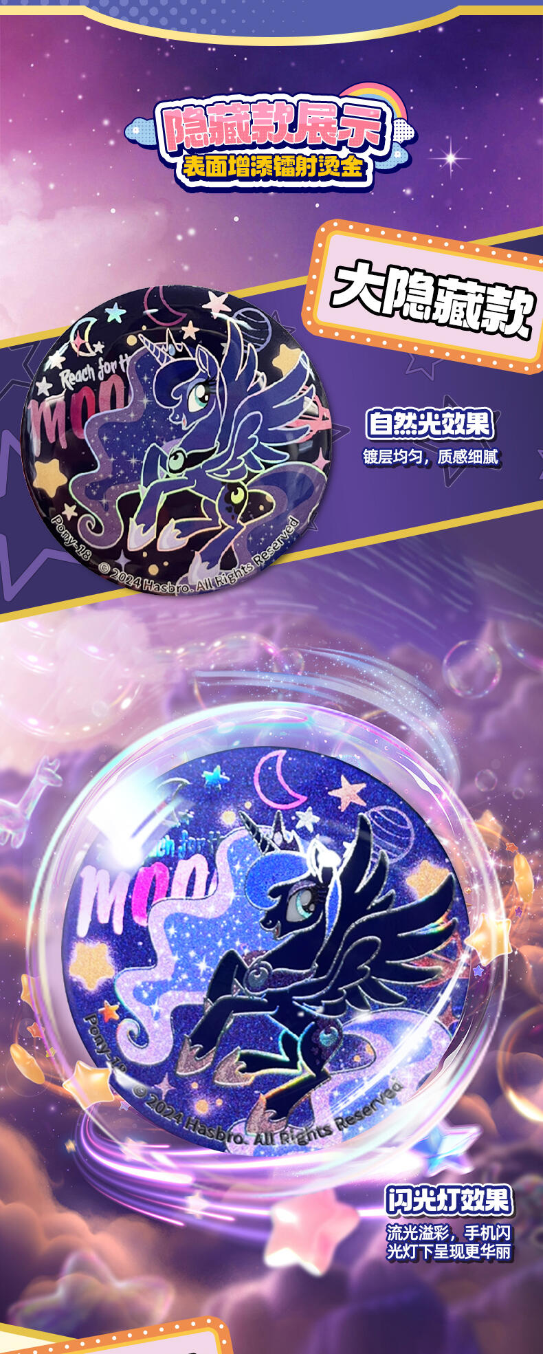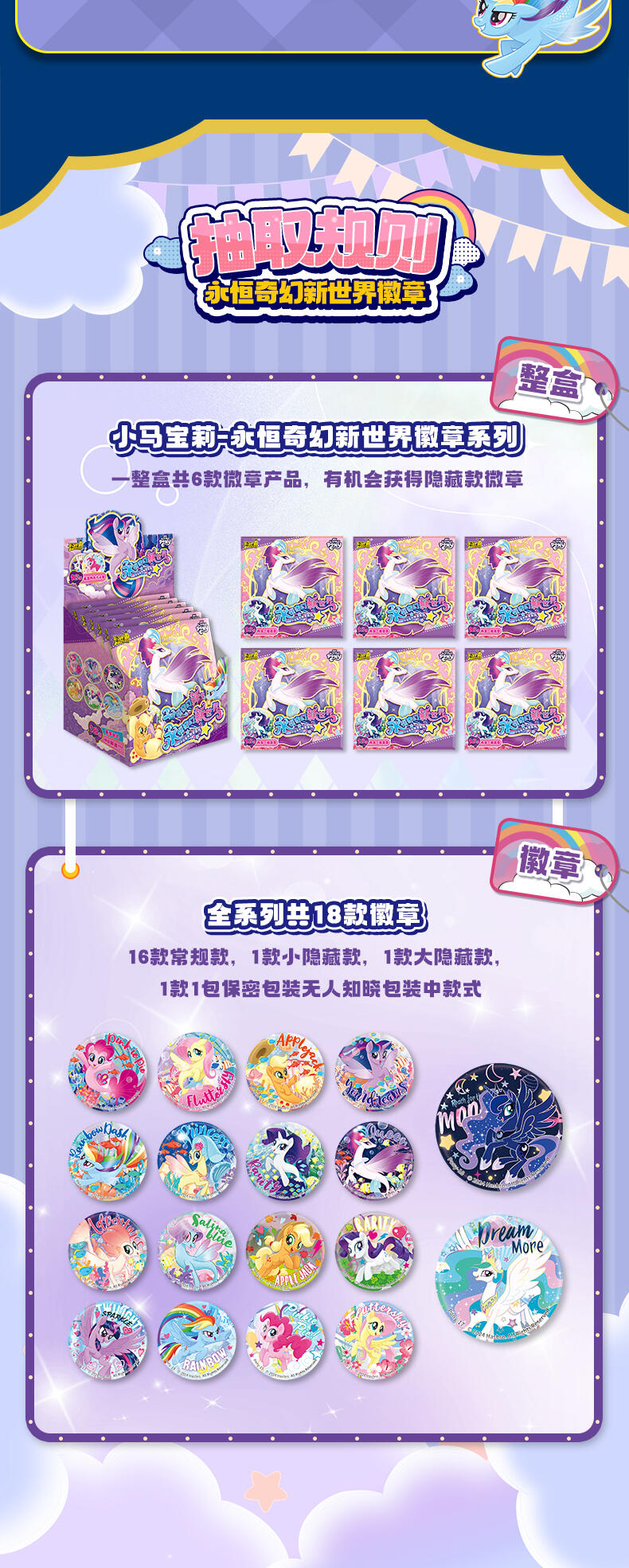 卡游 小马宝莉 - 永恒奇幻新世界徽章系列 单个装,均随机发货.该产品全套图鉴18套,隐藏款2款,常规款16款,正面光滑表面手感,隐藏款表面增添镭射烫金效果,用闪光灯拍摄,会呈现反光效果,叠加底纸的双闪效果;背面采用磨砂背板质感,双LOGO品牌化。