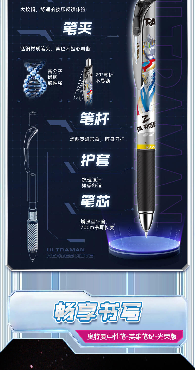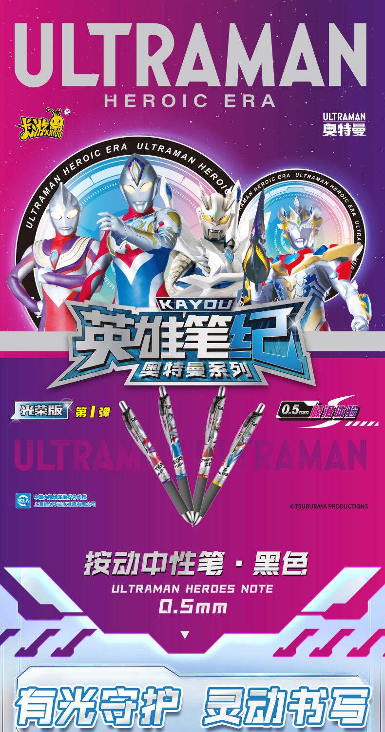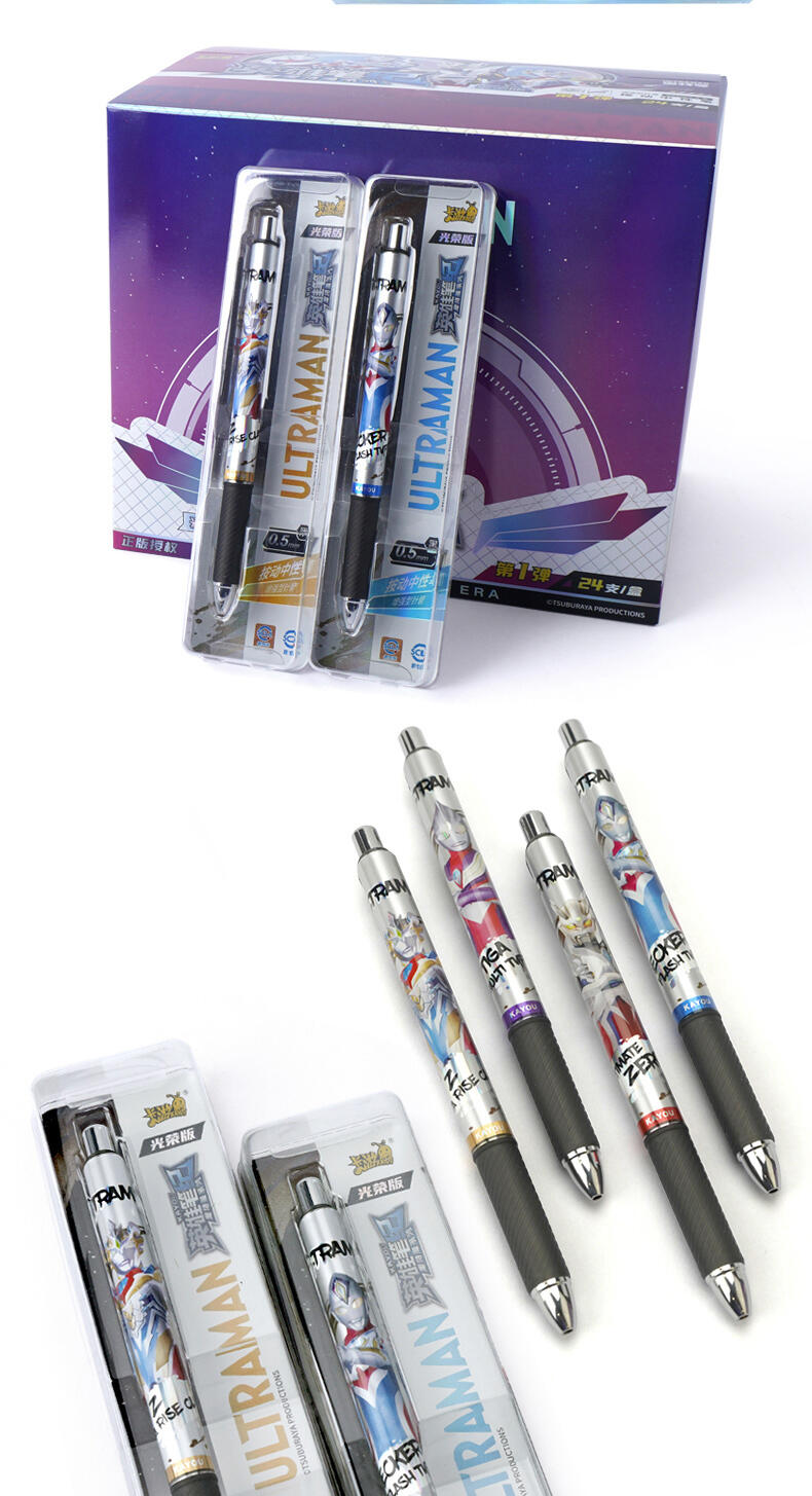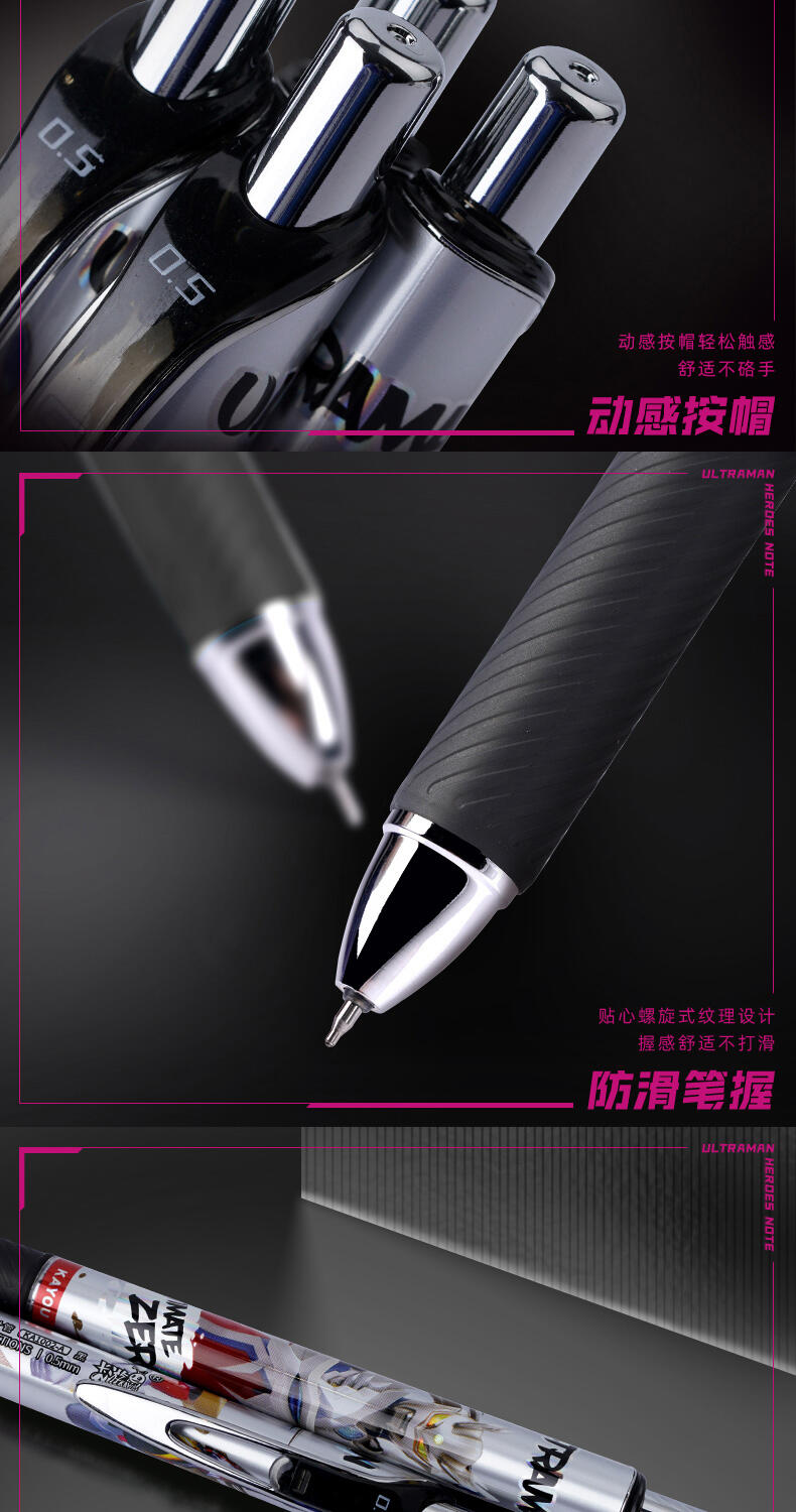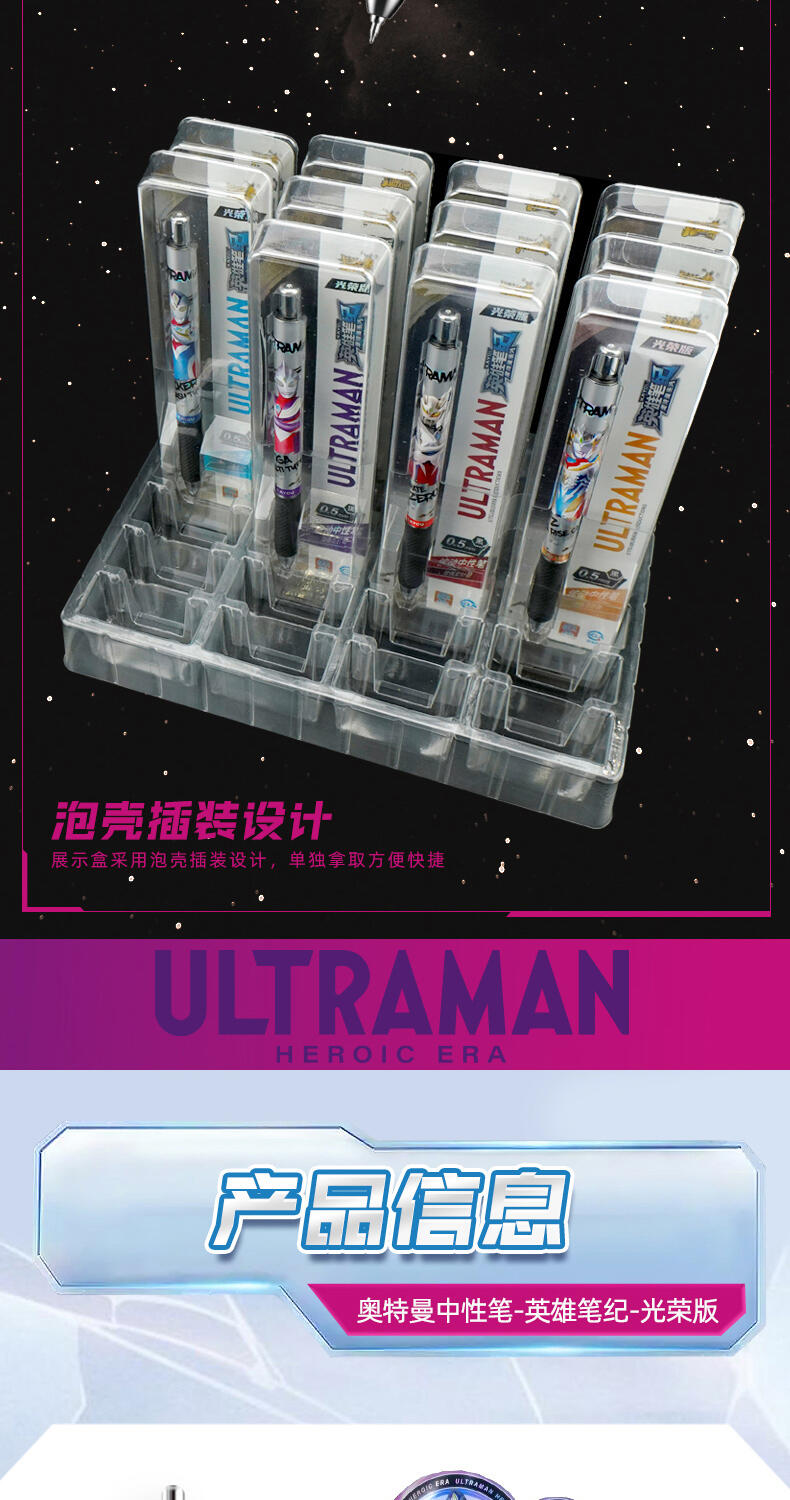 明盒设计,直观展示产品人物与形态;明盒奥特曼人物选定高人气奥特曼:德凯、迪迦、赛罗、泽塔;笔身采用特殊工艺,炫酷闪亮;笔芯选用增强型针管,书写顺滑,油墨速干;护套采用纹理设计,增强握感的舒适度