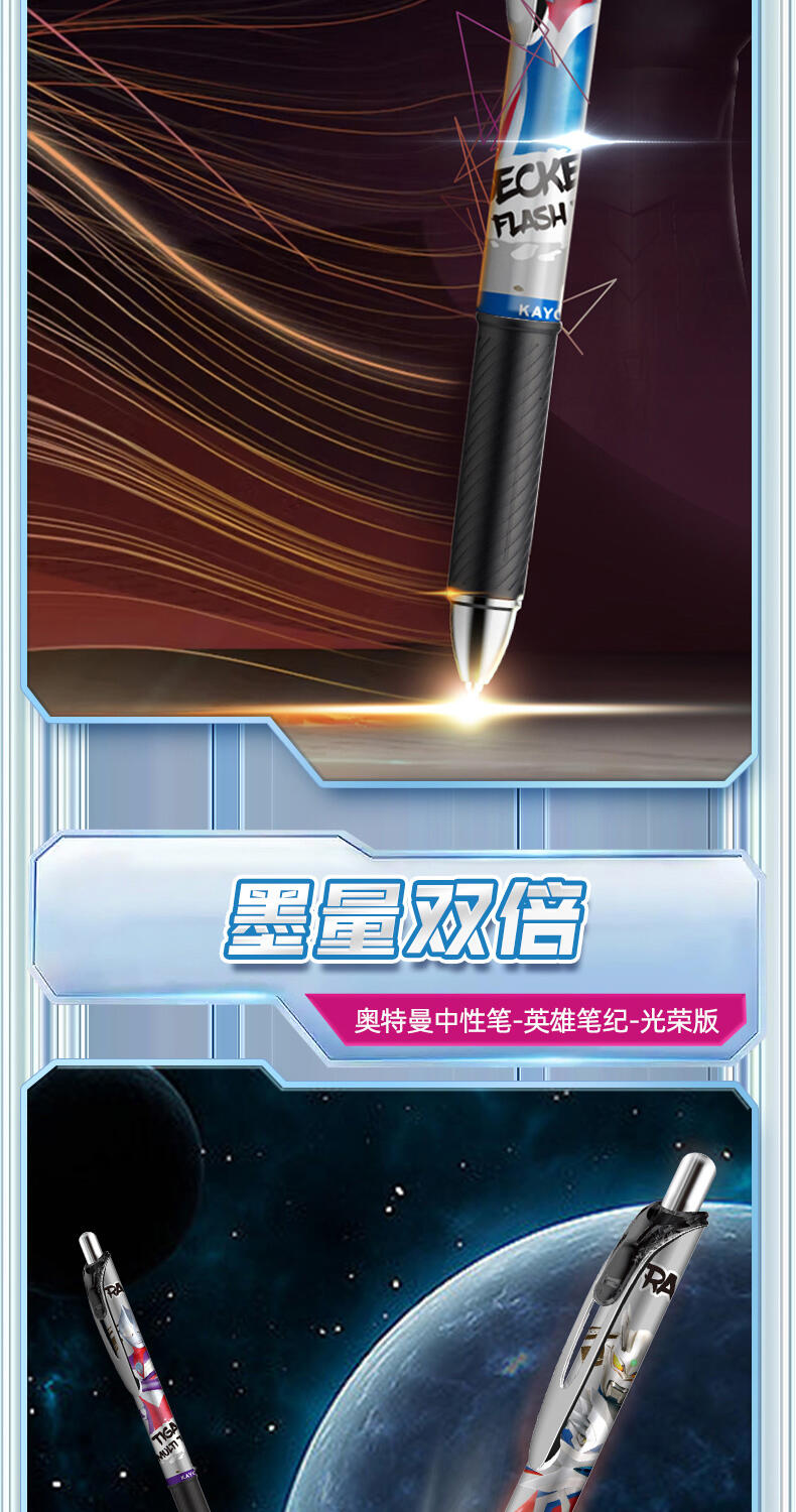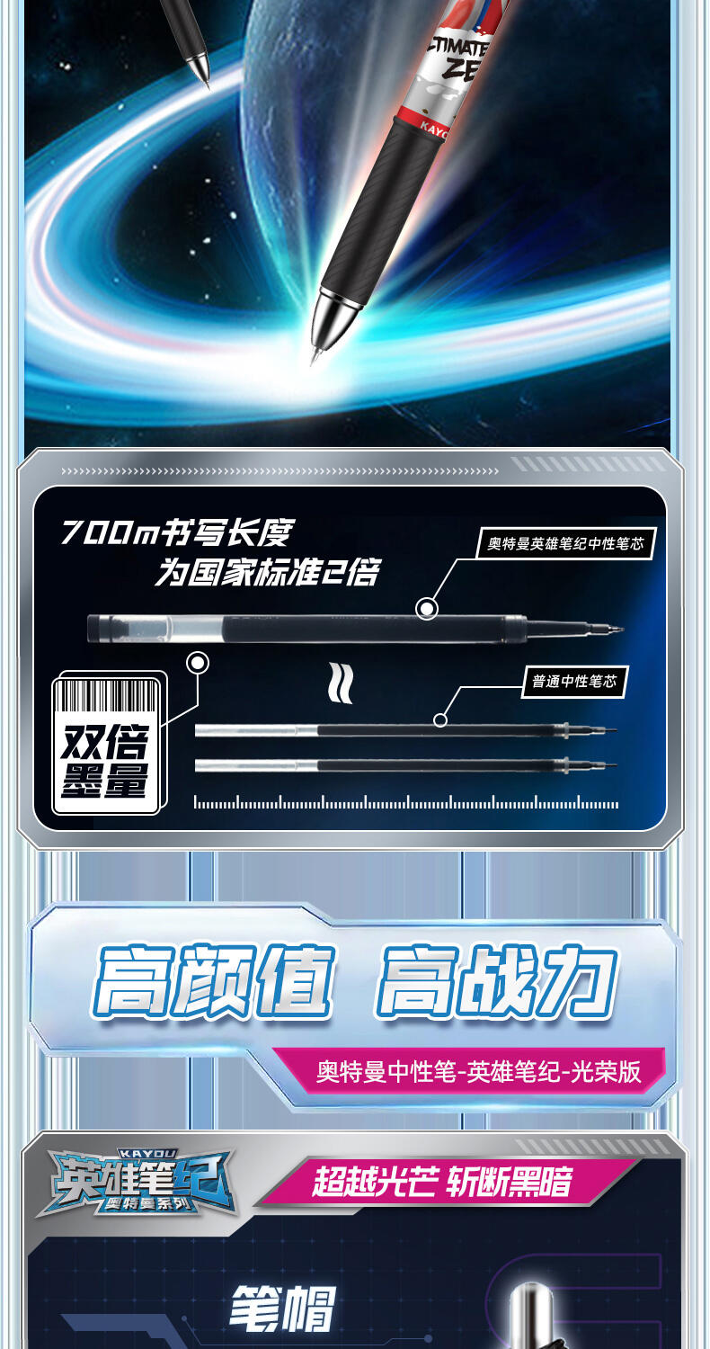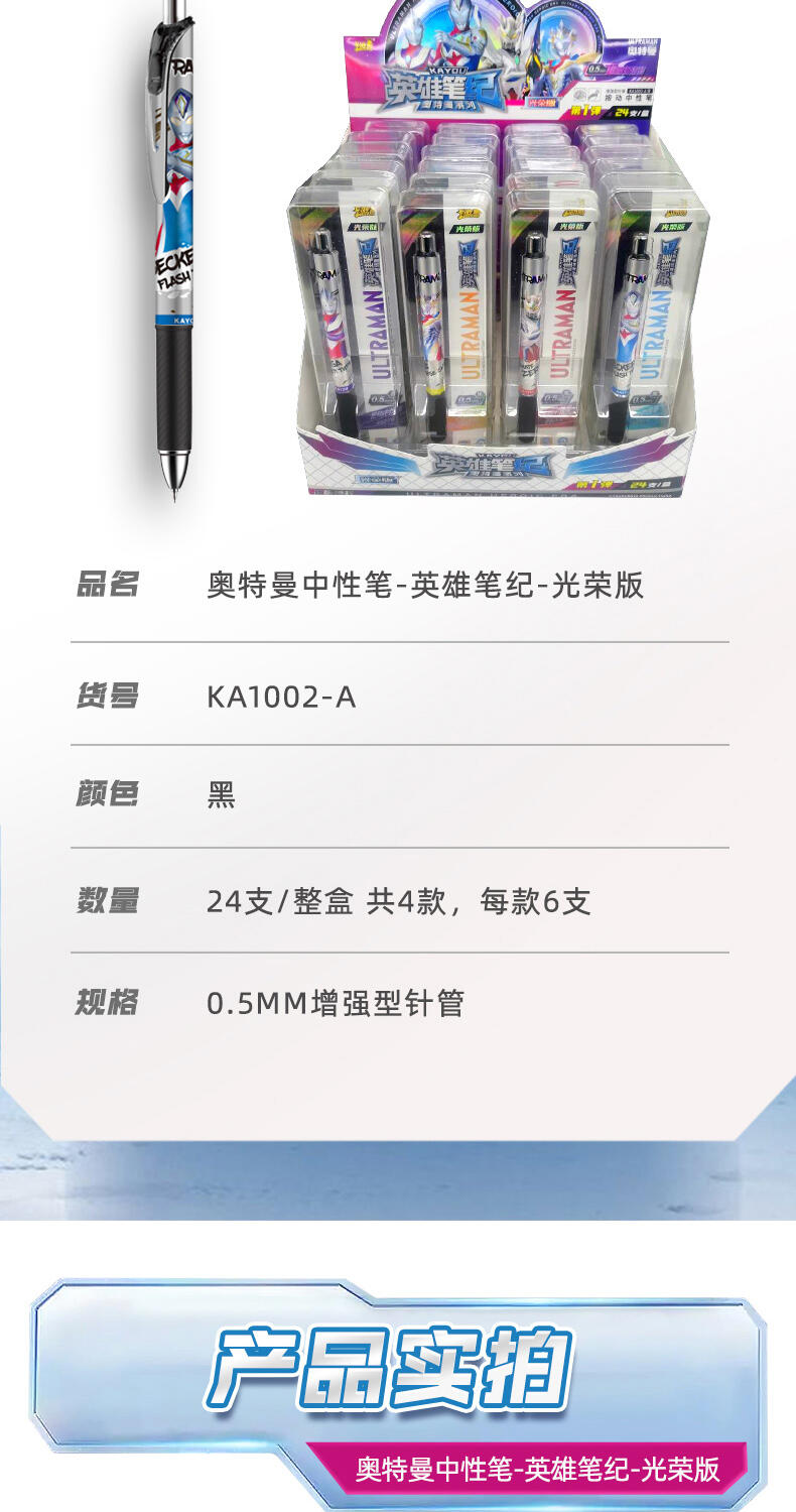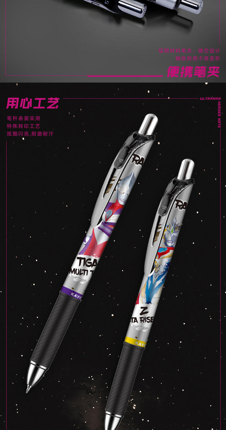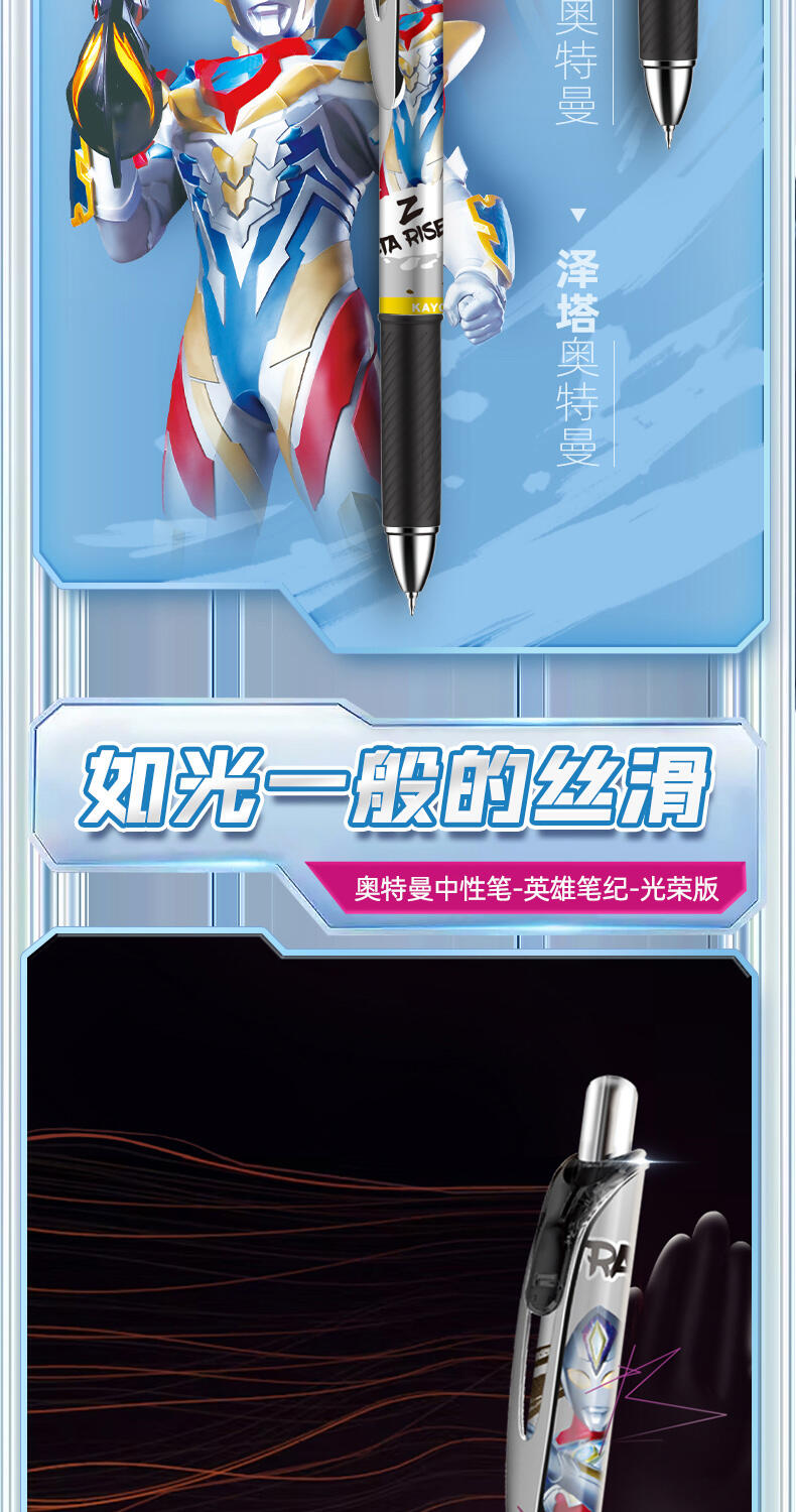 明盒设计,直观展示产品人物与形态;明盒奥特曼人物选定高人气奥特曼:德凯、迪迦、赛罗、泽塔;笔身采用特殊工艺,炫酷闪亮;笔芯选用增强型针管,书写顺滑,油墨速干;护套采用纹理设计,增强握感的舒适度