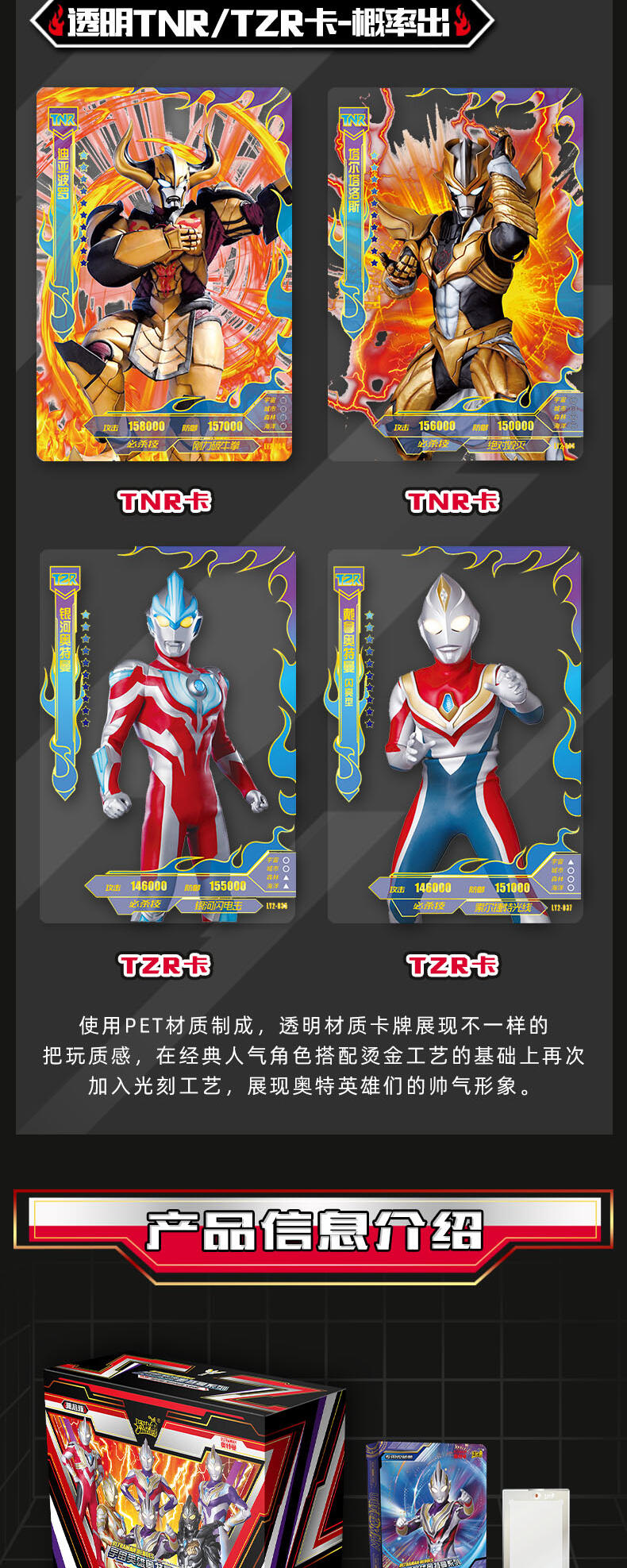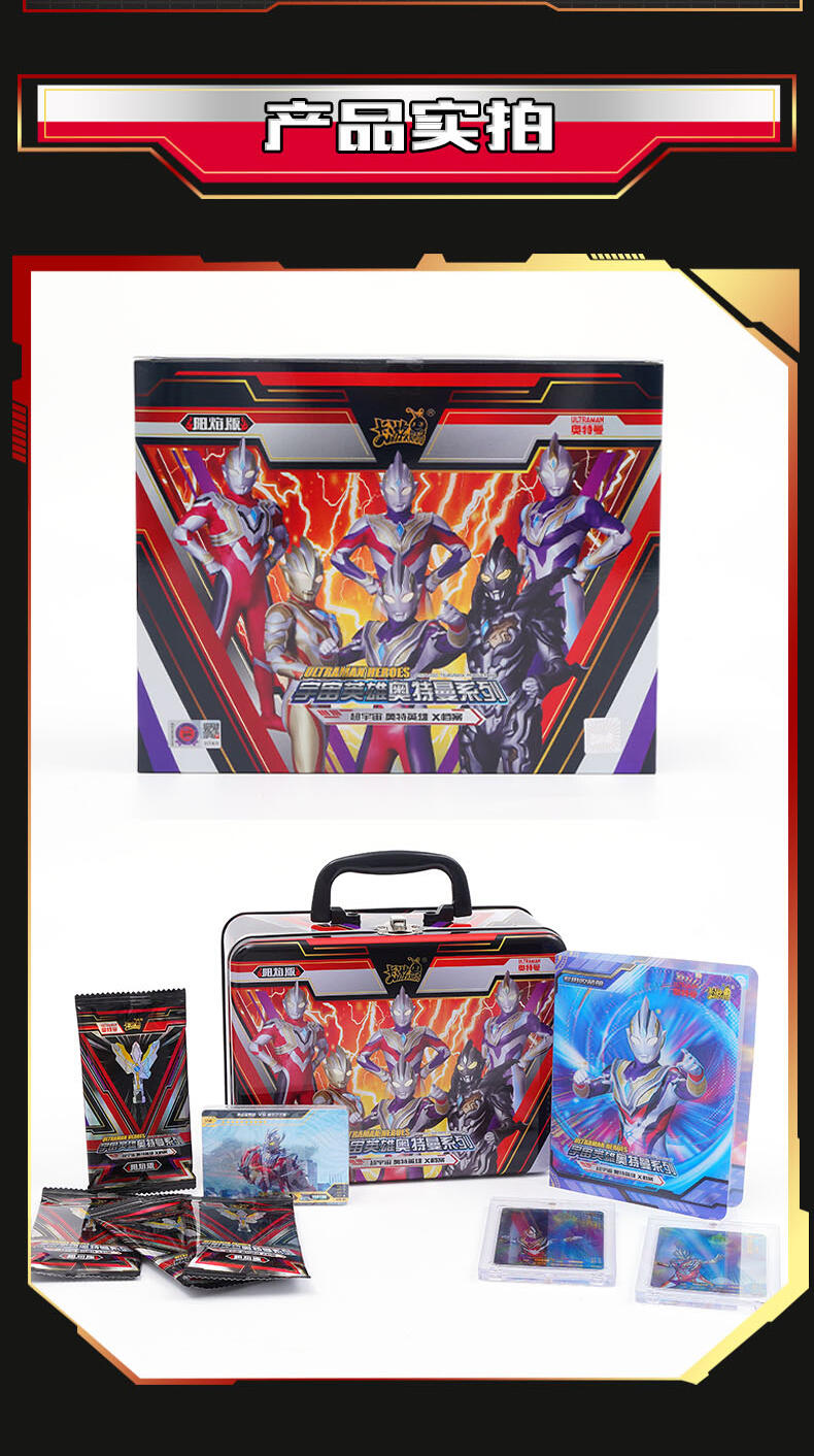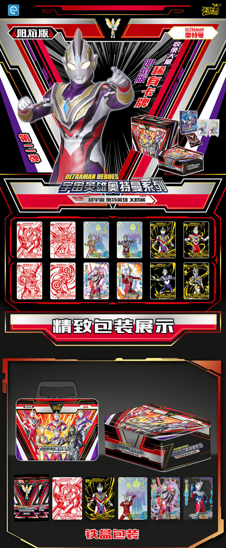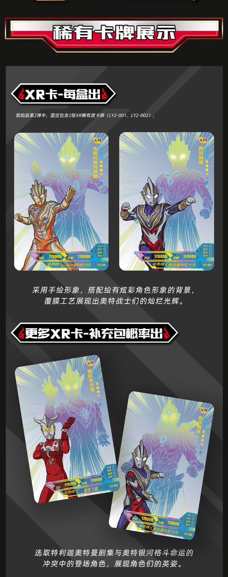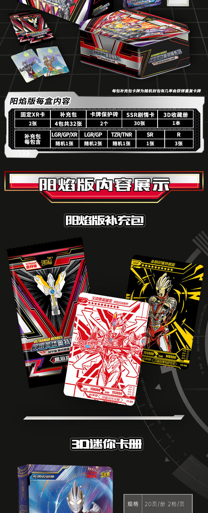 阳焰版采用豪华铁盒包装,包装上绘有特利迦奥特曼的多种形态以及黑暗特利迦的形象,铝箔袋上更加入了特利迦奥特曼的变身道具——胜利神光棒。阳焰版包含卡册、卡砖、高稀有度卡牌等超丰富内容。阳焰版-第2弹每套包含2张固定XR卡牌、30张固定剧情卡、4包卡牌、2个卡砖、1本卡册。