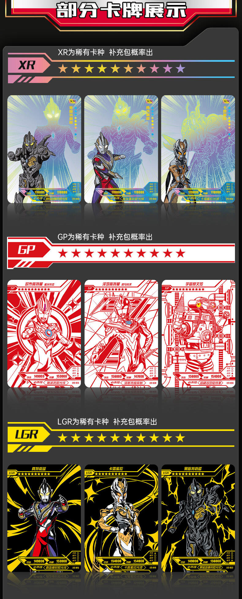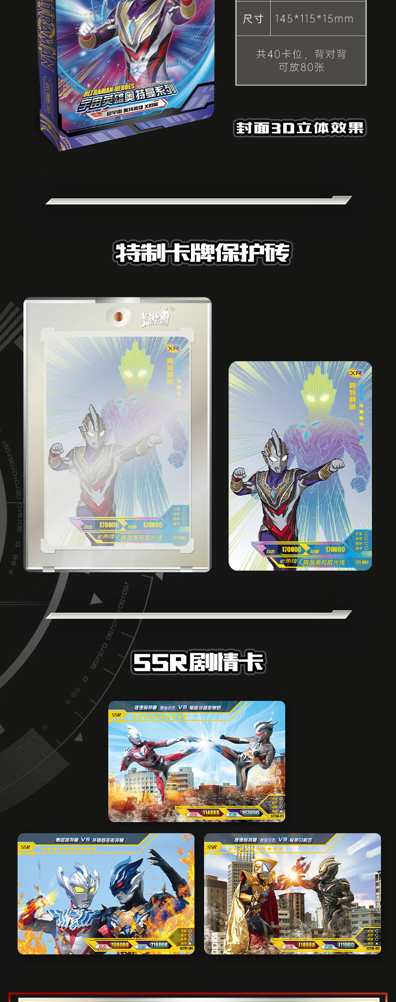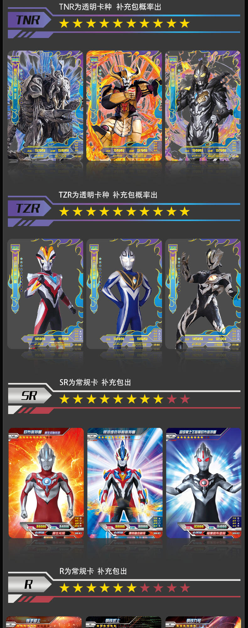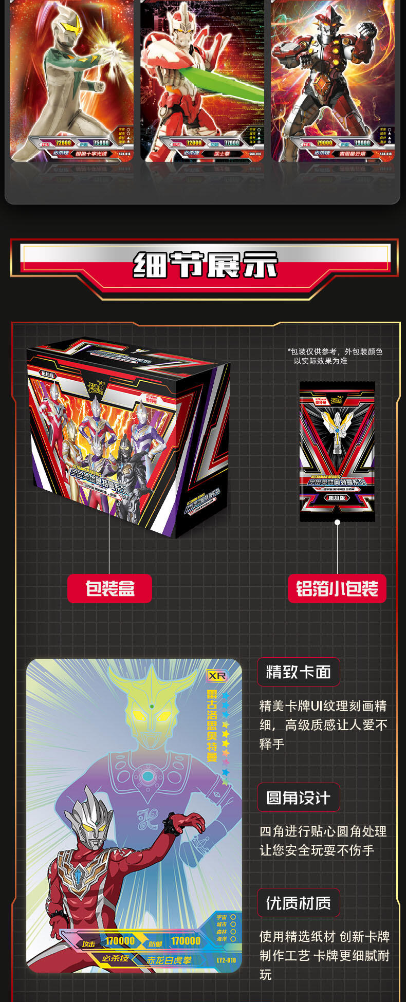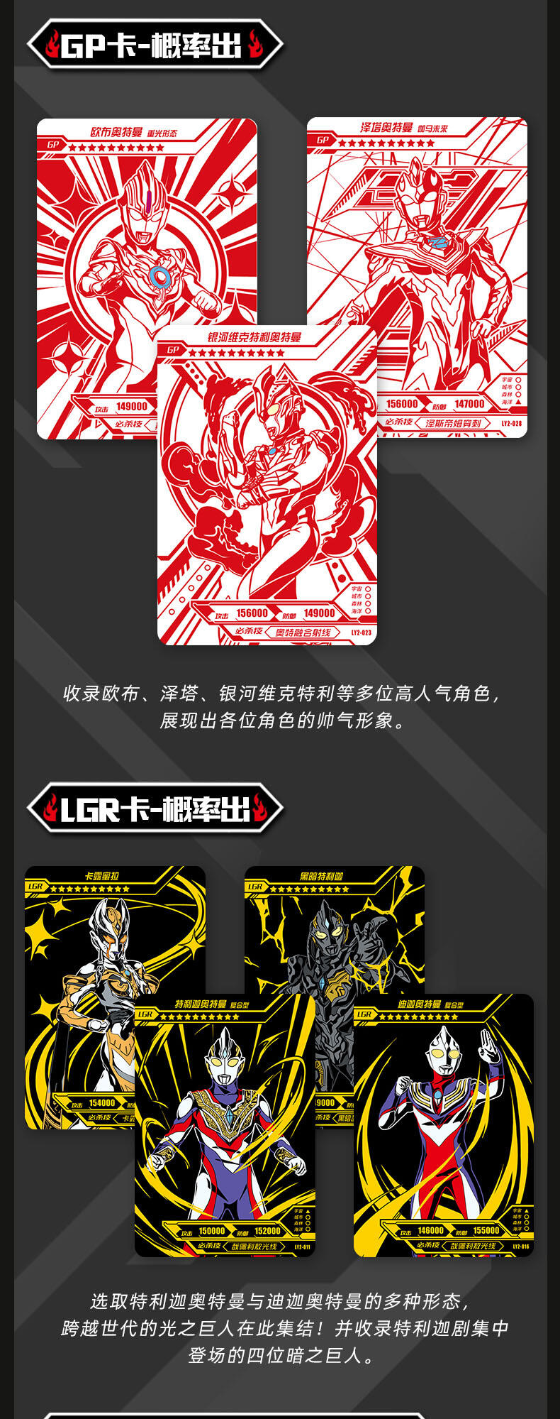 阳焰版采用豪华铁盒包装,包装上绘有特利迦奥特曼的多种形态以及黑暗特利迦的形象,铝箔袋上更加入了特利迦奥特曼的变身道具——胜利神光棒。阳焰版包含卡册、卡砖、高稀有度卡牌等超丰富内容。阳焰版-第2弹每套包含2张固定XR卡牌、30张固定剧情卡、4包卡牌、2个卡砖、1本卡册。
