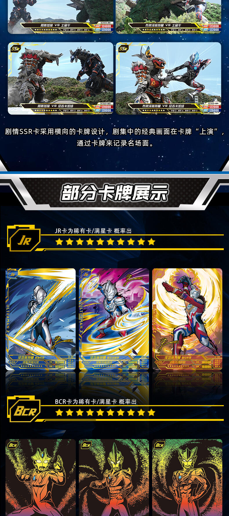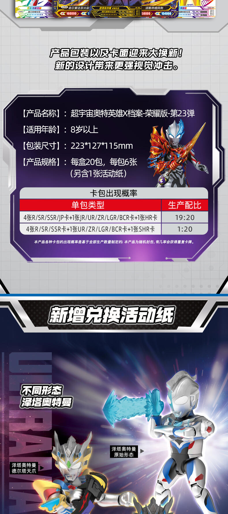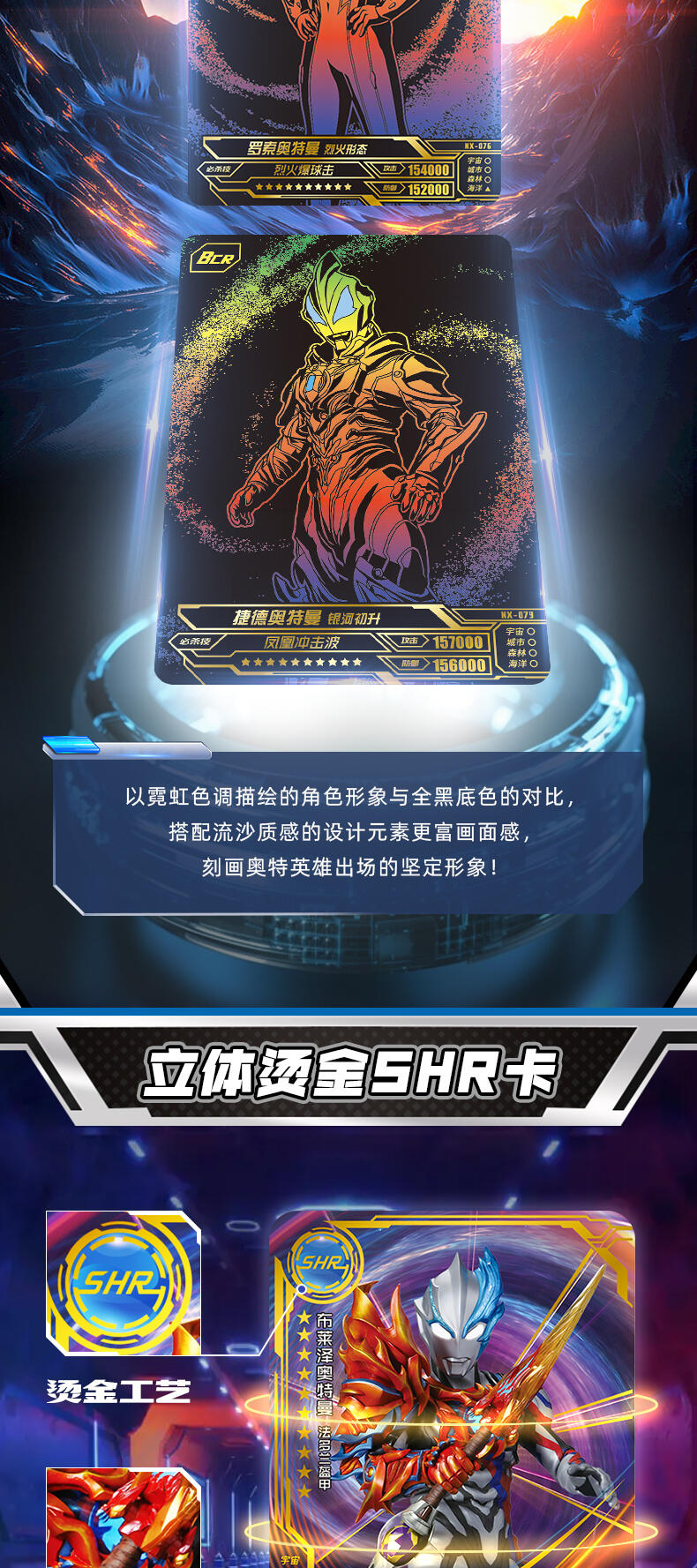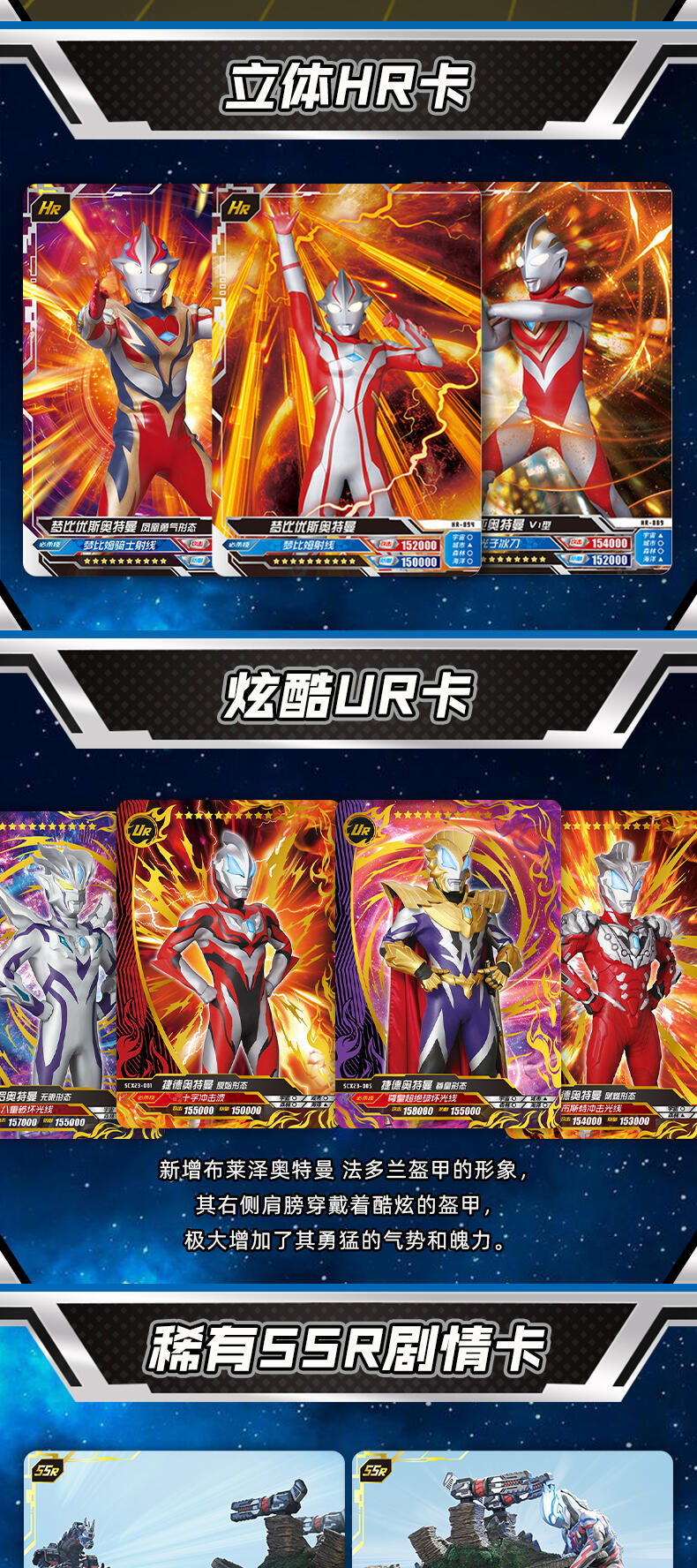 增加JR稀有度卡牌,将泽塔奥特曼 原始形态在内的5种形 态的帅气战斗造型收录在内。全新加入的布莱泽奥特曼 法多兰盔甲酷 炫形象,收录在SHR、UR等稀有度卡牌中。其中SHR卡的3D视觉效 果和充满未来感的边框设计,金色特效光芒环绕在角色身旁,生动形 象的呈现奥特英雄的战斗英姿。而且布莱泽奥特曼的故事仍在持续进 行,在荣耀版第23弹剧情卡SSR中“上演”。