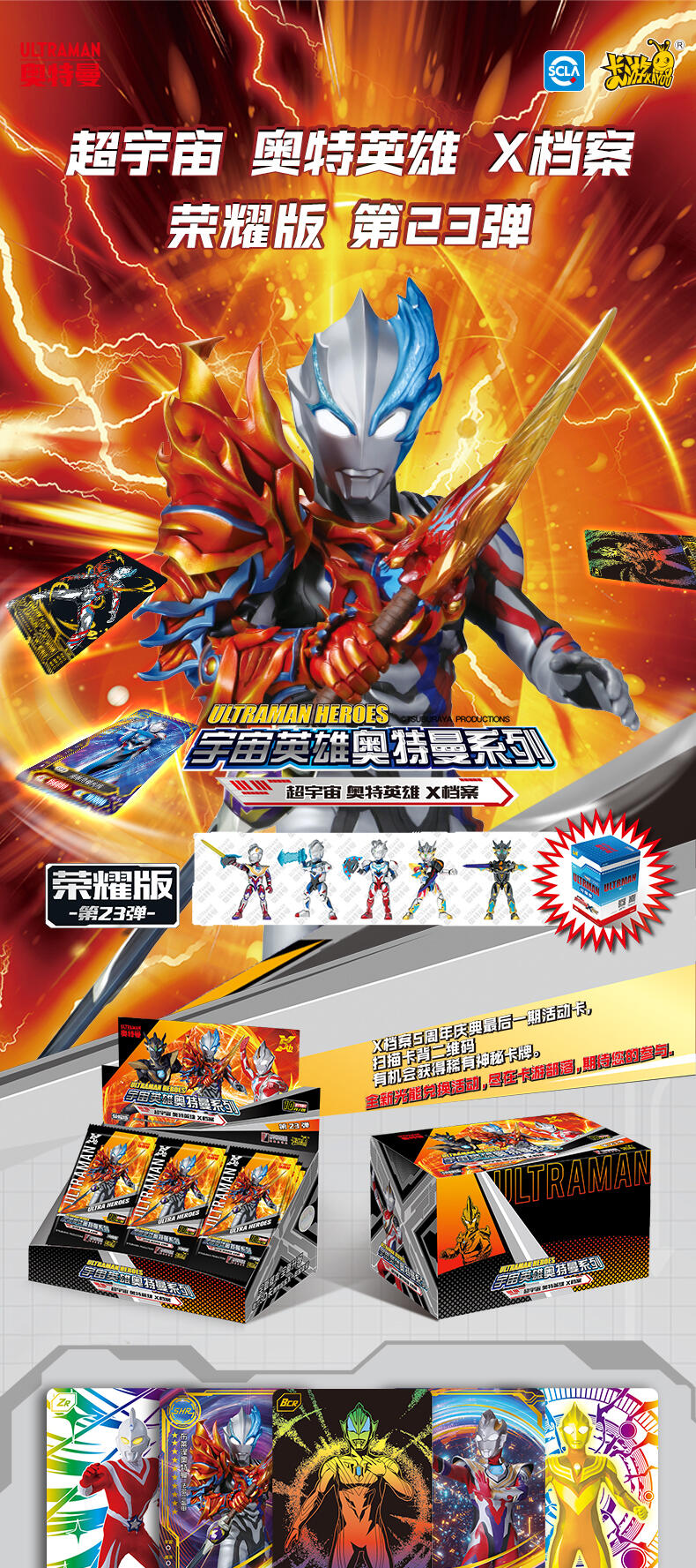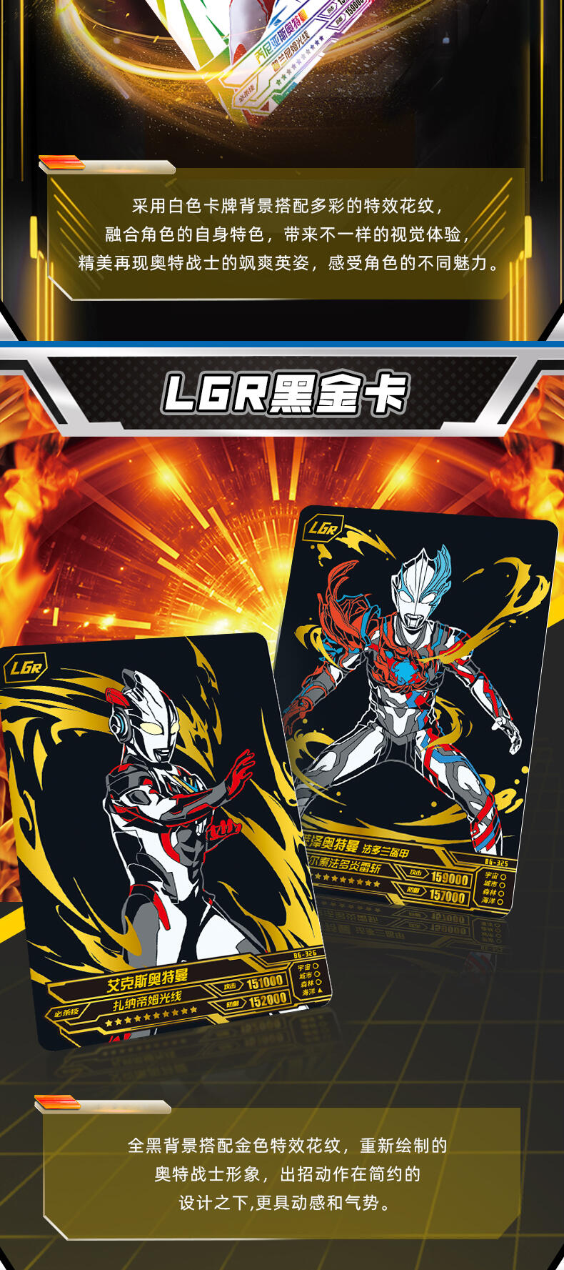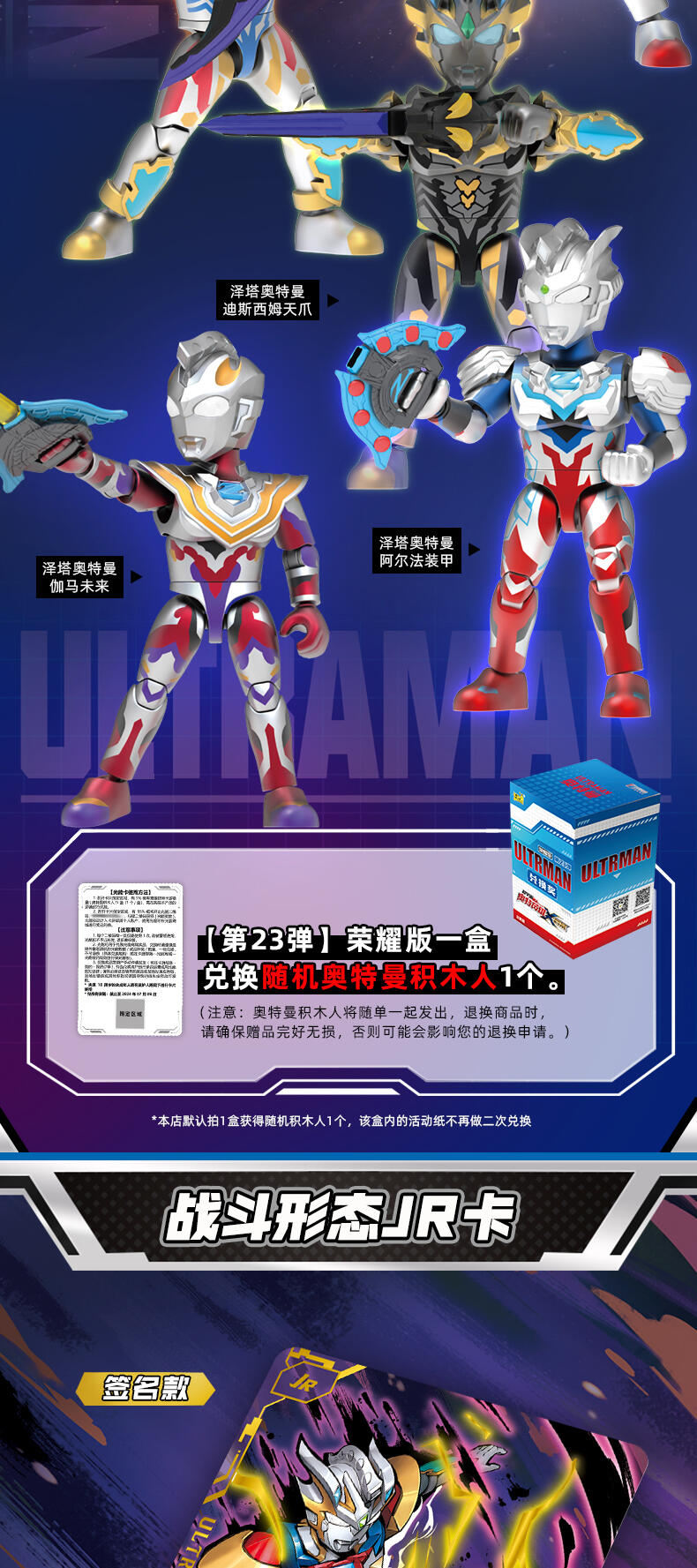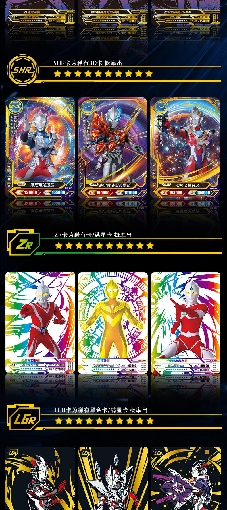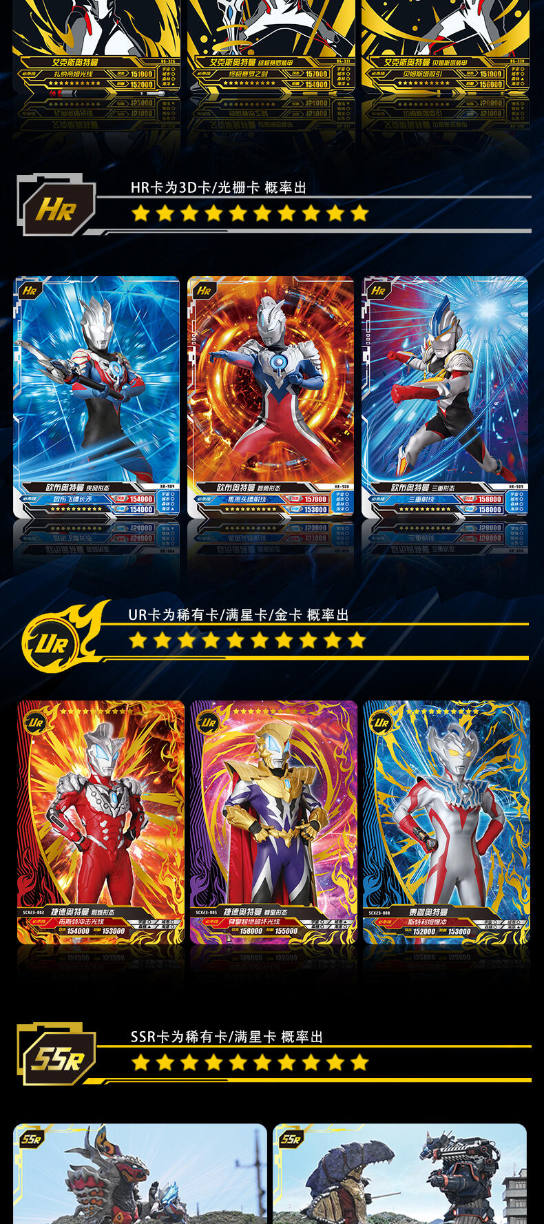 增加JR稀有度卡牌,将泽塔奥特曼 原始形态在内的5种形 态的帅气战斗造型收录在内。全新加入的布莱泽奥特曼 法多兰盔甲酷 炫形象,收录在SHR、UR等稀有度卡牌中。其中SHR卡的3D视觉效 果和充满未来感的边框设计,金色特效光芒环绕在角色身旁,生动形 象的呈现奥特英雄的战斗英姿。而且布莱泽奥特曼的故事仍在持续进 行,在荣耀版第23弹剧情卡SSR中“上演”。