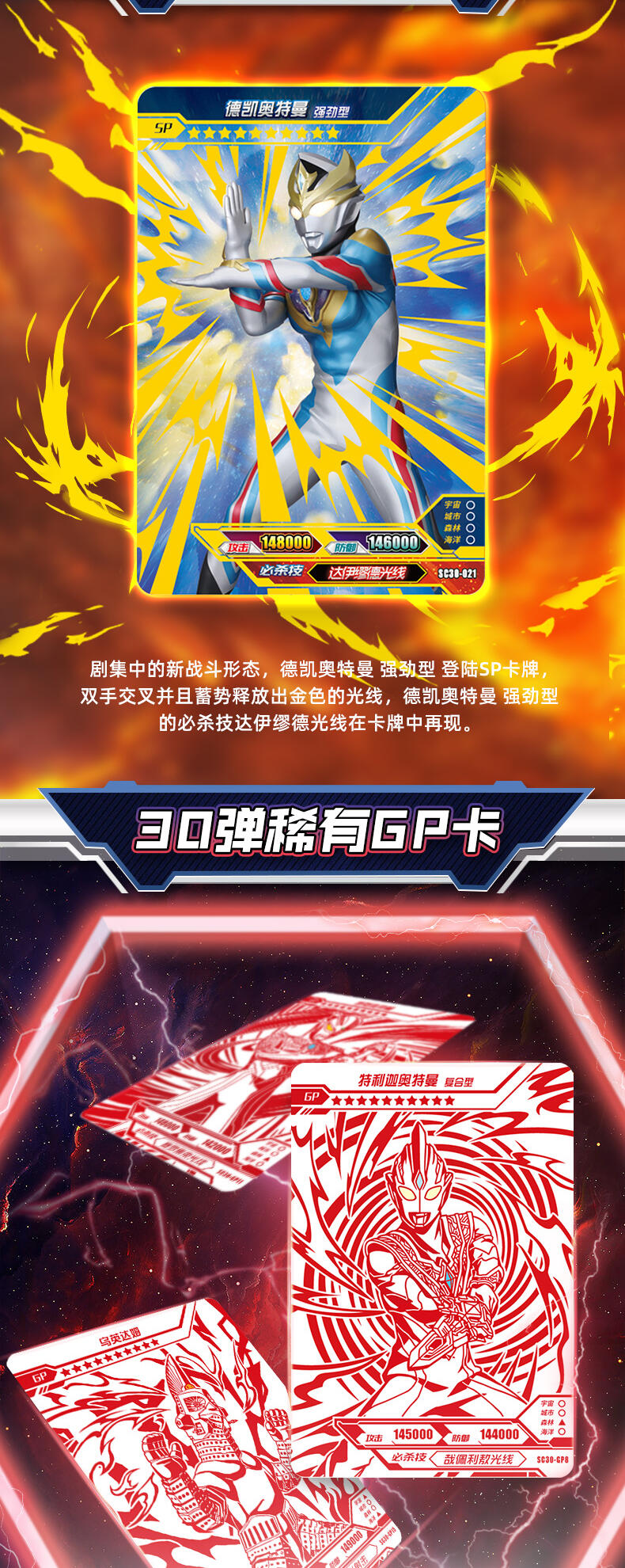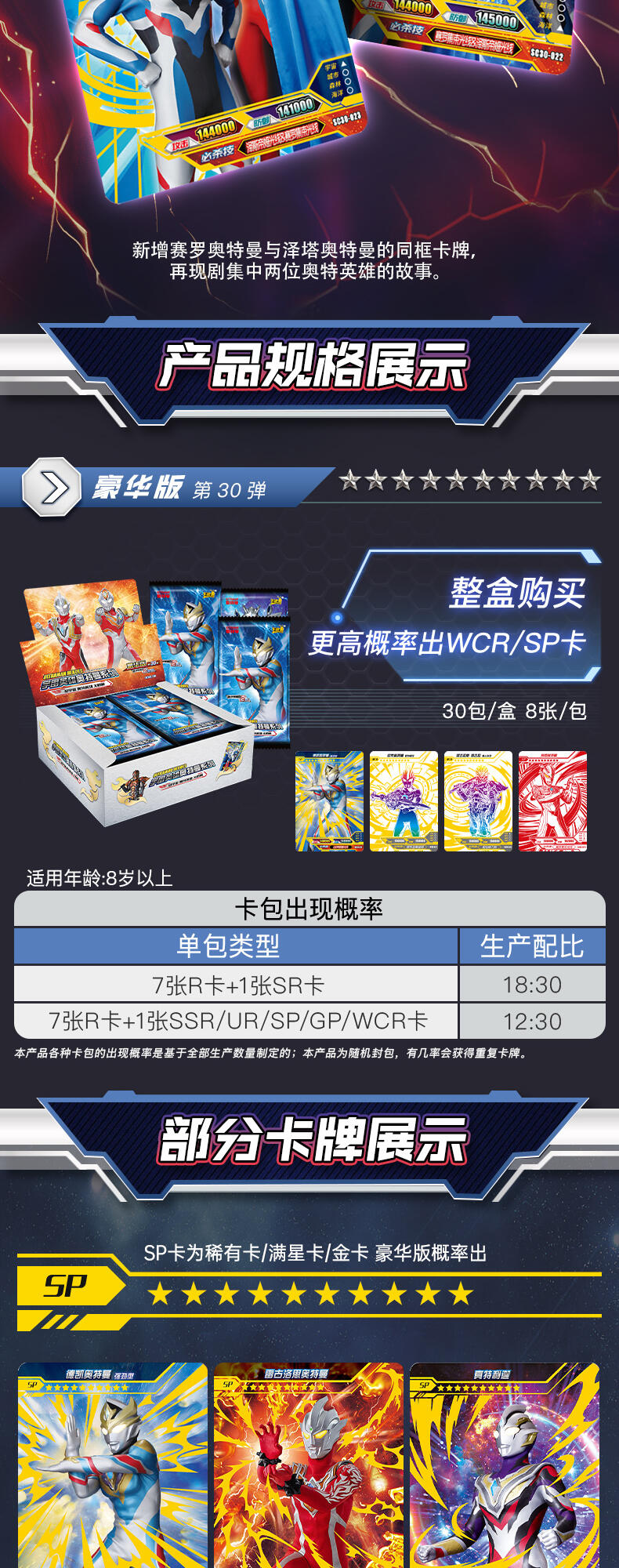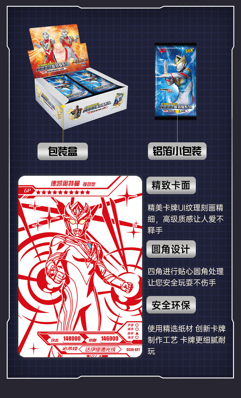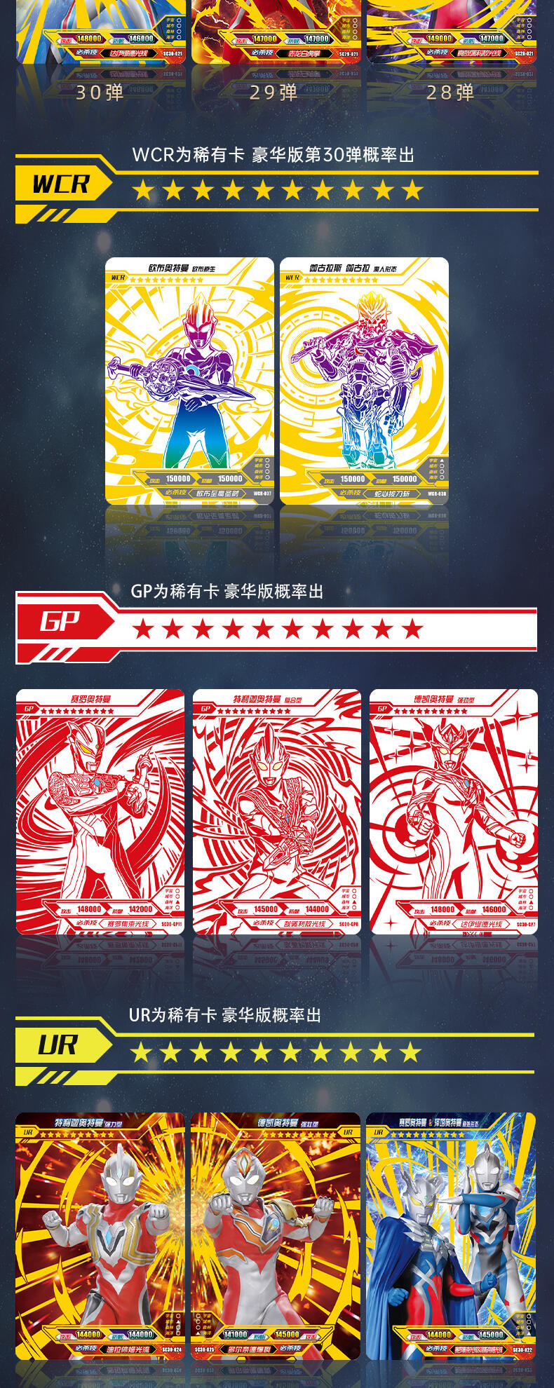 7张为R卡,1张为随机SR/SSR/UR/SP/GP/WCR卡。在豪华版第30弹中主打的SP卡牌收录德凯奥特曼在剧集中登场的最新形态——德凯奥特曼 强劲型,记录其施展必杀技达伊缪德光线的经典造型。 GP卡牌包含了特利迦奥特曼的多种形态与贝利亚奥特曼,奥特战士和反派的激烈战斗再次上演! UR卡中新增了赛罗奥特曼与泽塔奥特曼的同框卡牌,再现剧集中两位奥特英雄的故事