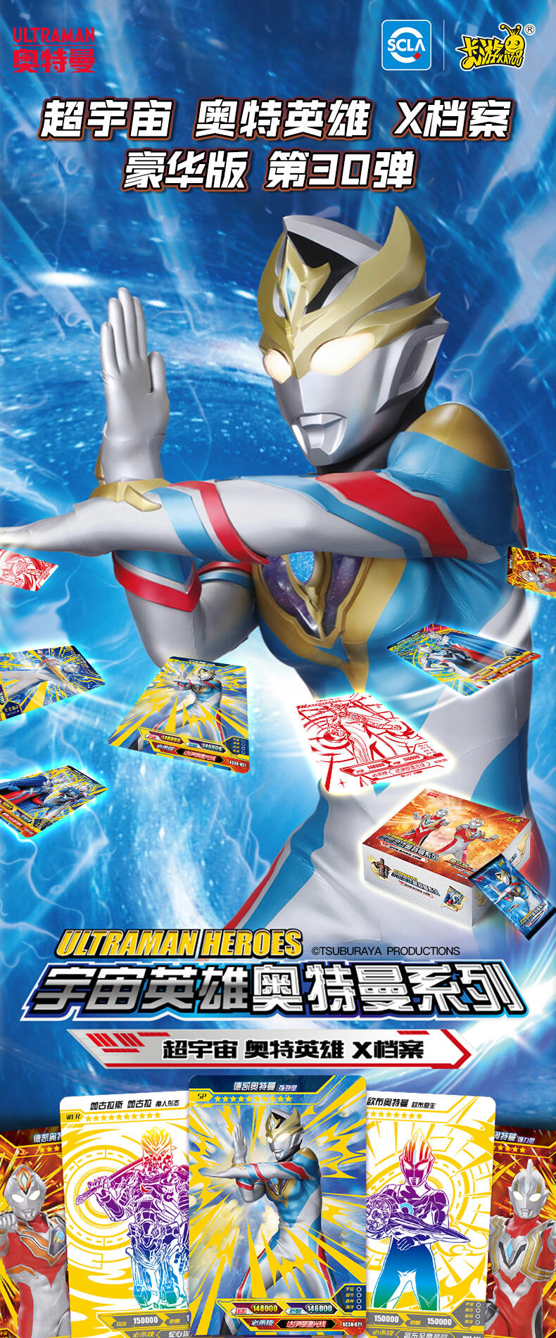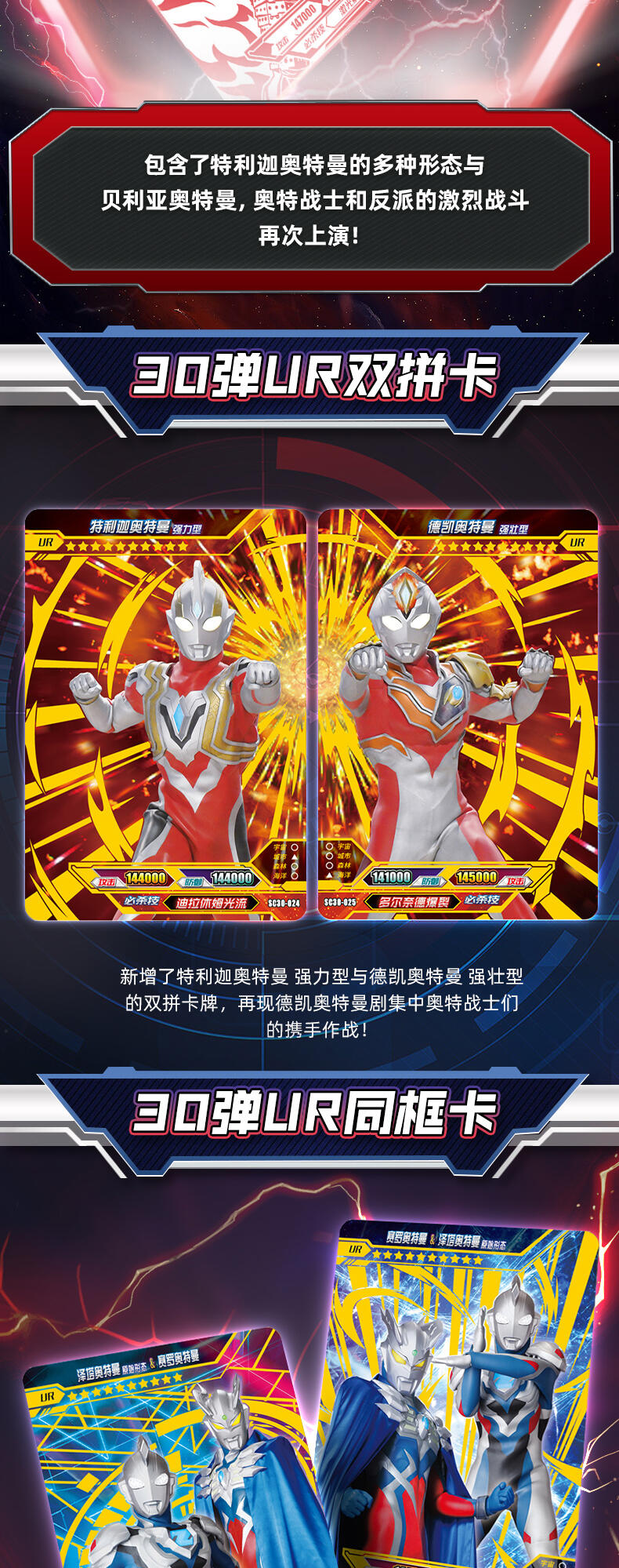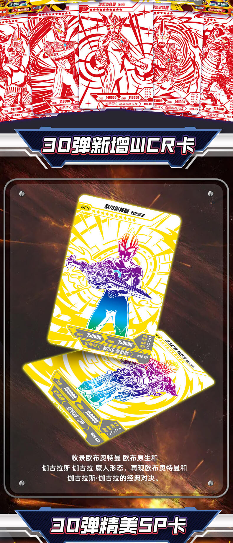 7张为R卡,1张为随机SR/SSR/UR/SP/GP/WCR卡。在豪华版第30弹中主打的SP卡牌收录德凯奥特曼在剧集中登场的最新形态——德凯奥特曼 强劲型,记录其施展必杀技达伊缪德光线的经典造型。 GP卡牌包含了特利迦奥特曼的多种形态与贝利亚奥特曼,奥特战士和反派的激烈战斗再次上演! UR卡中新增了赛罗奥特曼与泽塔奥特曼的同框卡牌,再现剧集中两位奥特英雄的故事