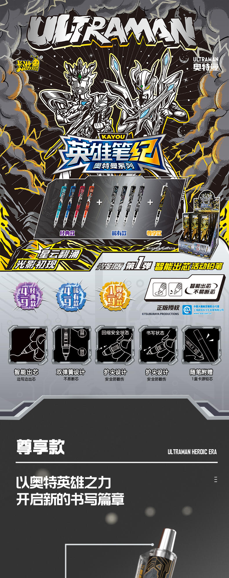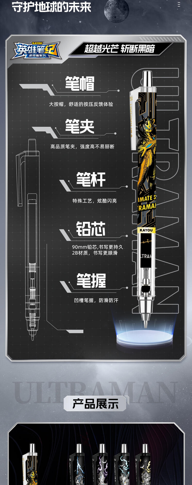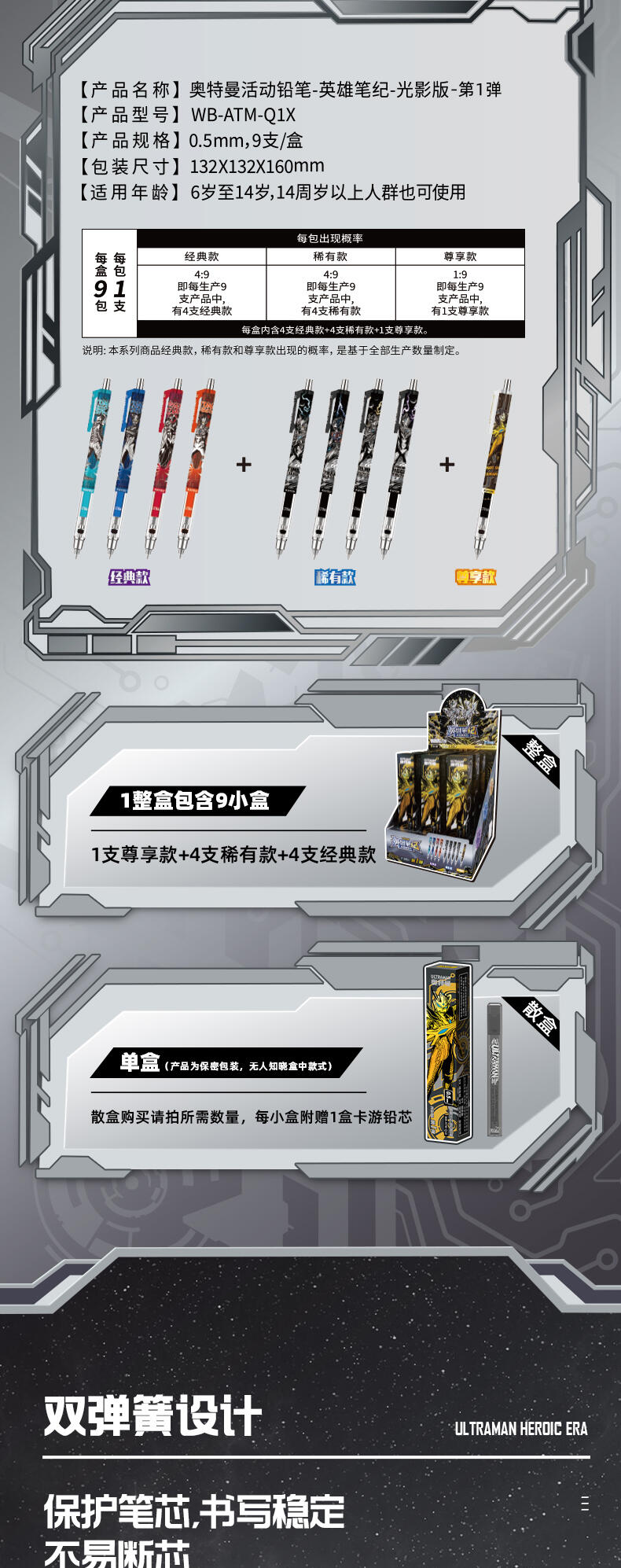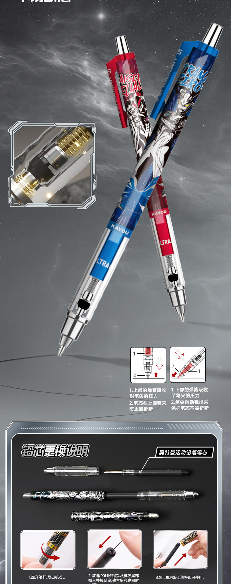 每小盒含活动铅笔一支,活动铅芯一盒,说明书签1个,笔杆采用特殊工艺,酷炫闪亮,按帽按动手感舒适,90MM铅芯,书写更持久,2B材质,书写更顺滑,双弹簧设计不易断芯,护尖设计,安全防戳伤,智能出芯,边写边出芯,凹槽笔握,防滑防汗