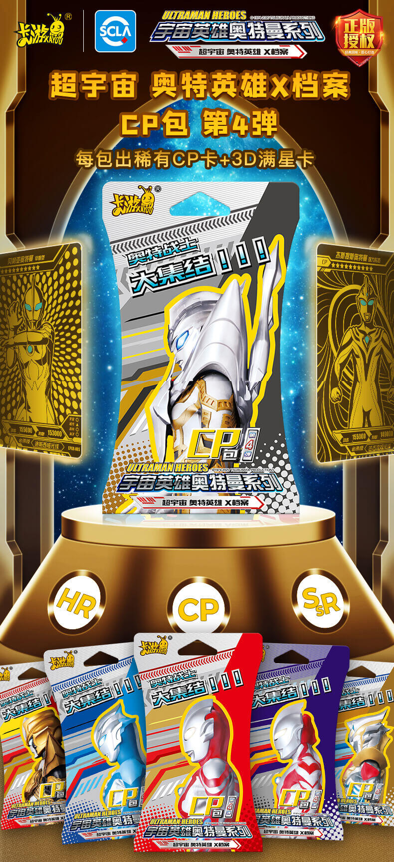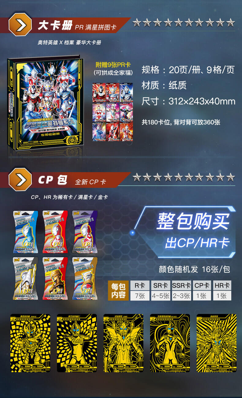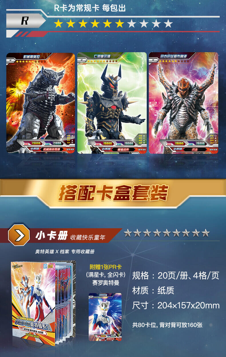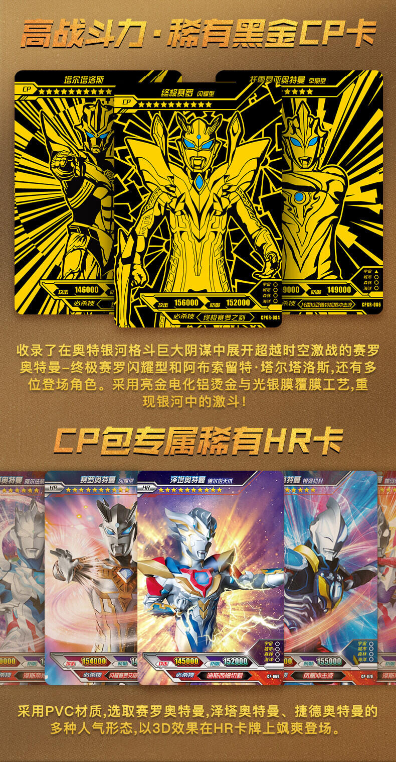 奥特英雄 X 档案奥特曼卡片包 ,奥特战士大集结。采用PVC材质,选取塞罗奥特曼,塔泽奥特曼,捷德奥特曼的多种人气形态,以3D效果在HR卡牌上飒爽登场。