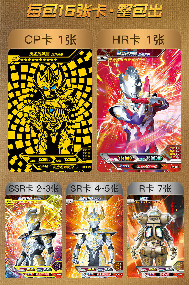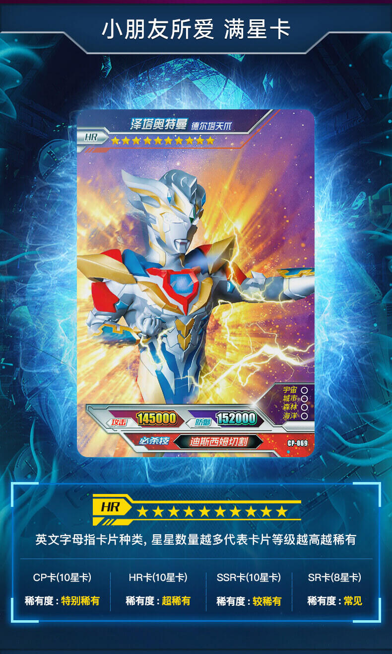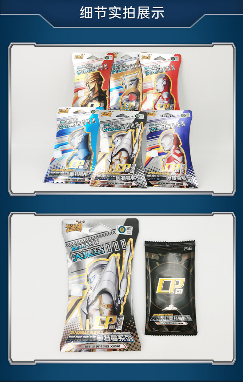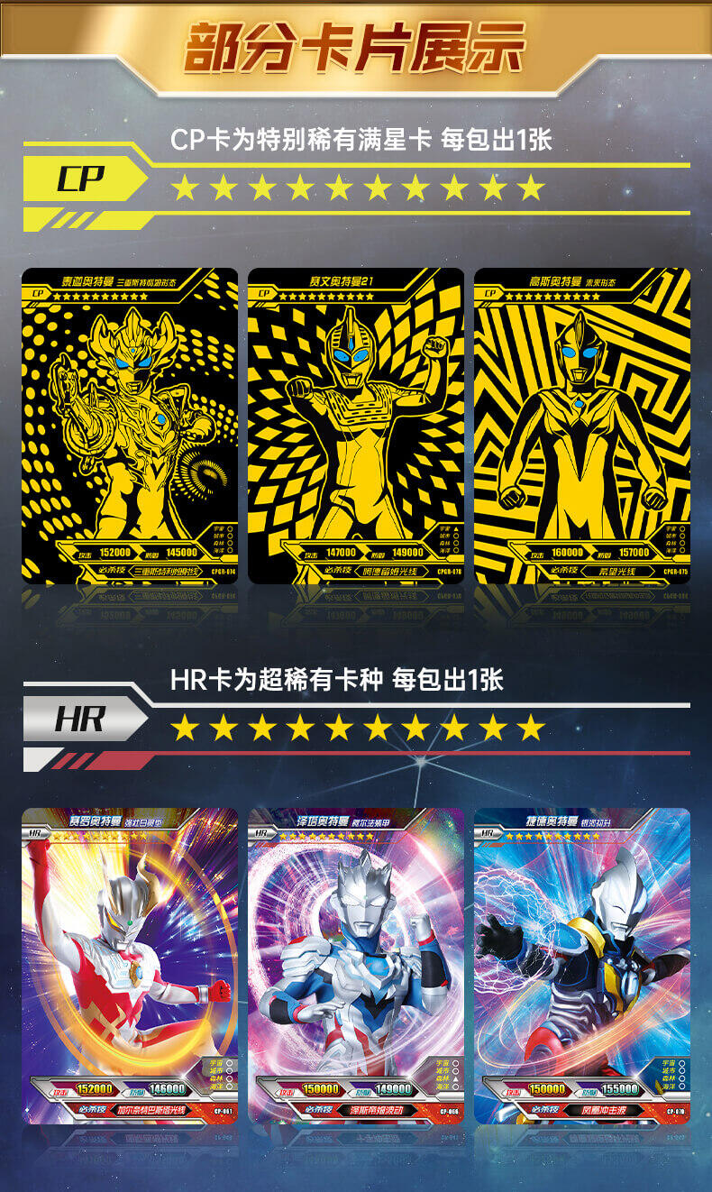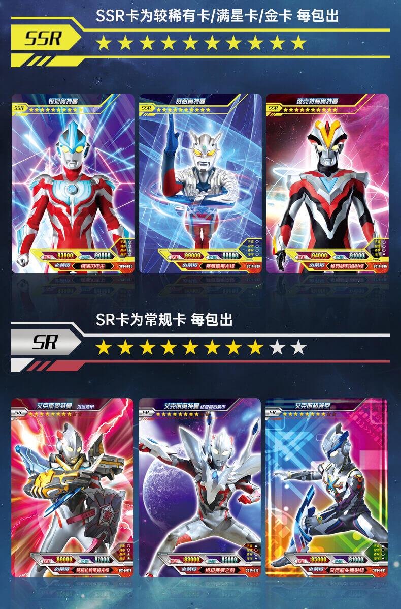 奥特英雄 X 档案奥特曼卡片包 ,奥特战士大集结。采用PVC材质,选取塞罗奥特曼,塔泽奥特曼,捷德奥特曼的多种人气形态,以3D效果在HR卡牌上飒爽登场。