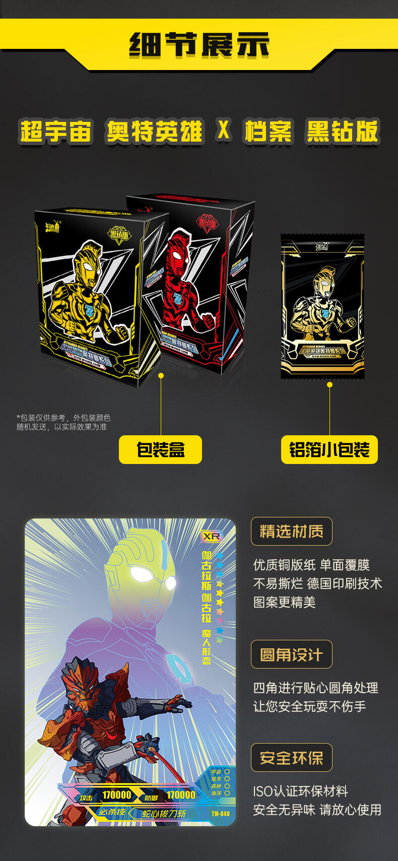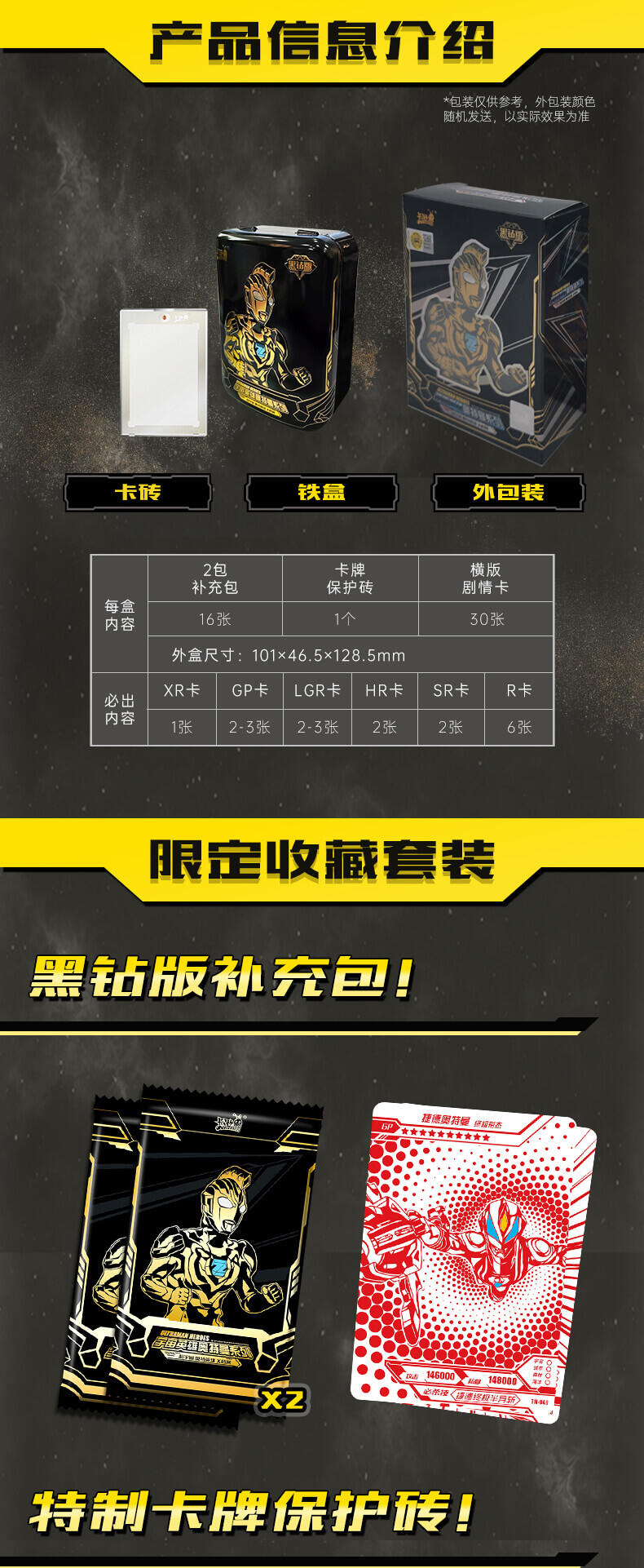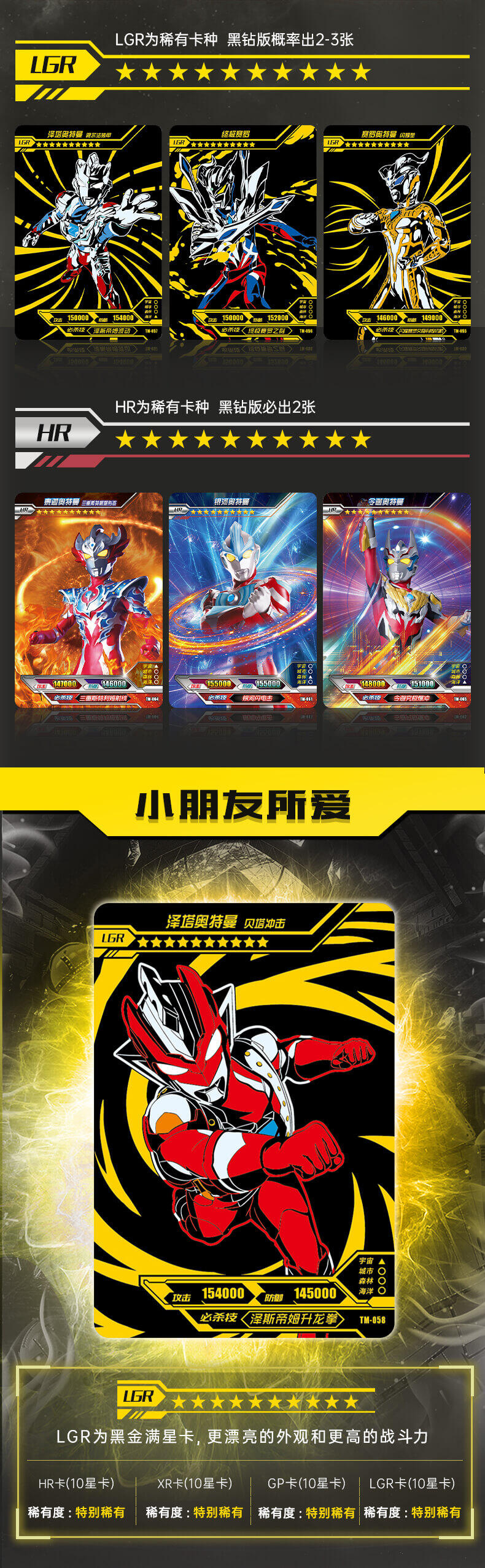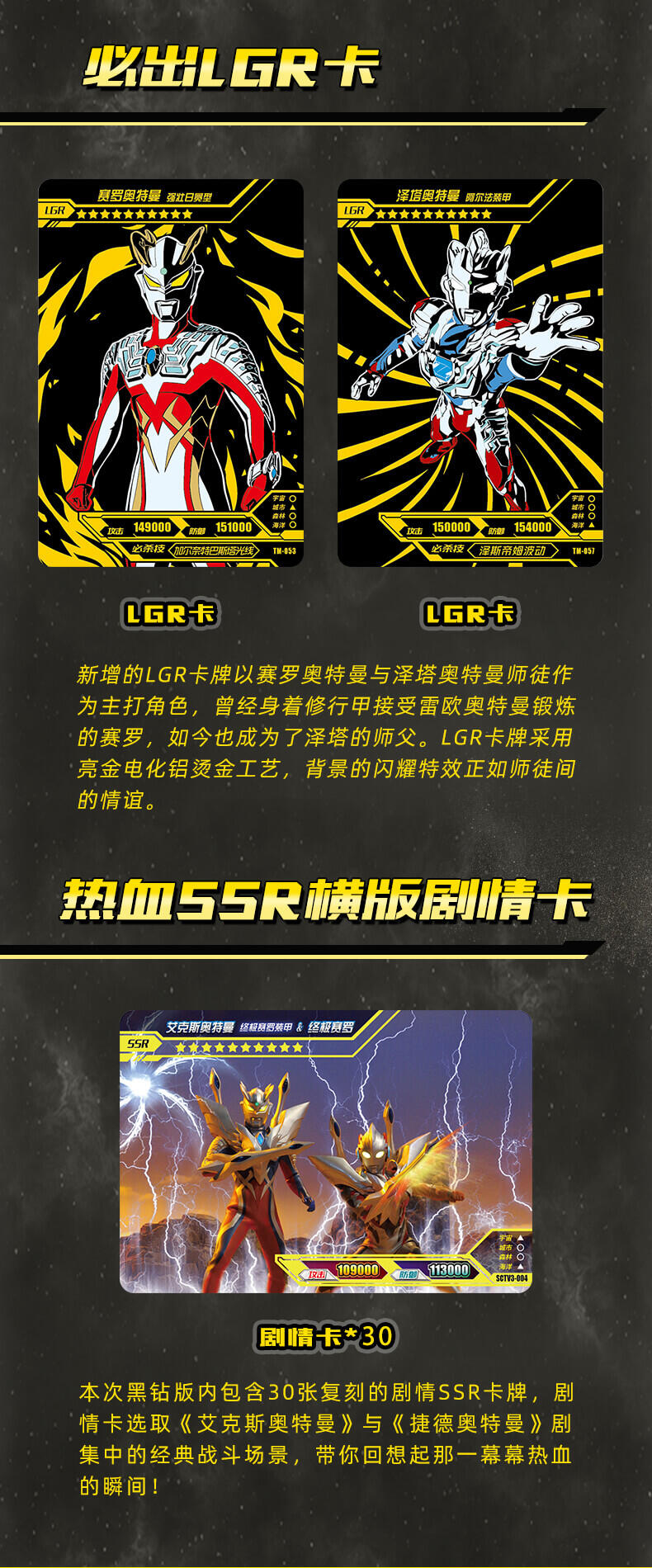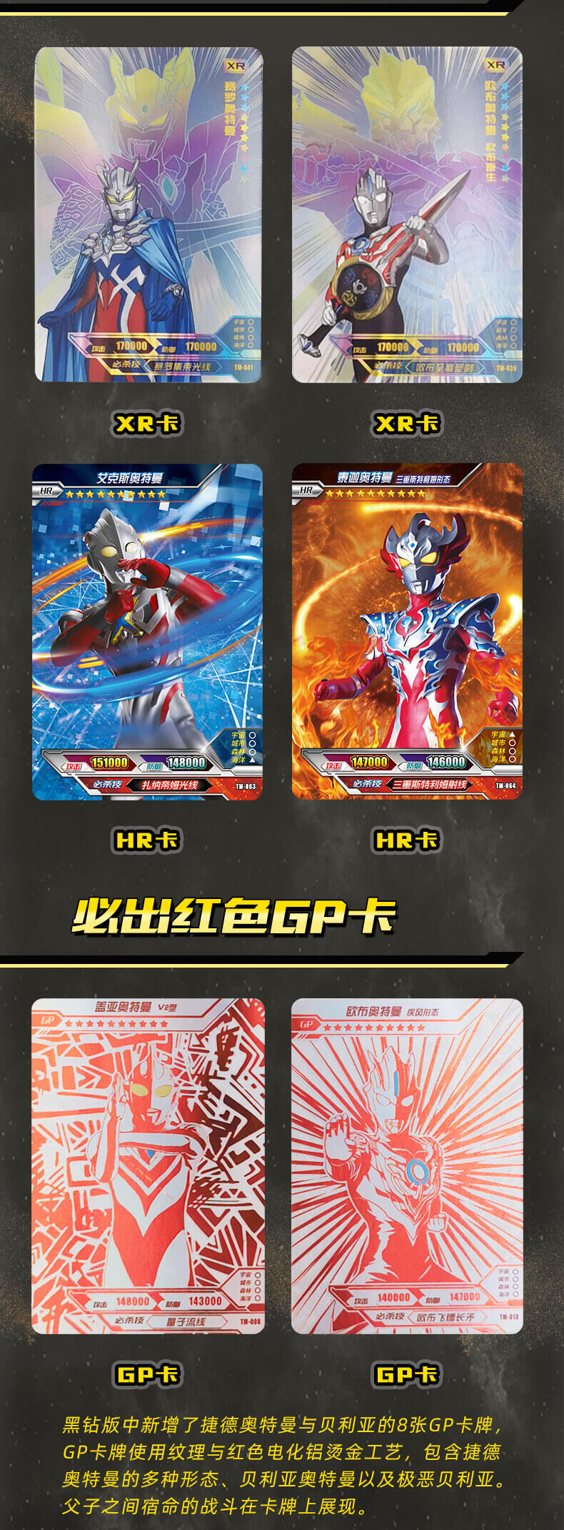 黑钻版中新增了捷德奥特曼与贝利亚的8张GP卡牌,GP卡牌使用纹理与红色电化铝烫金工艺,包含捷德奥特曼的多种形态,贝利亚奥特曼以及及恶贝利亚。父子之间宿命的战斗在卡牌上展现。新增的LGR卡牌一赛罗奥特曼与泽塔奥特曼师徒作为主打角色,曾经身着修行甲接受雷欧奥特曼锻炼的塞罗,如今也成为了泽塔的师父。LGR卡牌采用亮金电化铝烫金工艺,北京的闪耀特效正如师徒间的情谊。